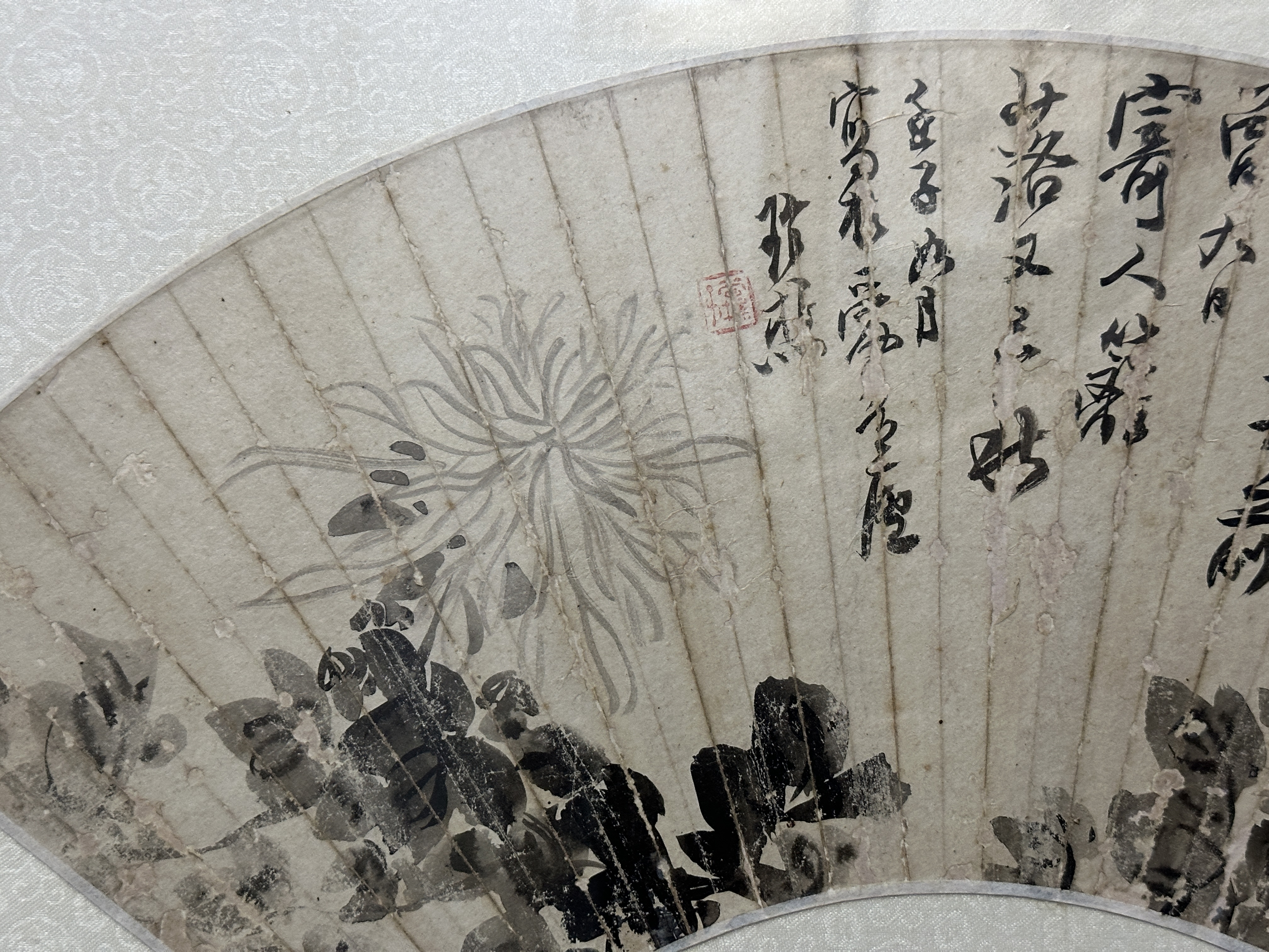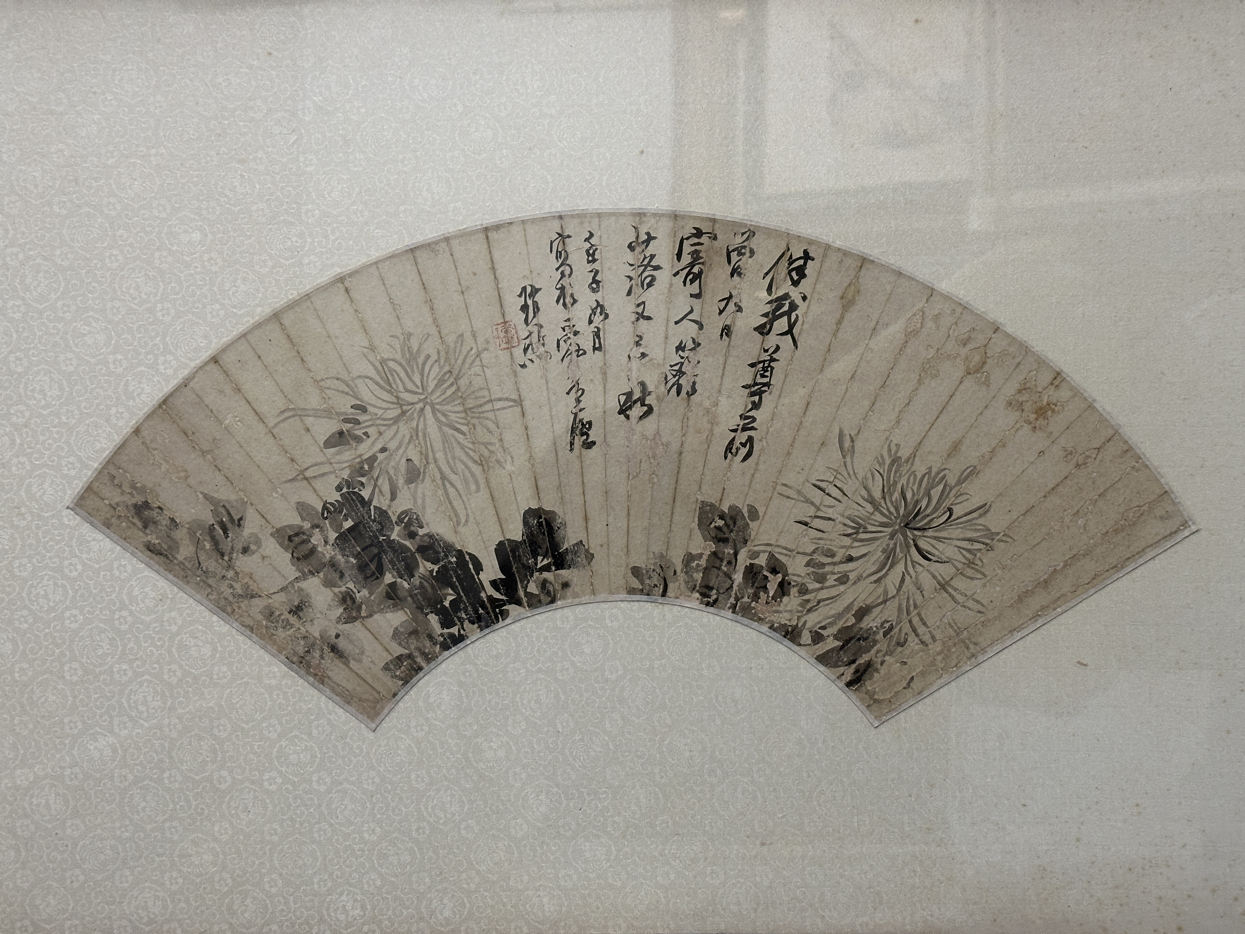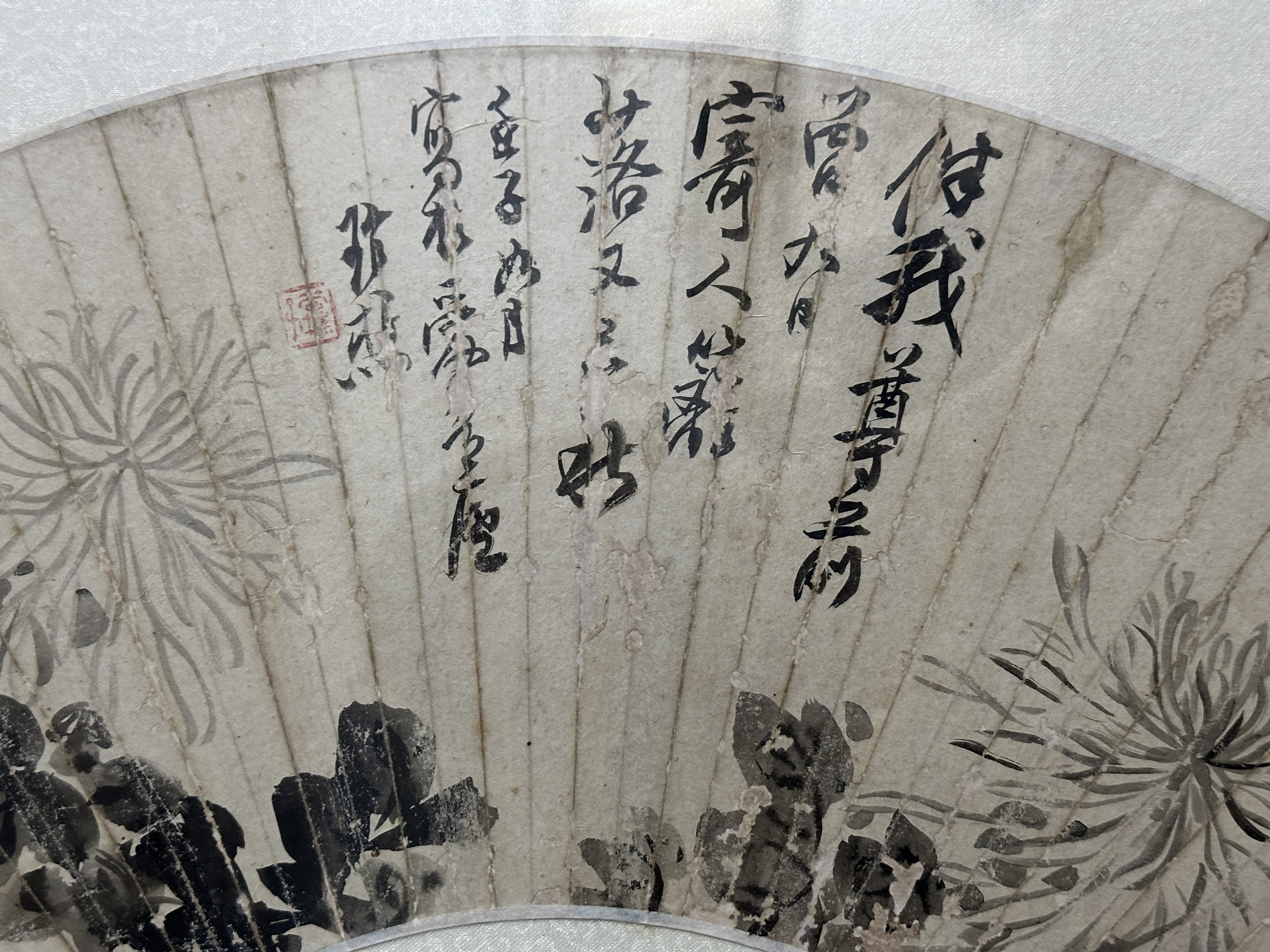 "中文說明:謝琯樵(1811-1864),原名謝穎蘇,清朝台灣畫家,與沈瑤池、汪志周等為創始人的""詔安畫派"",在中國美術界獨樹一幟,享有很高的聲譽。 ""詔安畫派""對台灣書畫藝術影響很大。最早將詔安書畫藝術帶到台灣的是謝穎蘇,因而被譽為""台灣美術的開山祖師""。謝穎蘇主張繪畫要有""神骨""、""氣""、""品""、""逸韻"",以達到""簡淡之致""。他的畫理,注重直逼鄭板橋的墨竹圖筆意、筆外神韻。此作品左右兩邊均繪有菊花,意境高潔。"