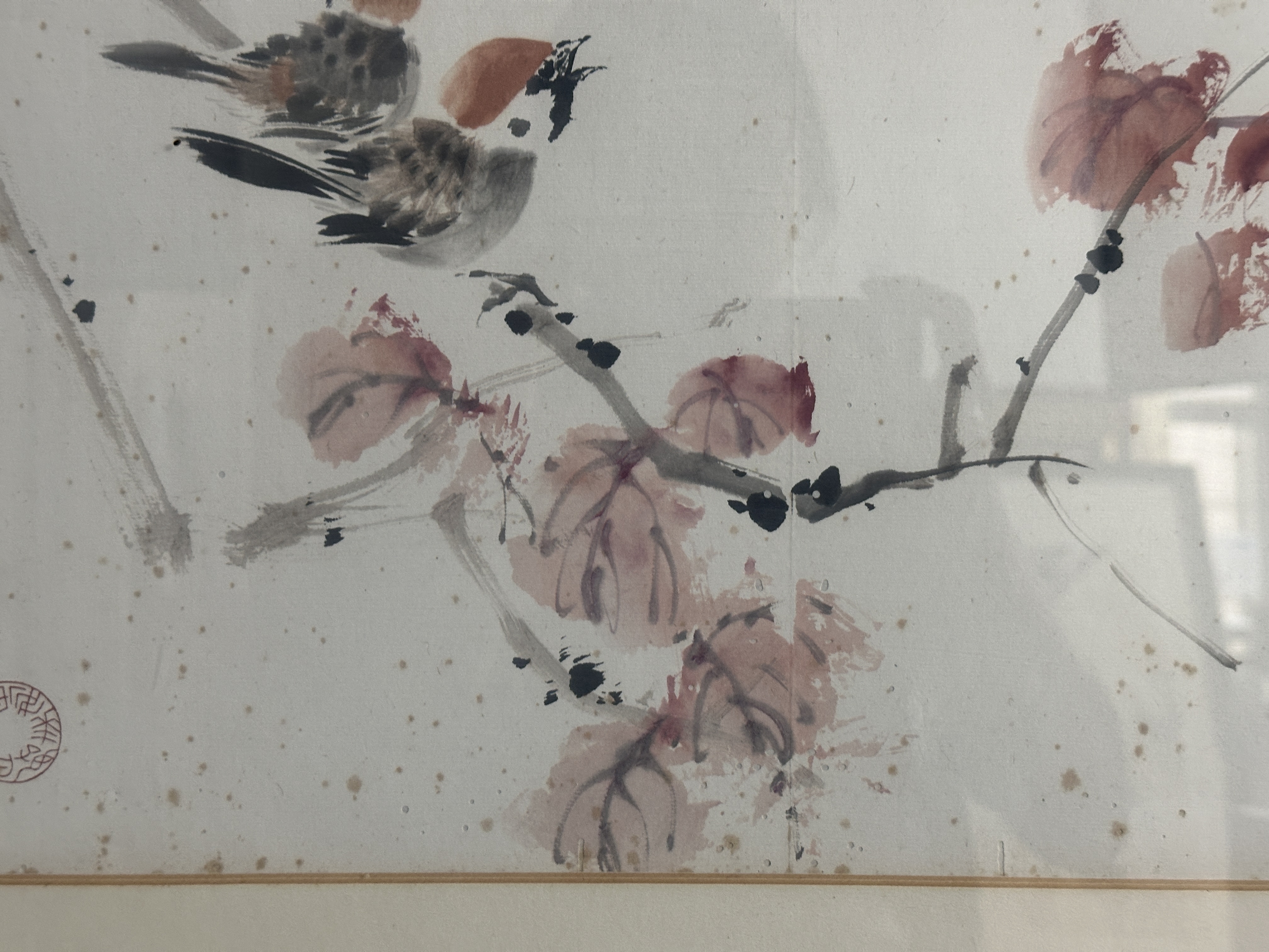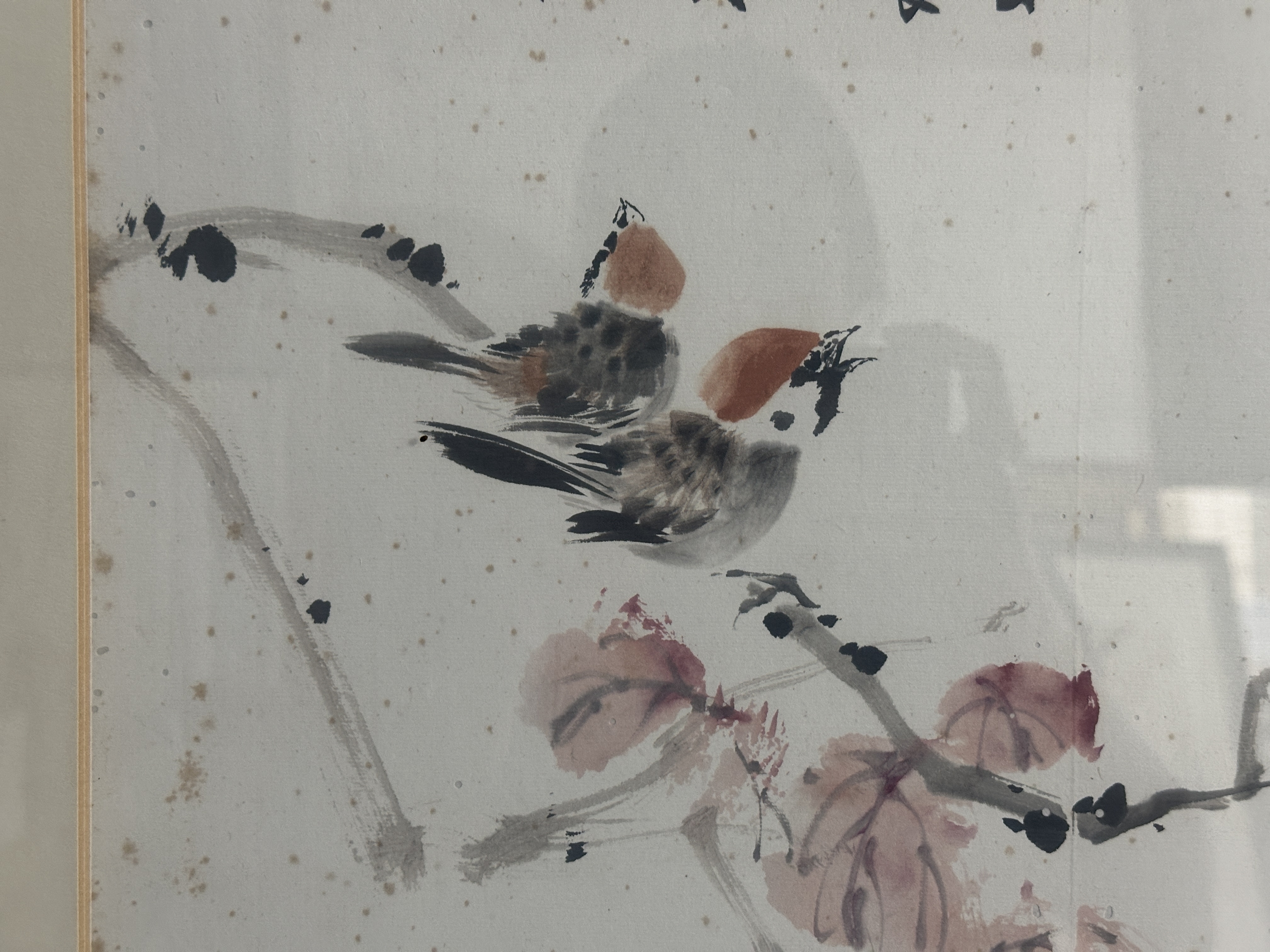 中文說明:喻仲林(1925-1985),祖籍山東冠縣人,台灣著名畫家。早年從軍,1949年入台。1950年進入師範大學旁聽,後師從金勤伯先生學習國畫,專攻宋元花鳥,擅長勾勒設骨二法。與胡念祖、孫家勤並稱為麗水三杰,並一同創辦麗水精舍畫室。喻仲林多次創辦個人畫展,並於1975年應夏威夷大學之邀教授國畫,並獲得中國畫金爵獎。喻仲林是20世紀台灣最具代表性的工筆花鳥畫家之一,以其精細的筆法、典雅的設色和生動的自然意境聞名。他將中國傳統工筆畫與台灣本土生態結合,創造出獨特的花鳥畫風格,被譽為“台灣工筆花鳥第一人”。其作品被台北故宮博物院、國立歷史博物館等機構收藏。此畫精細寫實,羽毛、樹葉等細節刻畫入微,設色生動,色調清雅。