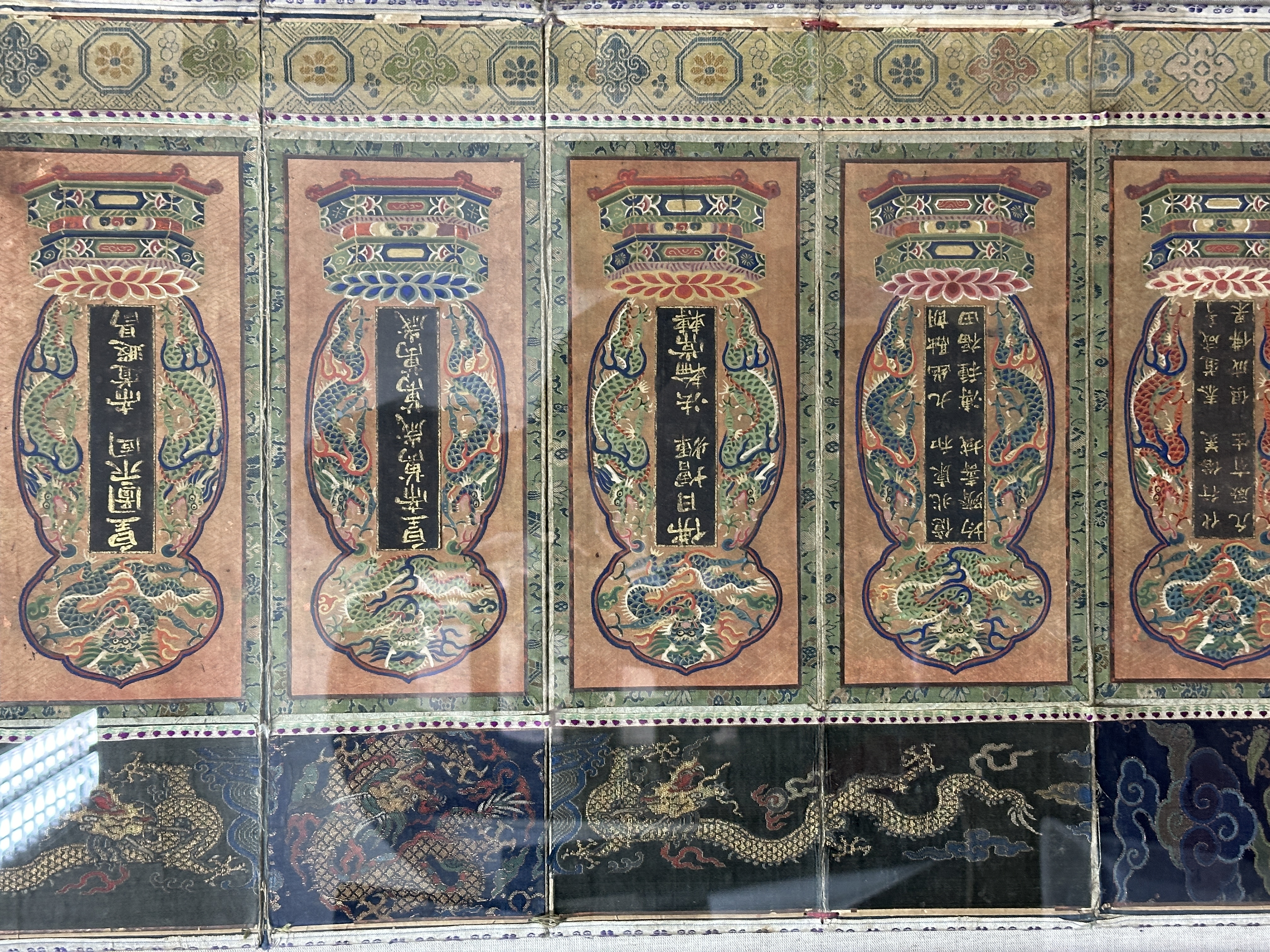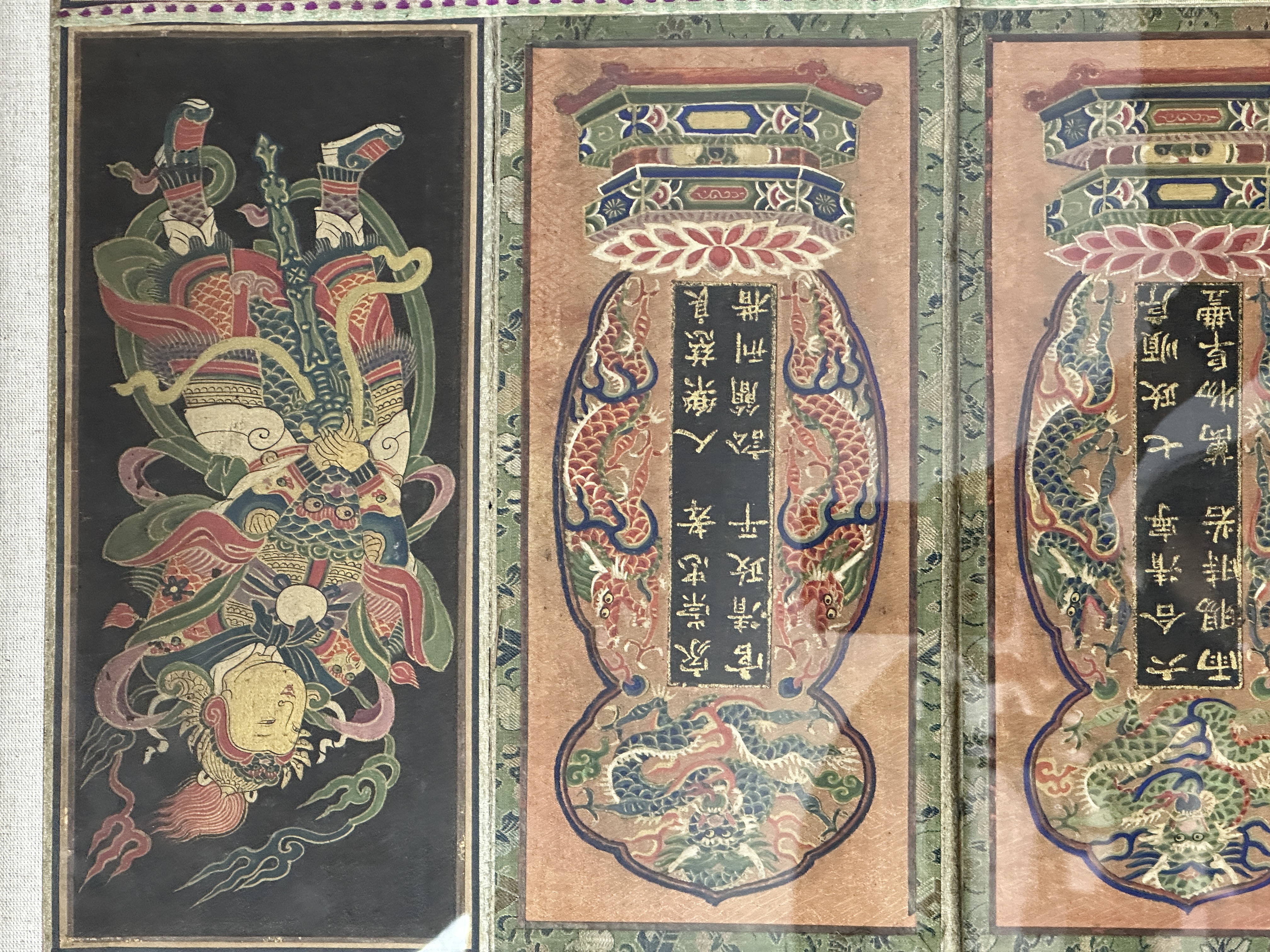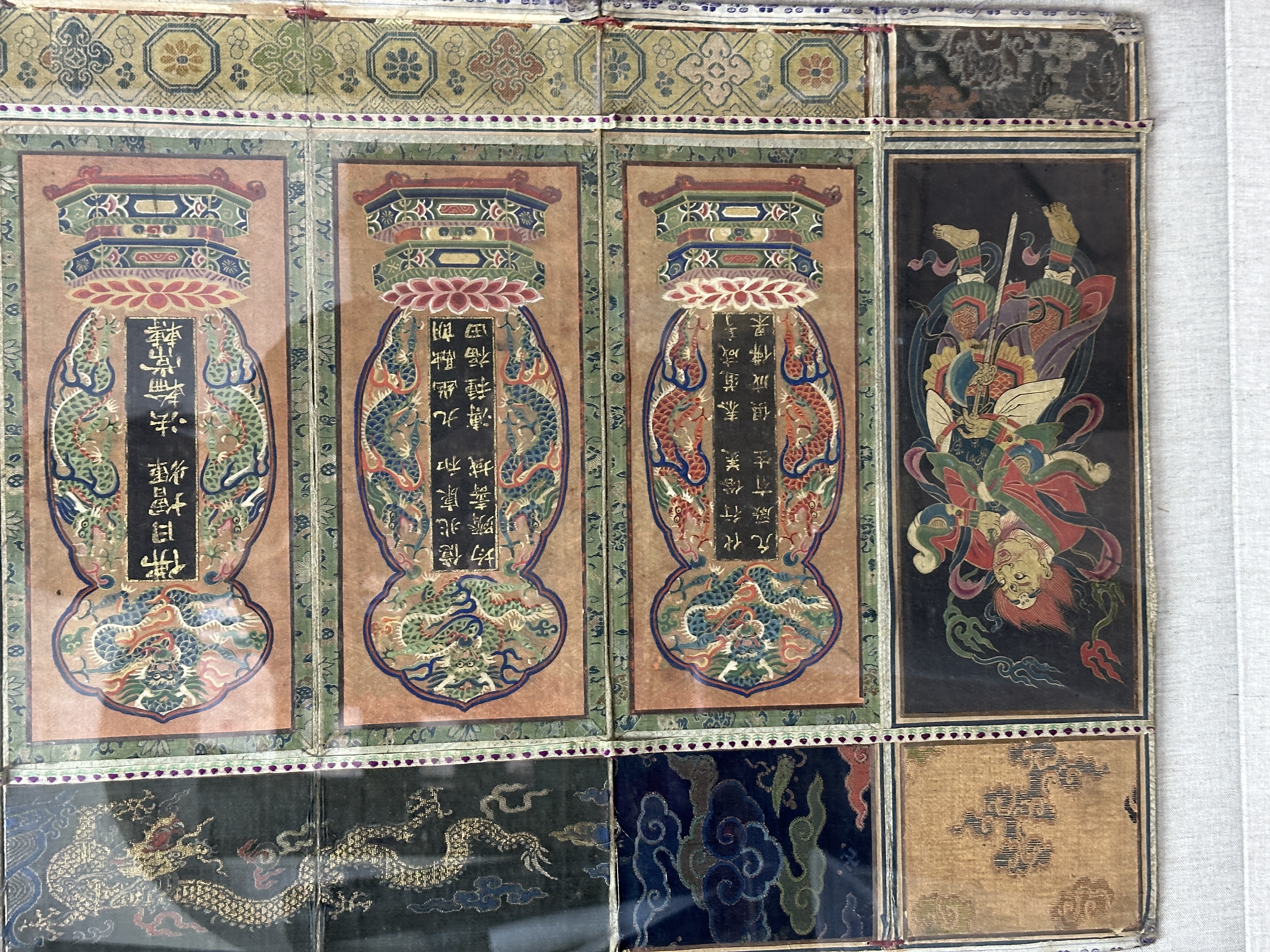 緙絲為上下邊框,內有七個經牌贊,兩邊重彩繪有韋陀、伽藍兩位護法。