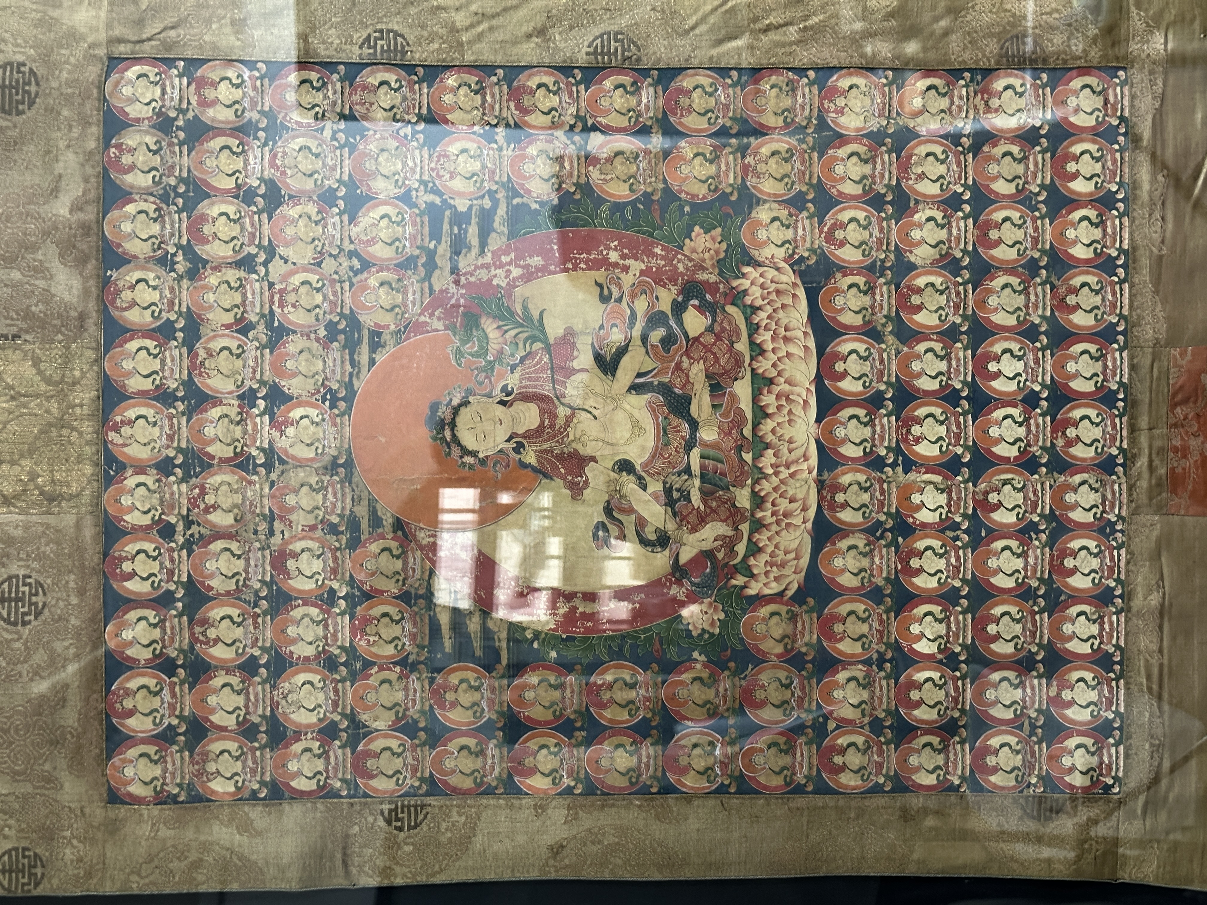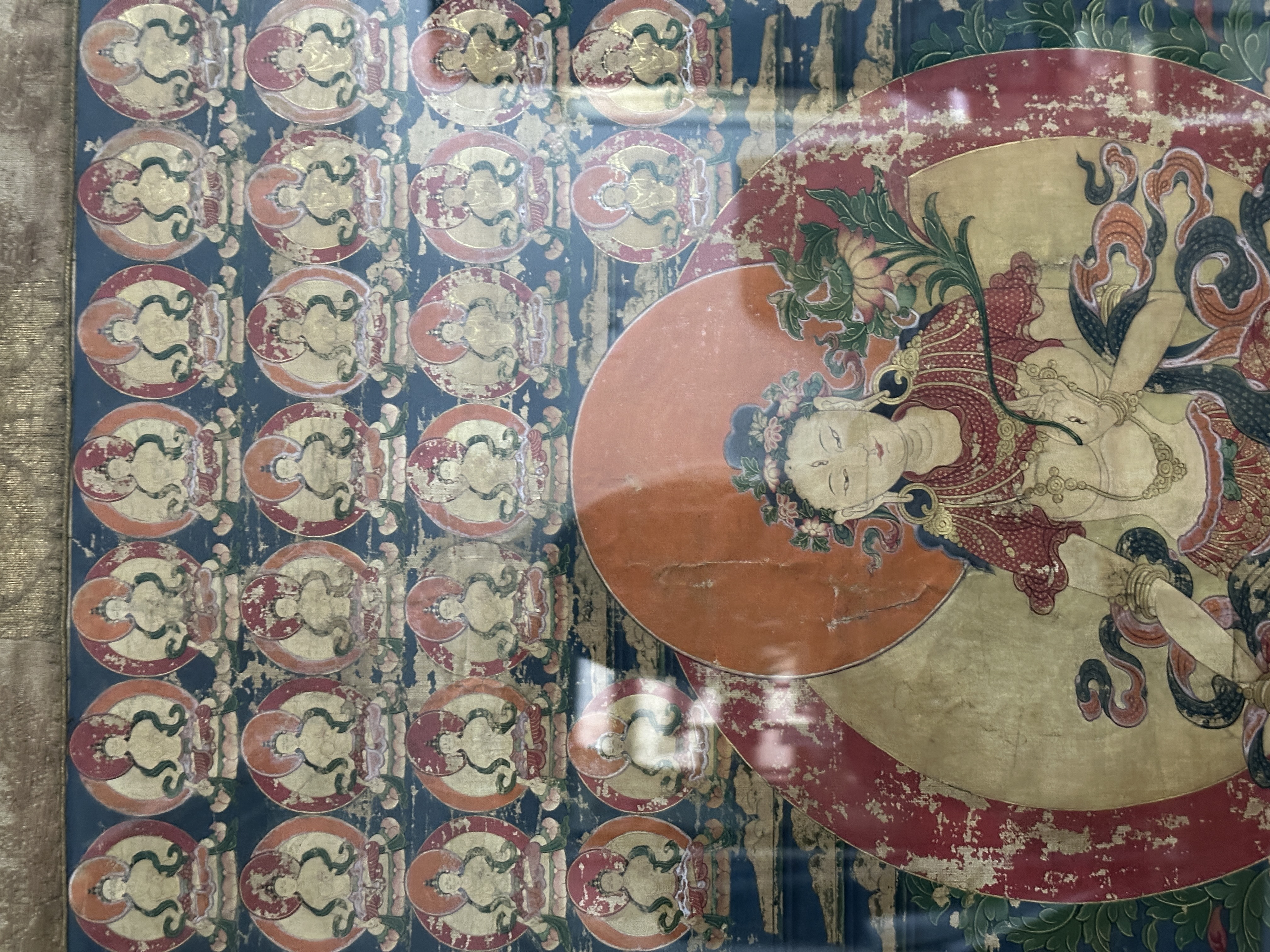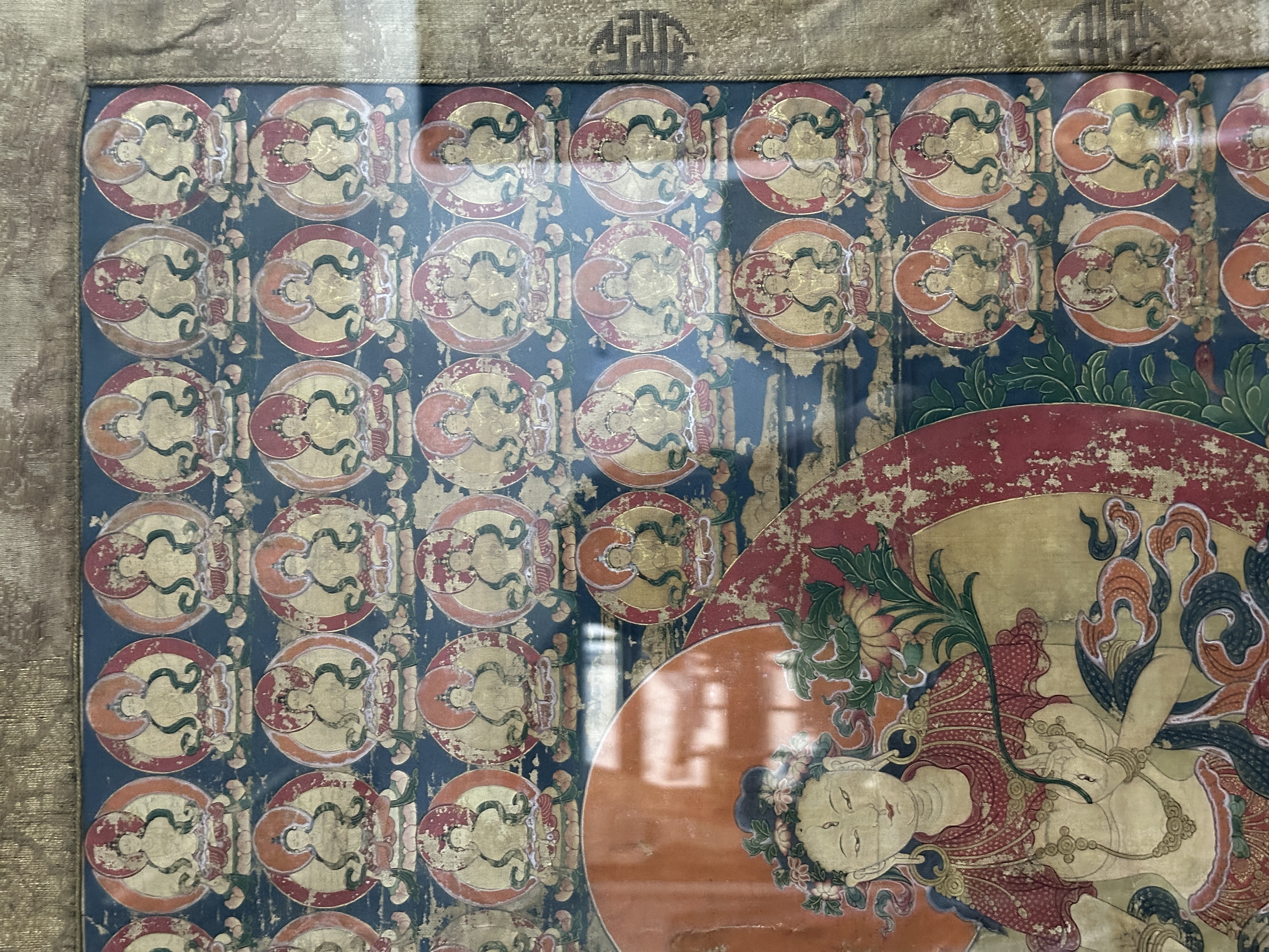 "白度母(WHITE TARA),藏音譯為卓瑪嘎爾姆,又稱增壽救度佛母,是觀世音菩薩的化身。觀世音有32種應化身,僅其中的度母化身就可以變化為 21位救度母,白度母即為聖救度佛母的二十一尊化身之一。在藏傳密教中,綠度母與白度母是二十一尊度母之中流傳最廣的。而藏密又常以長壽佛、白度母及尊勝佛母等三尊合稱為:「長壽三尊"",具有救度八難的威德,是能夠為一切眾生賜予長壽的一尊度母,許多信仰眾所知道的白度母是一位能夠為一切生壽的本尊,其實凡是這些,如果虔誠地修不止這些,如果虔誠地修不止這些,此幅唐卡構圖極為簡潔,除主尊外並未繪有其他人物。度母膚色潔白,晶瑩剔透,細腰豐乳,如妙齡少女;僅下半身著紅色衣裙,其餘部分均呈裸露。七隻慧眼個個如菊花瓣大小,這些眼象徵她能觀照一切眾生。月亮靠背,雙足金剛咖跌坐安住於蓮花月輪上,右手膝前手掌向外結施願印以示救助,左手當胸以三寶印撫烏巴拉花,左手拇指與無名指牽住白蓮花枝對著心間,花沿腕至耳共有三朵,一朵含苞,一朵半開,一朵全開,對佛足、法高、三尊四尊神韻。"
