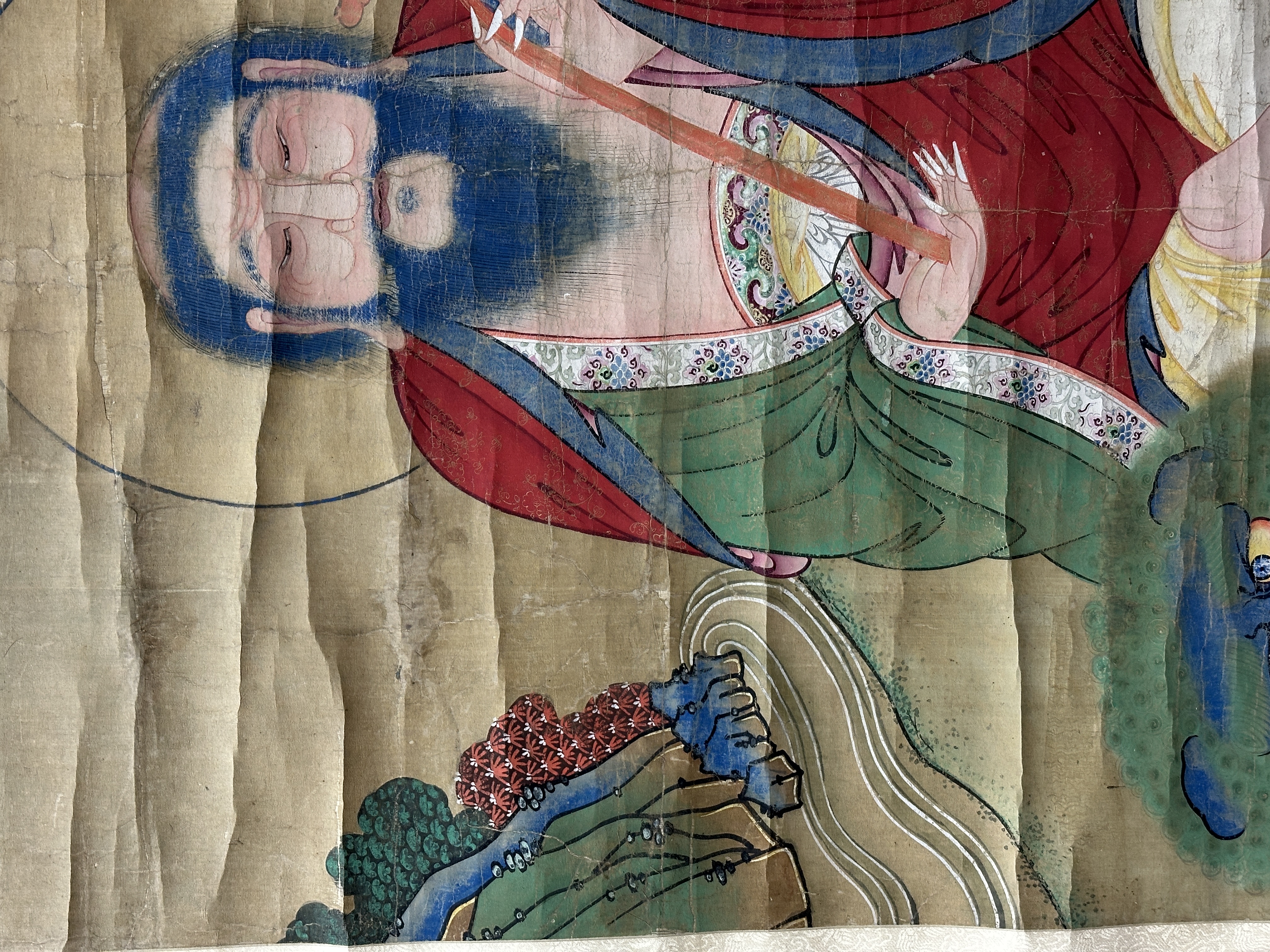 明代絹本重彩文殊菩薩像,絹本工筆,畫工精美,設色濃豔。畫面構圖完整,上方雲霧繚繞,下方山石花草點綴,人物形象生動。主尊文殊菩薩手持法器,雙目低垂,神態安詳。周圍有護法神和神獸青獅相伴,構圖嚴謹,色彩豔麗,保存完好。