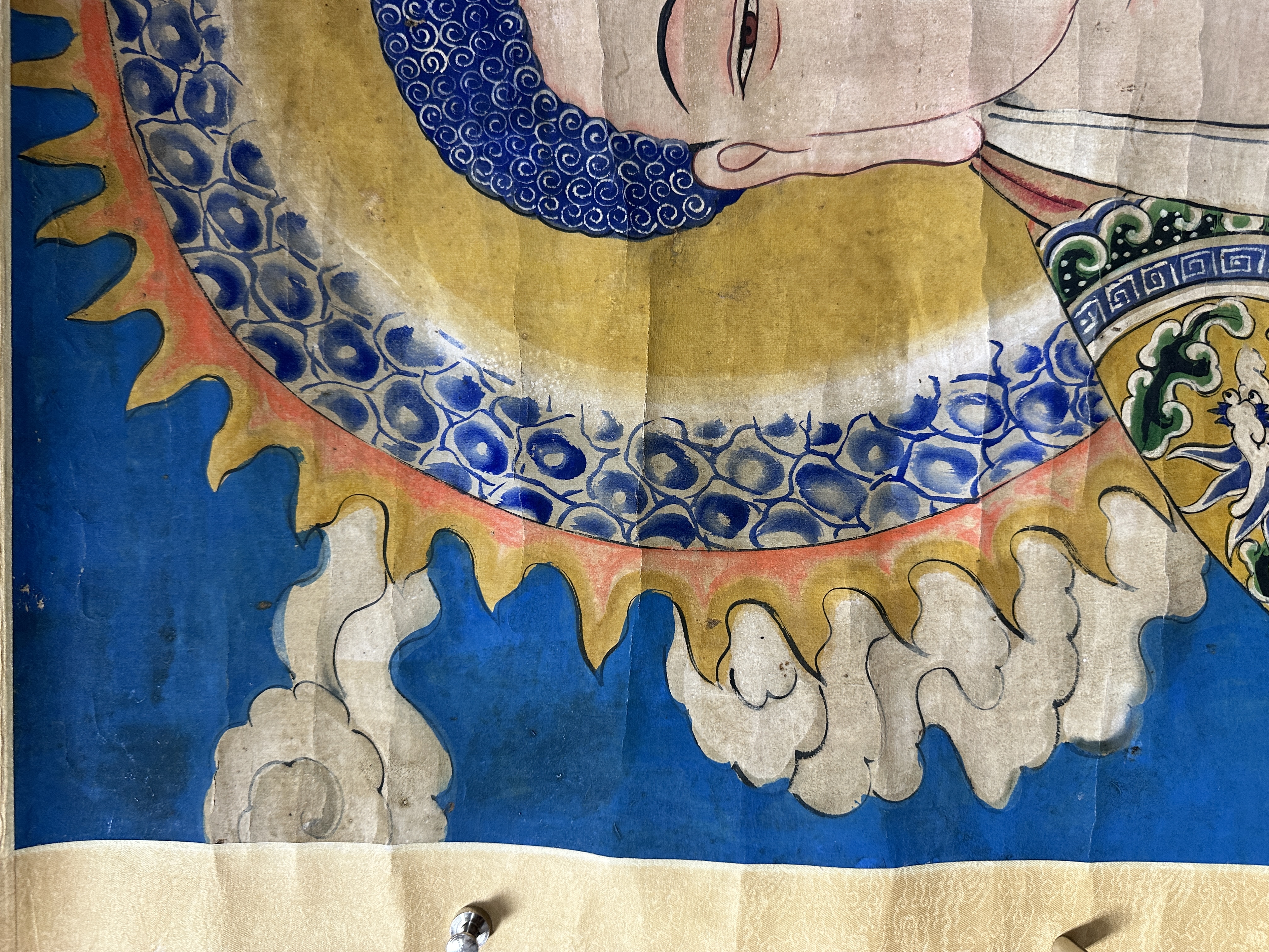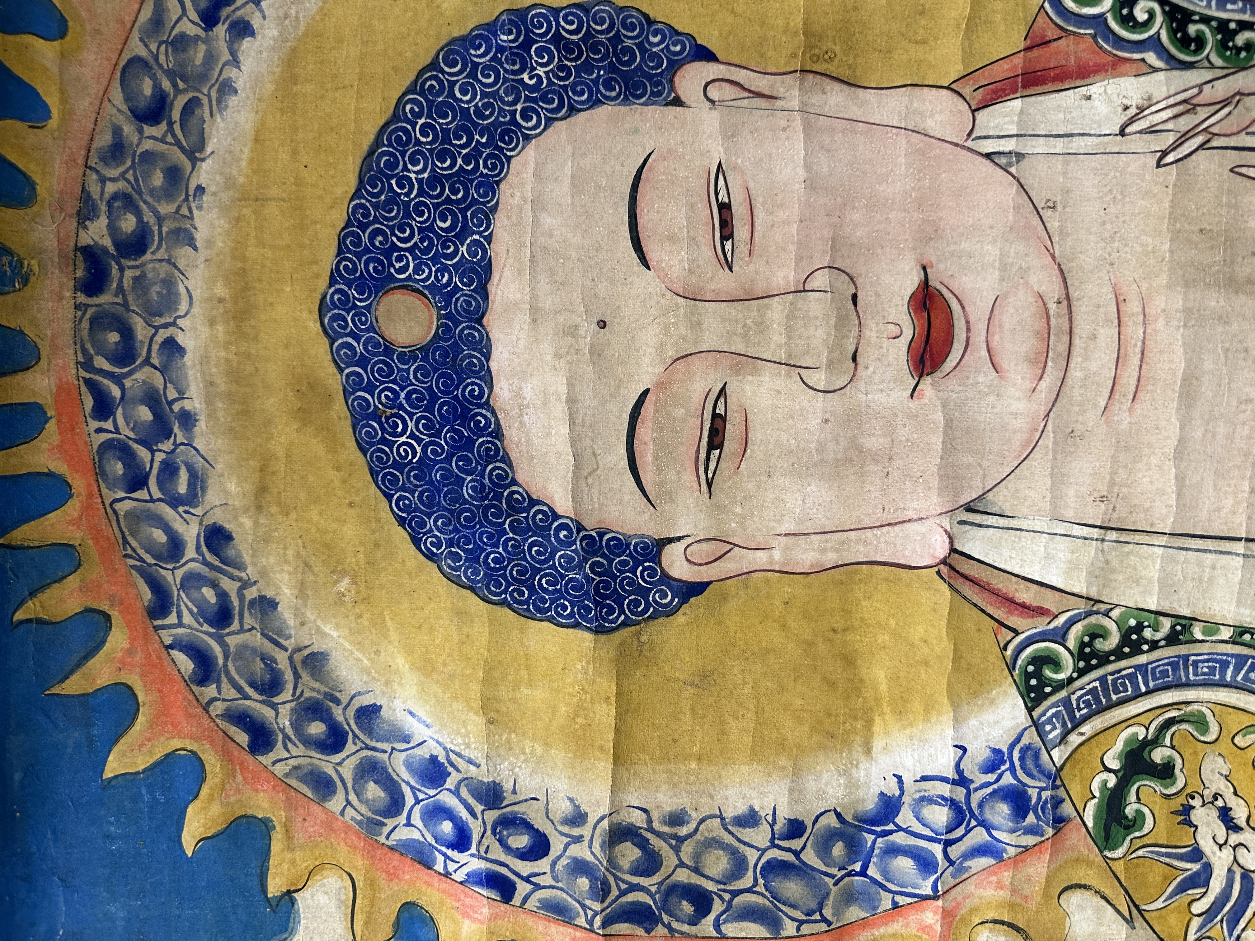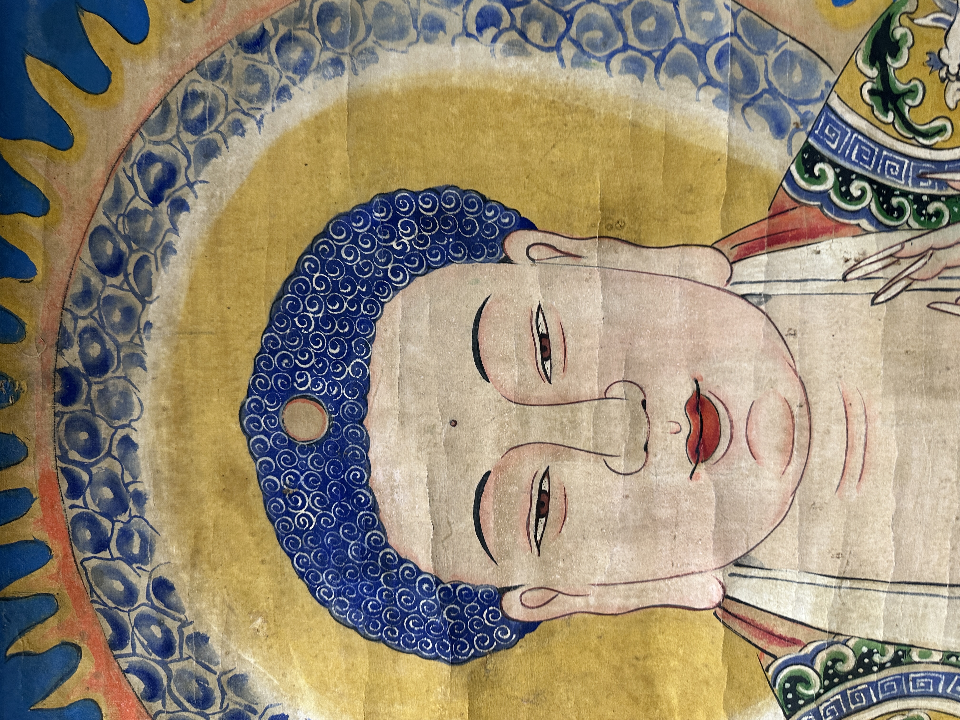 此幅佛像繪畫為傳統工筆重彩作品,描繪釋迦牟尼佛結跏趺坐於蓮花寶座之上。佛祖頭戴寶冠,面容慈悲莊嚴,身披繁複袈裟,衣飾以硃紅、石綠、群青等礦物顏料精心繪飾,紋樣華美細膩。背襯金色頭光與湛藍蒼穹,祥雲繚繞,構圖端嚴對稱。畫作採用絹本設色,裝裱為古式卷軸,整體色澤沉穩,技法精湛,兼具宗教藝術神韻與收藏價值,適宜供奉或鑑賞。