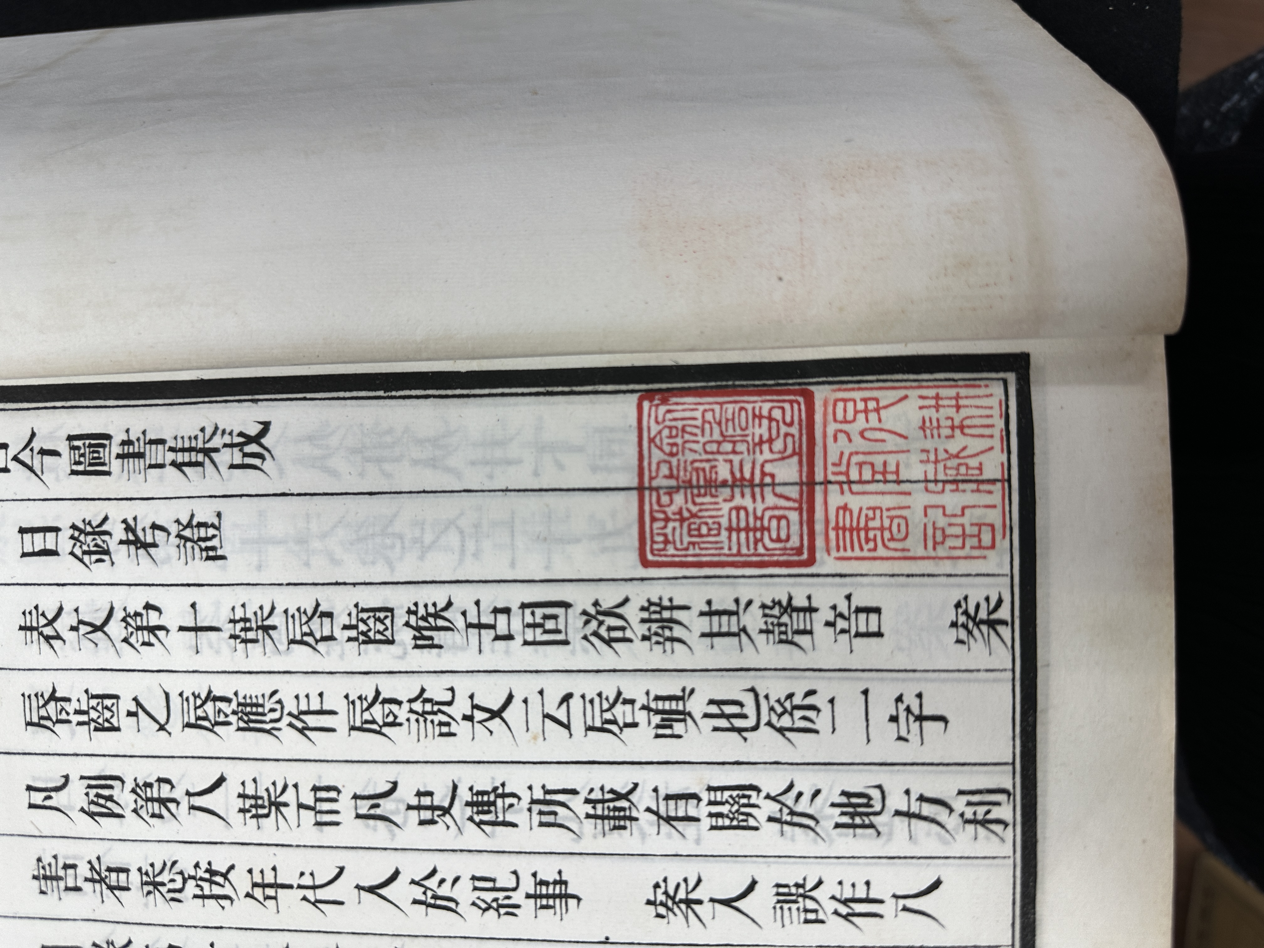 (清)光緒十六(1890)年上海同文書局據雍正銅活字版石印。白紙,線裝,二十四卷,4函24冊。(清)光緒十六年(1890),經光緒帝奏準,《古今圖書整合》再次以石版印製技術進行影印,同時增加《考證》二十四卷。由於工程繁浩,每部需銀三千五百餘兩,因此僅印100部。是書型、裝潢與雍正間銅活字印本完全一致。原函原套,保存完好,流傳稀少。龍繼棟,字松琴,廣西臨桂人。曾主講金陵尊經學院,著有《十三經廿四史地名韻編今釋》。《考證》對《古今圖書集成》中的舛、脫、衍字與錯簡、重複之處詳加校訂,又旁徵博引,或考證辨誤,或存疑備考,或補充內容,為《古今圖書集成》的早期研究著述。