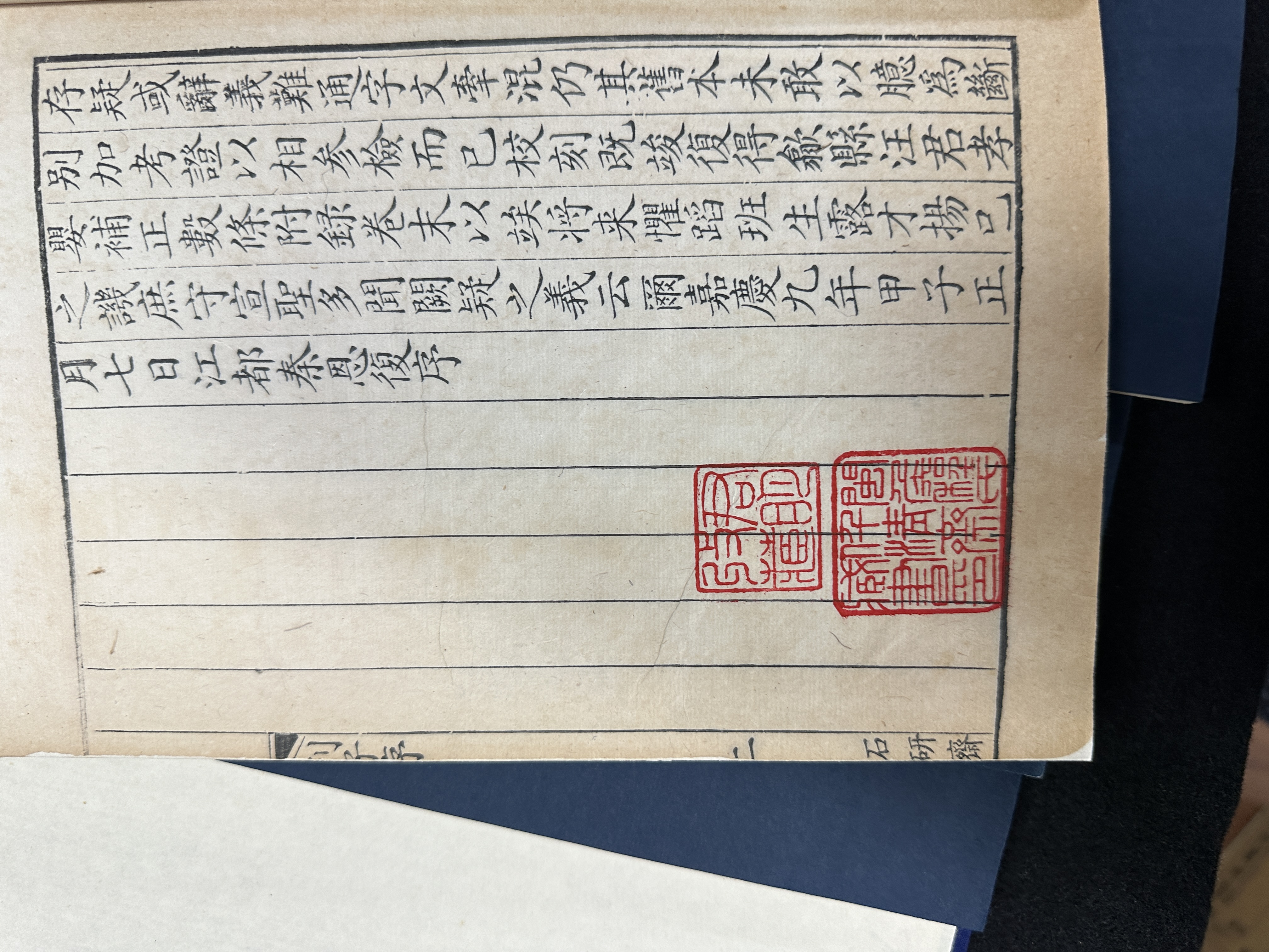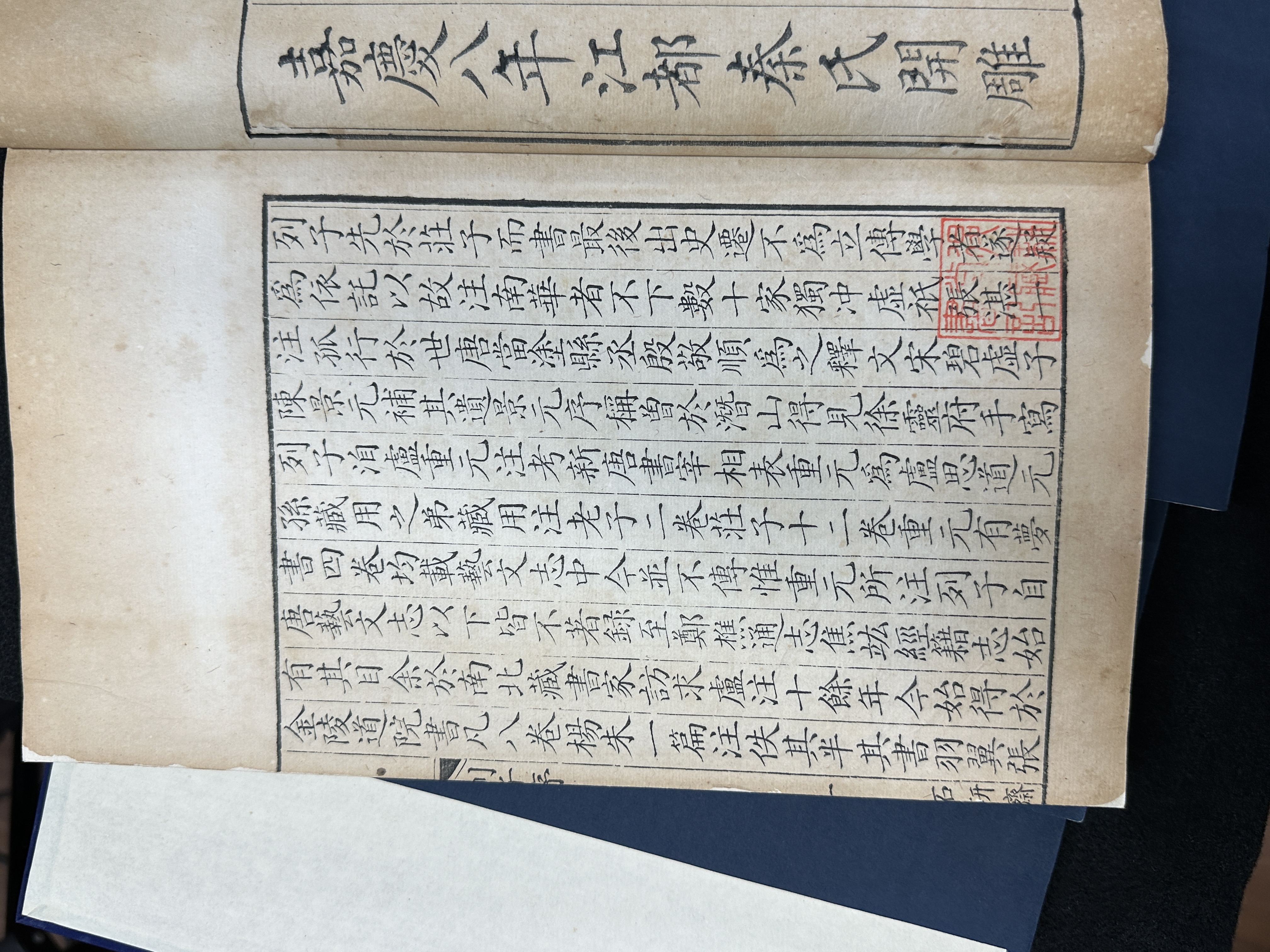 清嘉慶八年江都秦氏石研齋刊本。「石研齋」為清藏書家秦恩復之室名。《列子》是道家重要典籍,戰國鄭人列御寇所著,漢代奉為《沖虛真經》。此本《列子》題(唐)盧重元注。10行21字,小字雙行字同。白口、左右雙欄、黑單魚尾。書口上有卷數、中標頁數、下刻「石研齋」。書前附:首(清嘉慶)秦恩復序,次(唐)盧重元撰敘論,次盧注考證。全書共八卷,分為:天瑞、黃帝、周穆王、仲尼、湯問、力命、楊朱、說符共八篇,每篇均由多個寓言故事組成。每卷末題:「嘉慶八年癸亥夏四月甘泉吳漣寫,江都秦伯敦父校刊計XX葉」。秦恩復(1760-1843),字近光,號敦夫,室名石研齋,江蘇江都人。清代藏書家、文學家、校勘者。乾隆五十二年(1787)進士,改翰林院庶吉士。散館,授編修。讀書好古,尤精校勘,所刊之書時稱秦版。