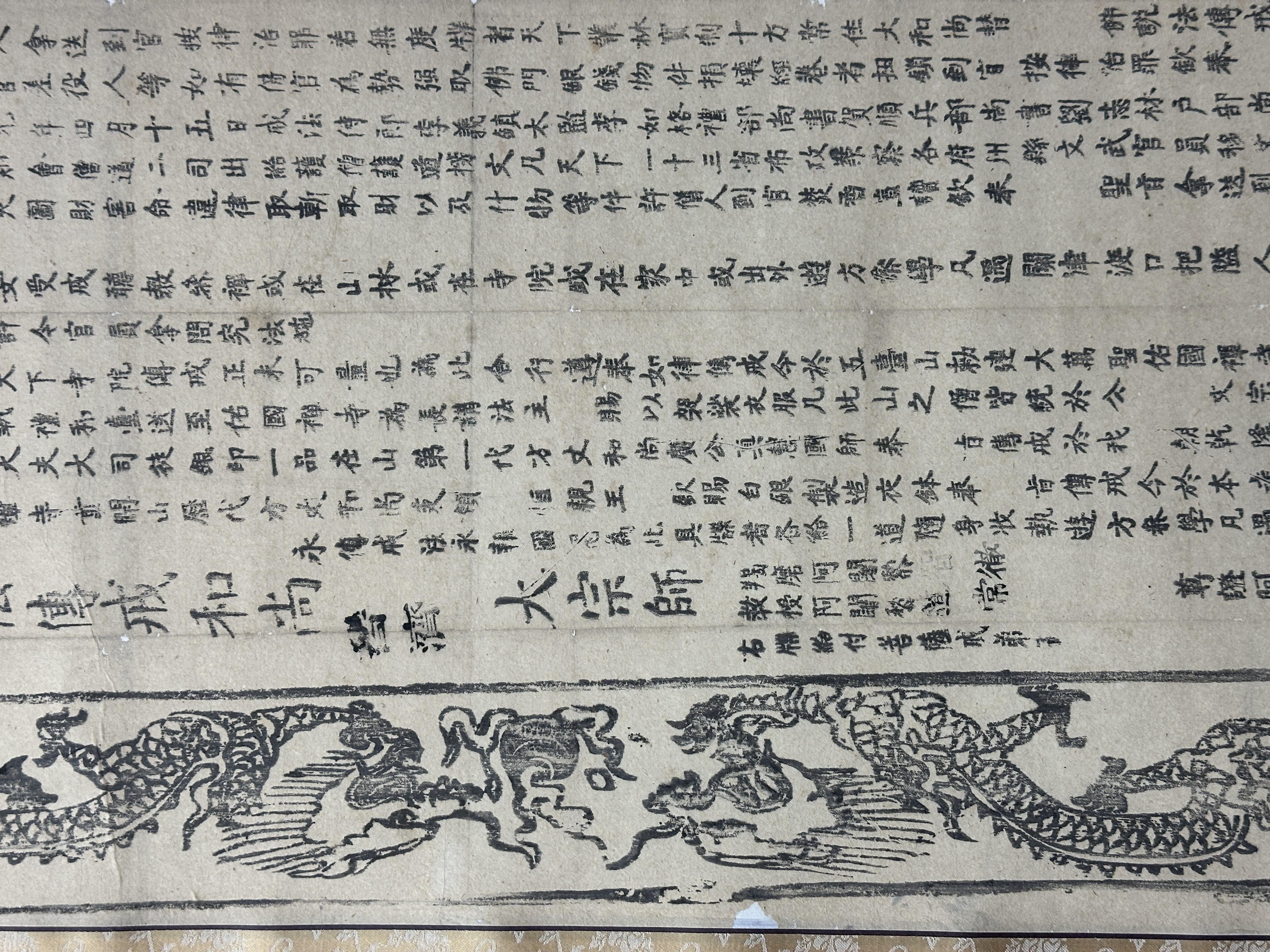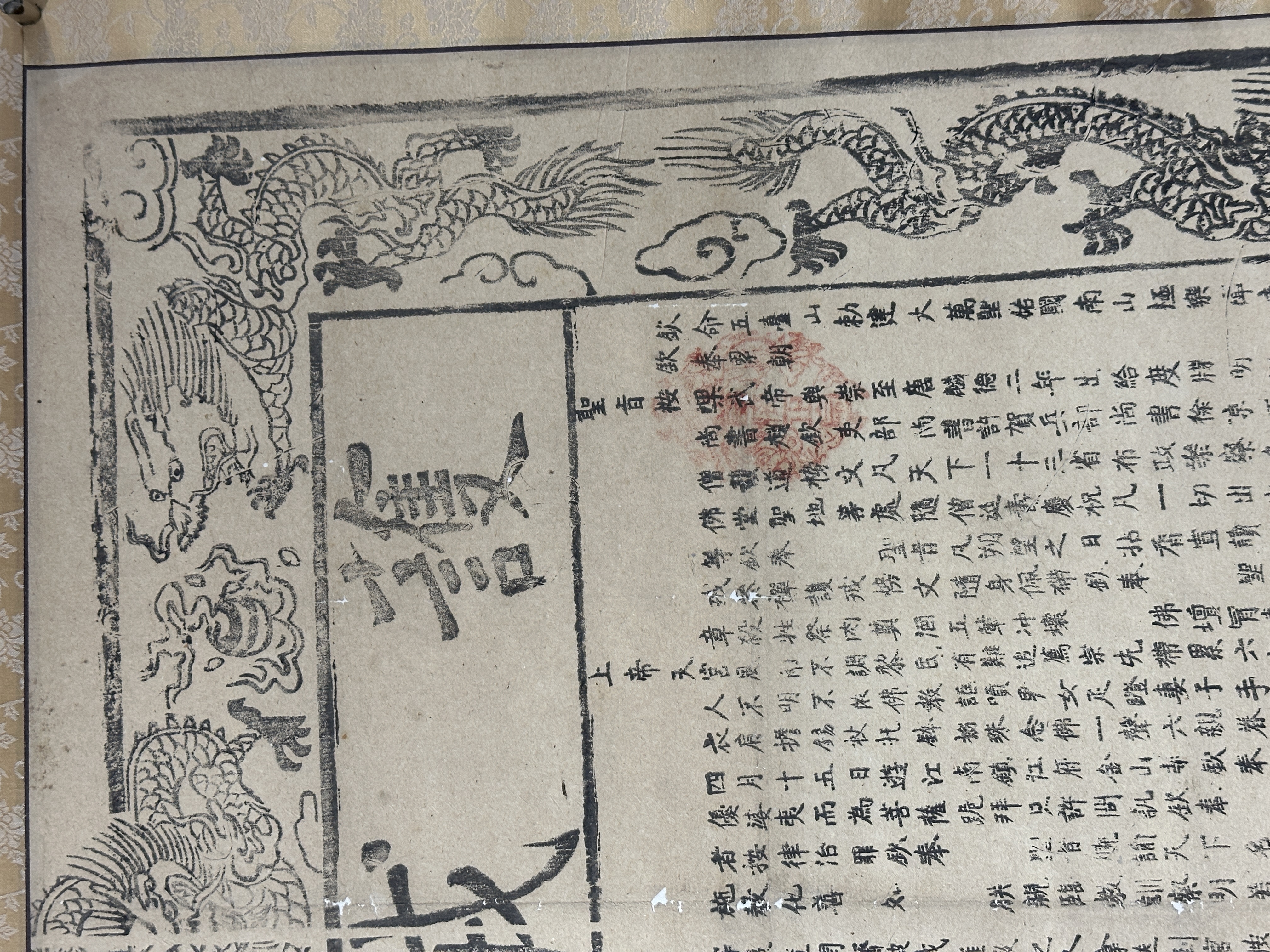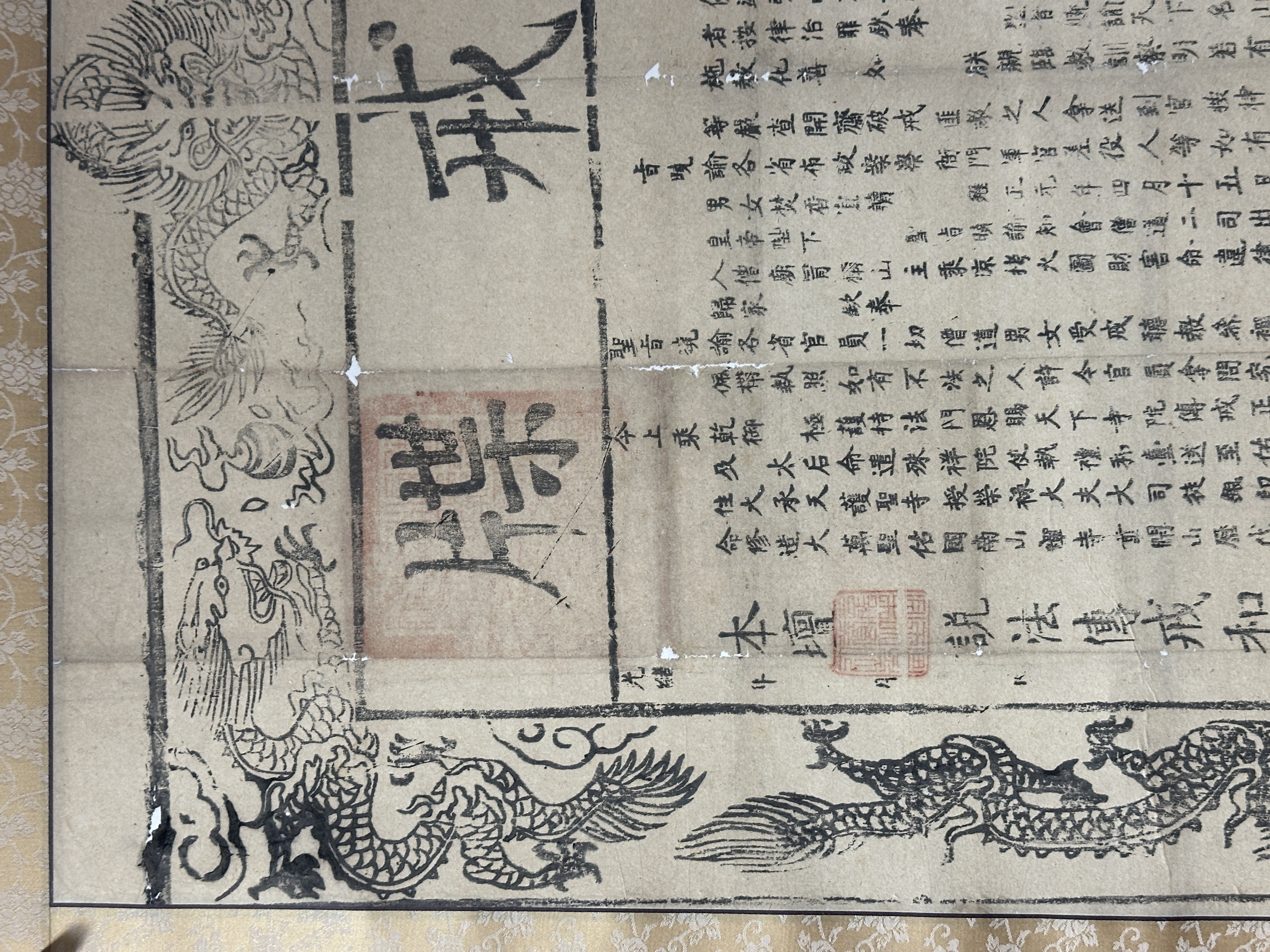"《五臺山護戒牒》光緒年欽命五臺山敕建大萬聖佑國南山極樂禪寺建立大秉戒壇所發,上印八龍戲珠圖。五臺山作為文殊菩薩道場,既是明清律宗授戒法的重要法源地,也是律宗授戒法系活動的重要地域之一。此度牒尺寸巨大(650 × 1135mm),保存甚佳,且歷史意義厚重。此牒由普濟大宗師發給,更具意義。按清《大昭慶律寺志》卷八:「寺以律名,宗由律顯。持律說戒之宗師,名實兩符」;卷九「于中德行著聞,眾推登壇說戒者,即是宗師;能弘經闡法者,即是法師。若時逢廢寢,禪堂定有主者,名曰住持」。卷九「當知成化以前,宗師與住持合,成化而後,住持與宗師分」。因此,當時的宗師雖不一定是住持、方丈;但同樣的,開設戒壇的寺院住持或方丈,也不一定具有能發給護戒牒的宗師資格。護戒牒為戒律制度的正式憑證,為漢傳佛教中受戒(特別是三壇大戒)的重要標誌。而五臺山又是中國四大佛教名山之首,主尊文殊菩薩,道場地位崇高。清末法律對僧籍規範逐漸嚴格,憑護戒牒可證明為正信佛門弟子,方便通行。本牒文中更有:「欽奉聖旨曉諭各省官員…凡遇關津渡口,把隘人等不許阻攔」"