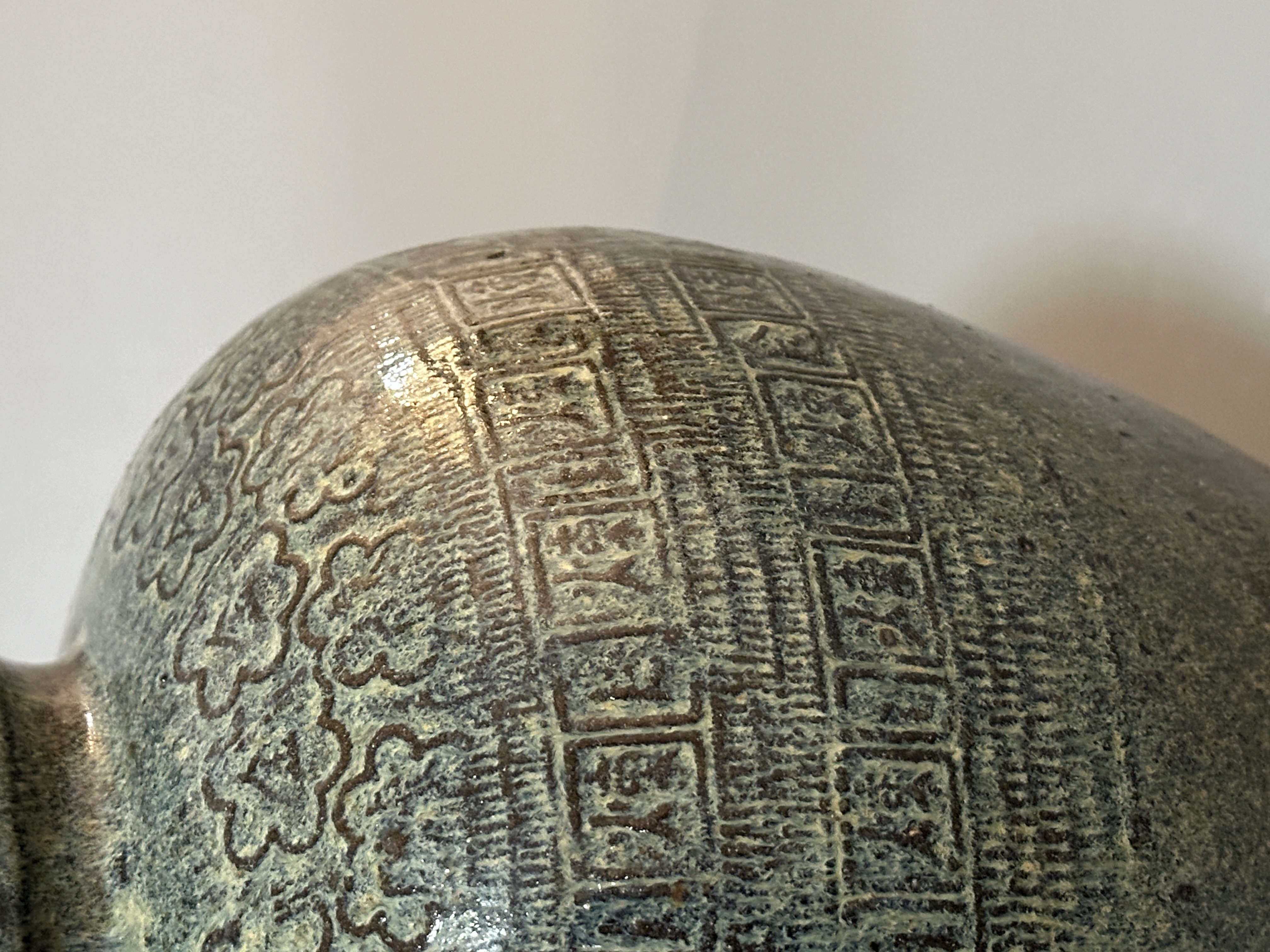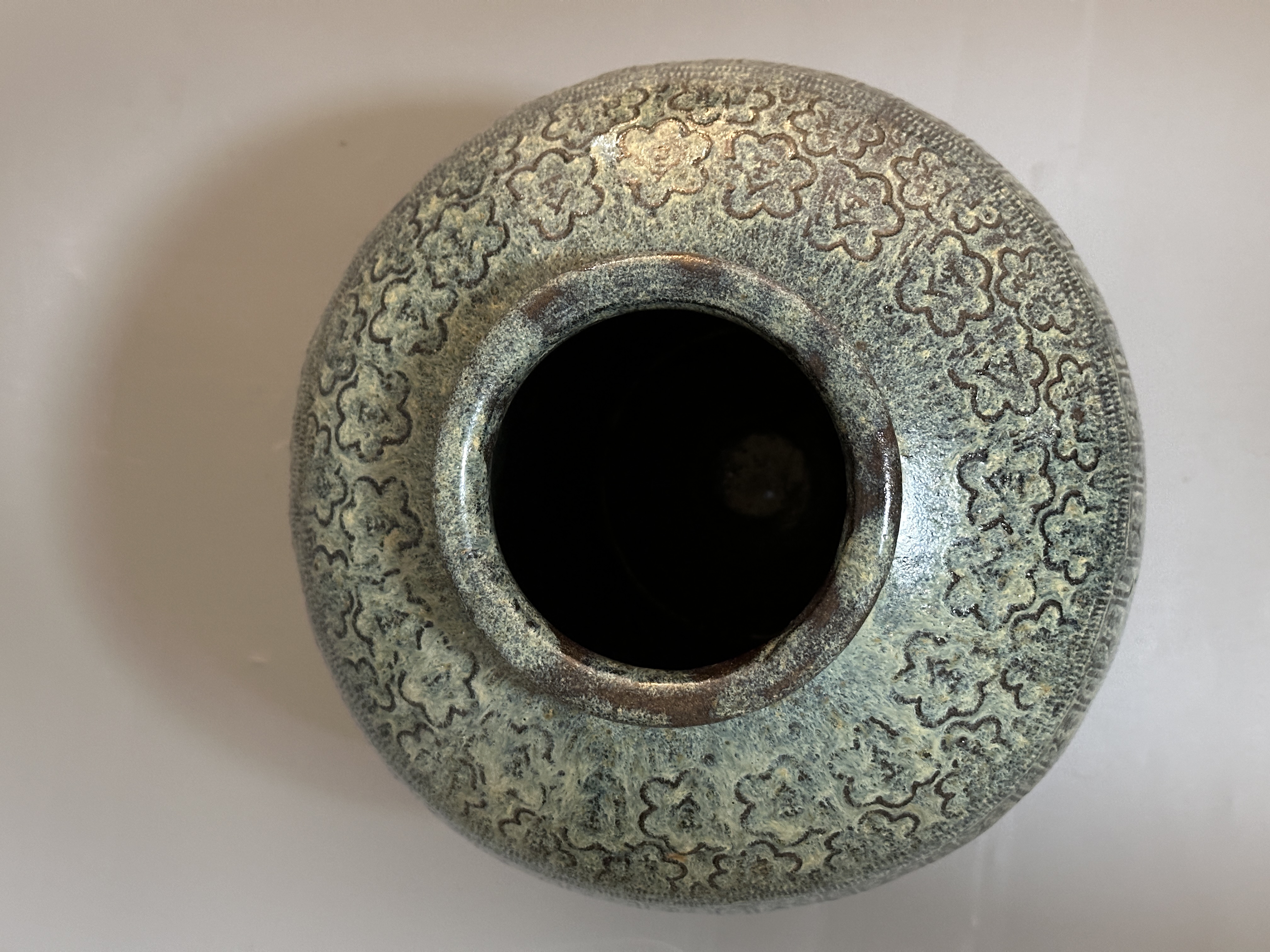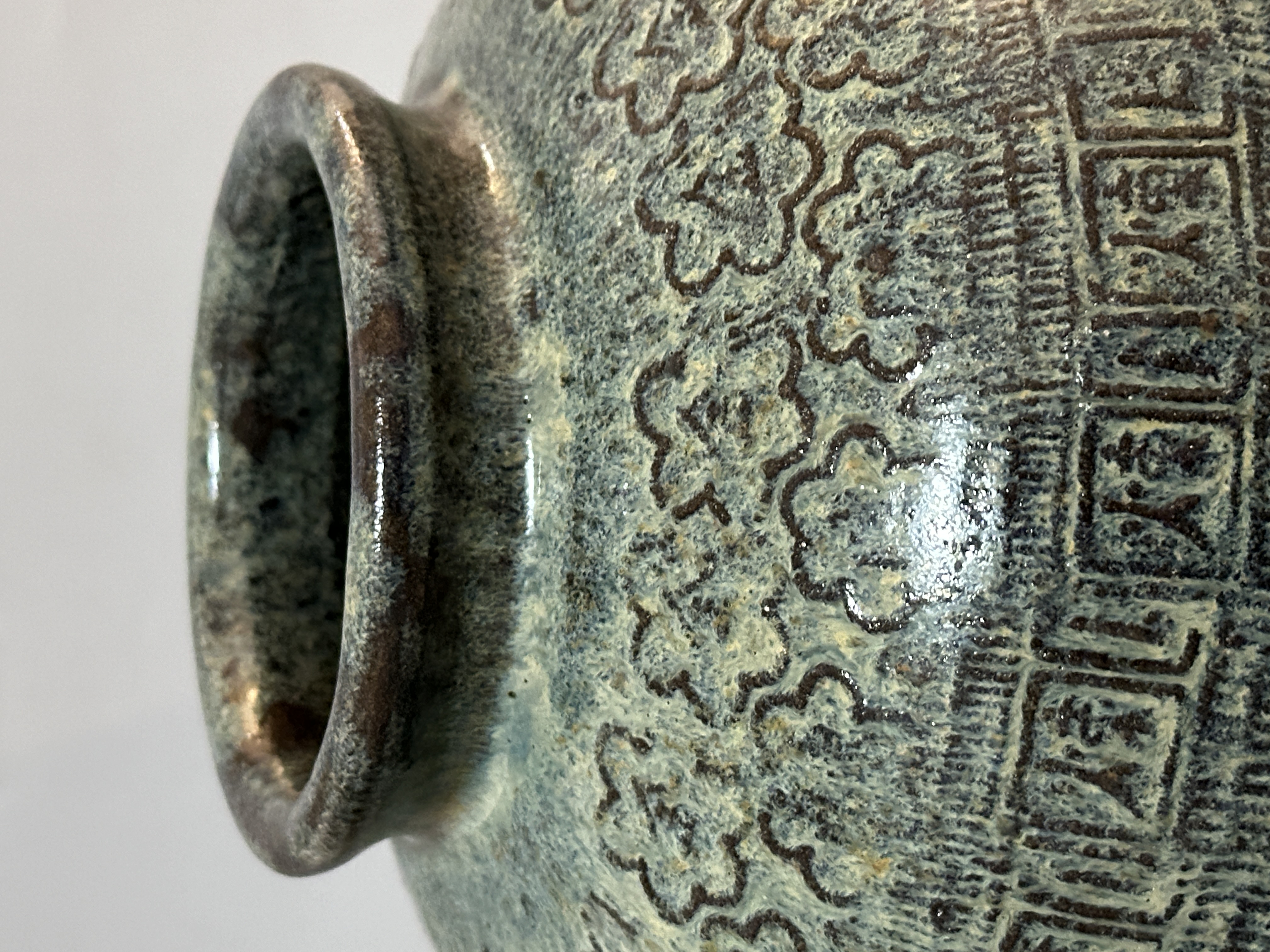 此甕器形豐滿敦厚,小口短頸,溜肩鼓腹,至下腹內收成小圈足,整體比例穩重厚實。 甕身施橄欖綠至褐綠色釉,局部呈現細小開片與流釉效果。 肩部一帶以連續花紋作裝飾,下方環繞甕身的方框紋帶刻有「煉」字與蓆紋。