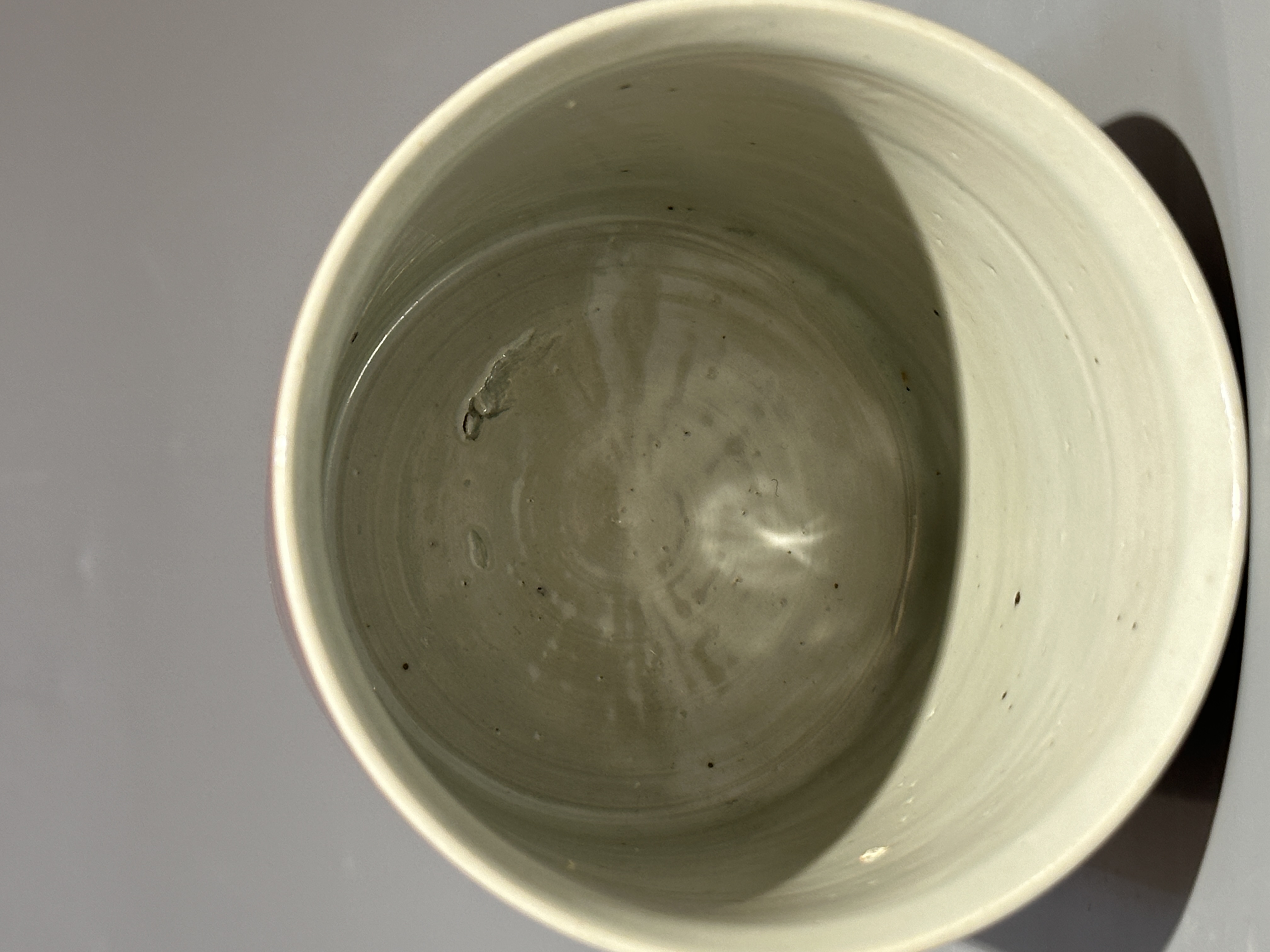 此筆筒為經典圓柱造型,形制規整,胎體勻實。外壁通施礬紅釉,釉色濃郁沉穩,紅中透褐,釉麵勻淨光潔,色澤統一中蘊有深淺自然的細微過渡,寶光內斂。口沿處露出一線細白的胎骨,與深沉的紅色形成巧妙對比,更顯工藝講究。底足處理工整,露胎處可見胎質細膩。整器不事雕琢,全以古樸的造型與醇正的釉色取勝,置於案頭,沉穩大氣,是晚清文房用具的實用佳品。