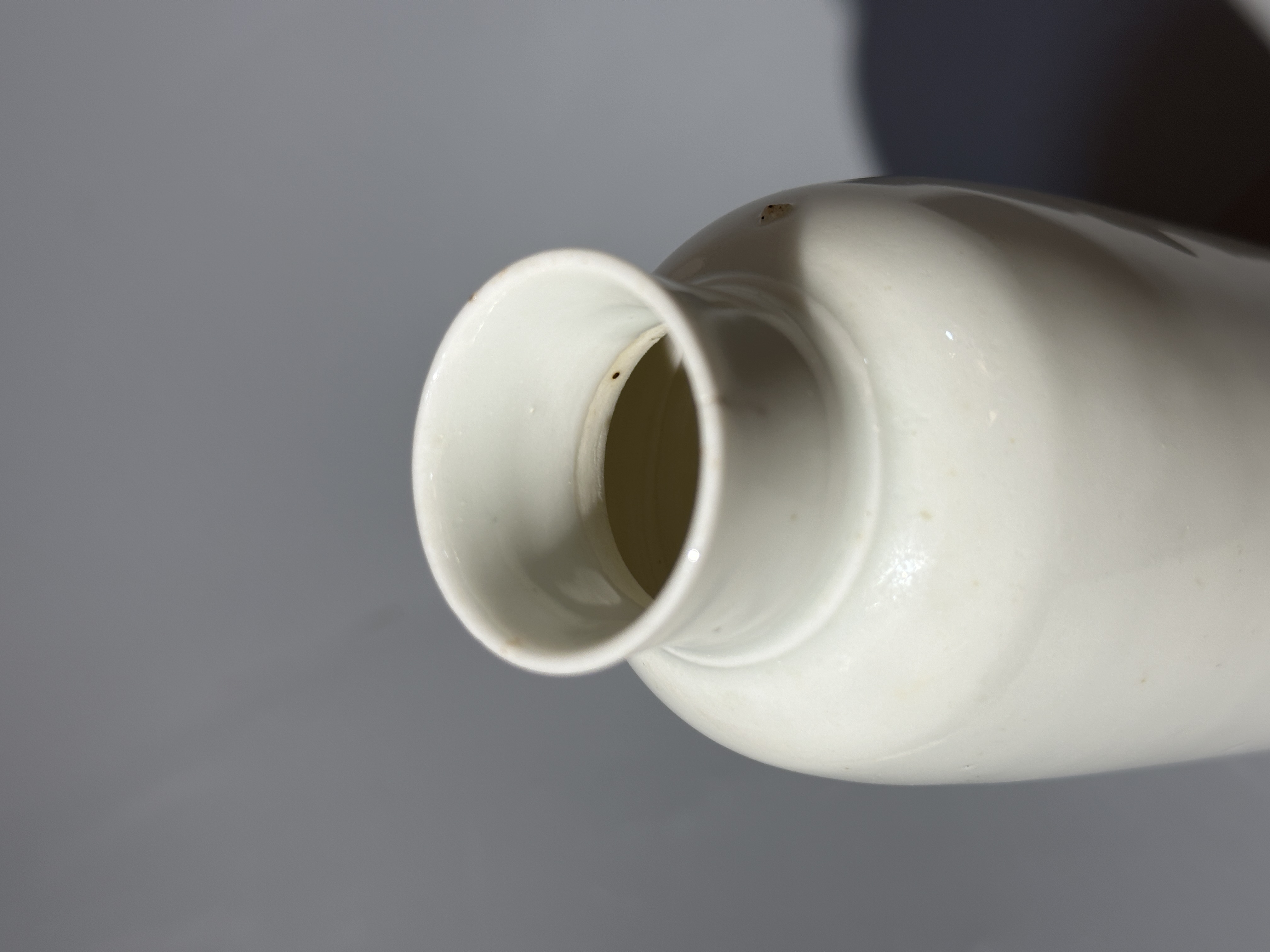 此件玉壺春瓶造型雋秀典雅,為經典制式。瓶身線條流暢飽滿,自腹部柔緩收束,至頸部外撇,勾勒出勻停秀美的輪廓。通體施白釉,釉質瑩潤如玉,釉色純淨如脂,於素白中透出含蓄的溫潤光澤。器身光素無紋,全然以造型的張力與釉色的質感取勝,體現了“大道至簡”的審美哲思。