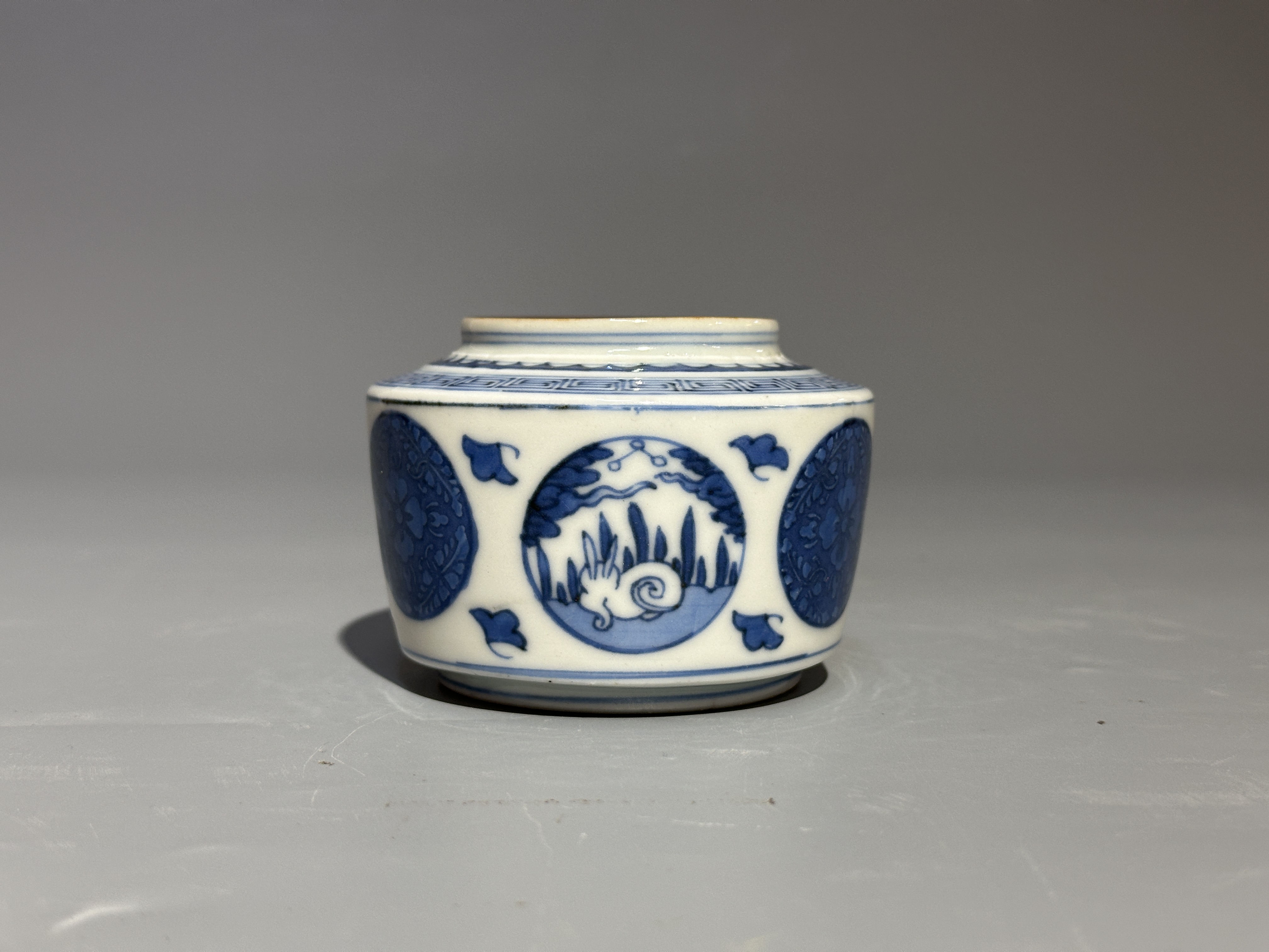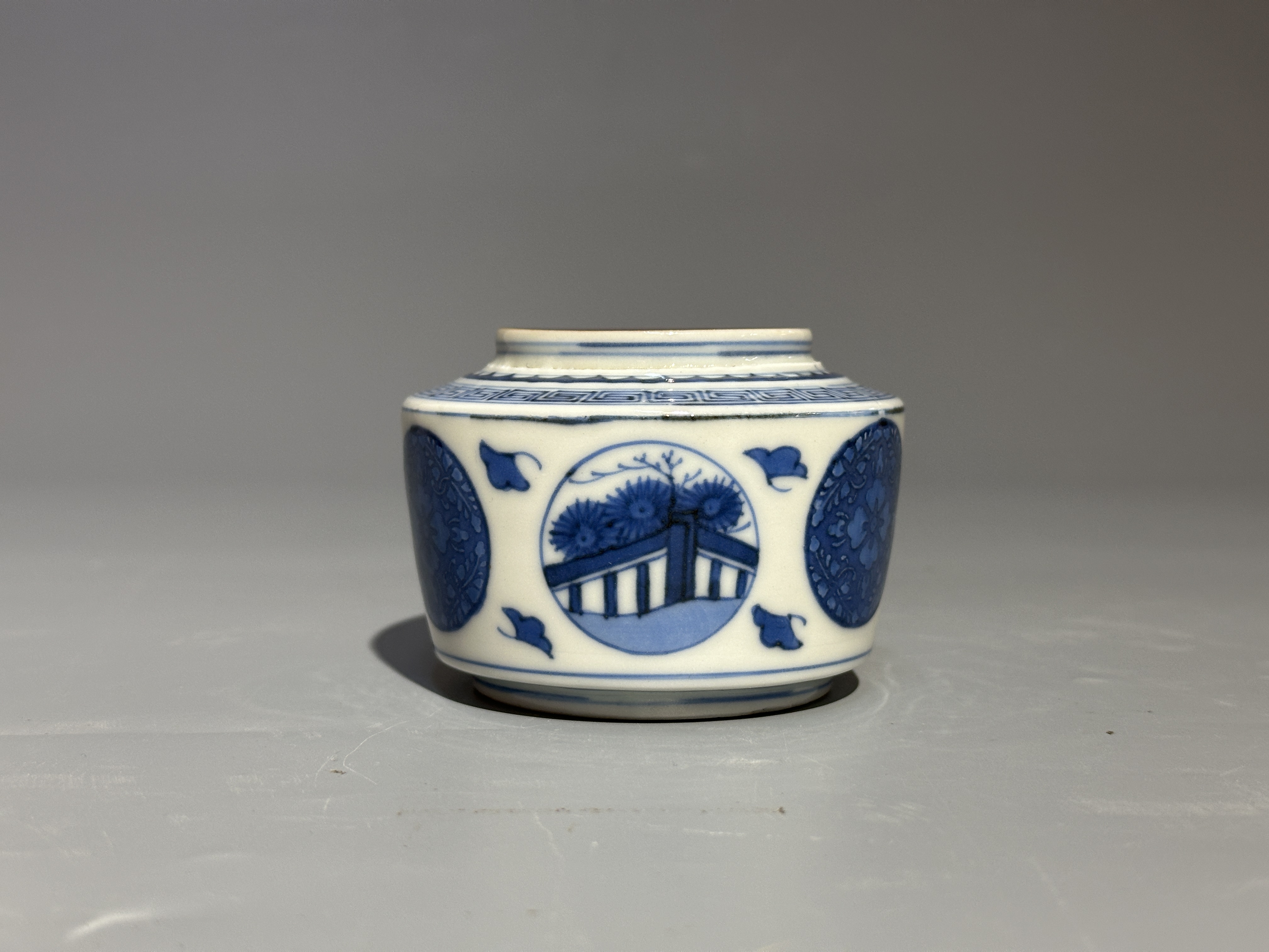 此罐造型敦實飽滿,豐肩斂腹,廓線圓潤,為明清之際經典罐式。通體施白釉,釉質瑩潤。外壁以青花為飾,自上而下分繪回紋、如意雲頭紋等規整邊飾。腹部主體作菱形開光,內以青花繪山水人物圖景:遠山層疊,流水潺潺,樹木掩映,高士徜徉其間,筆意疏朗灑脫,意境清逸。開光外輔以團花紋樣,佈局嚴謹。