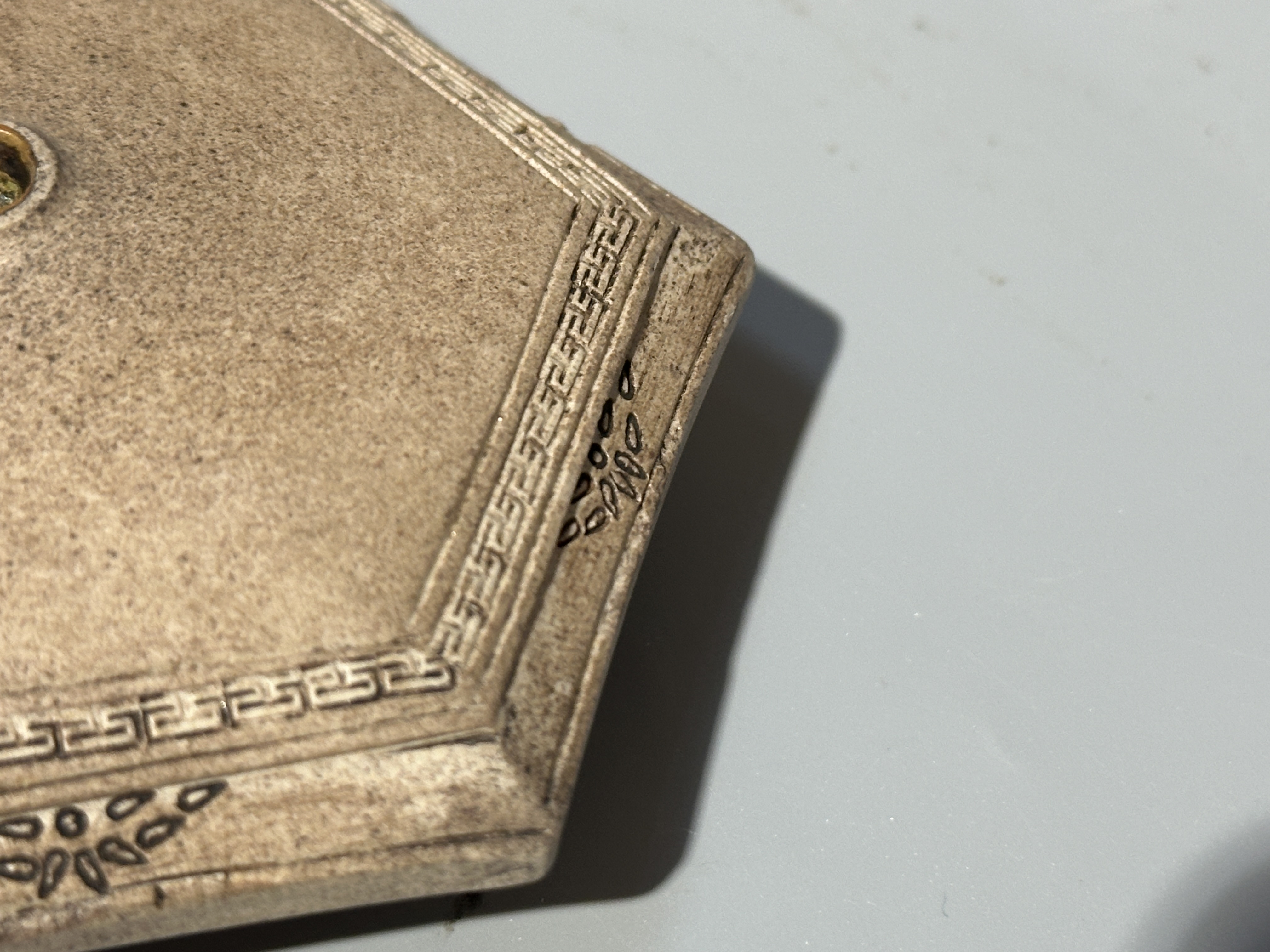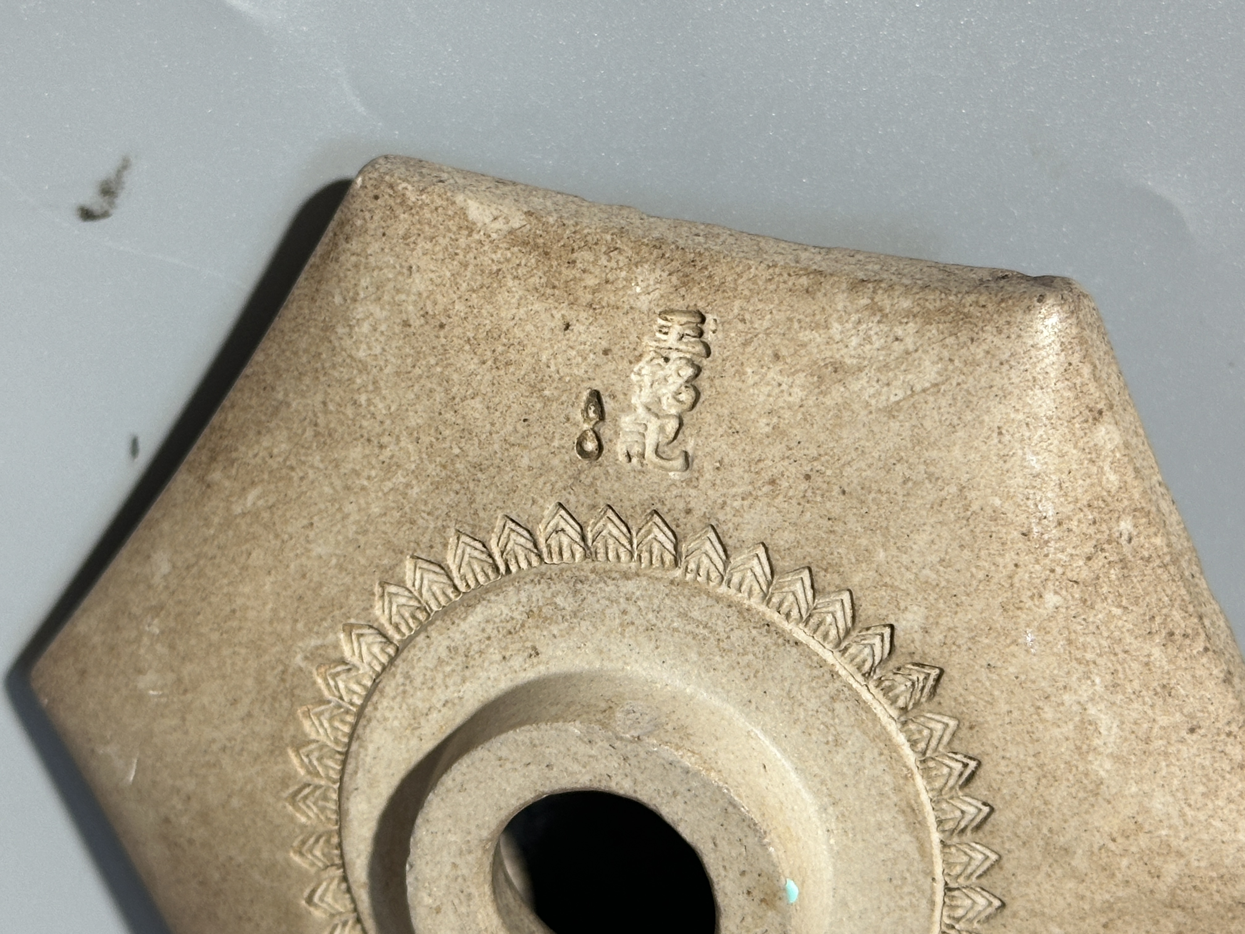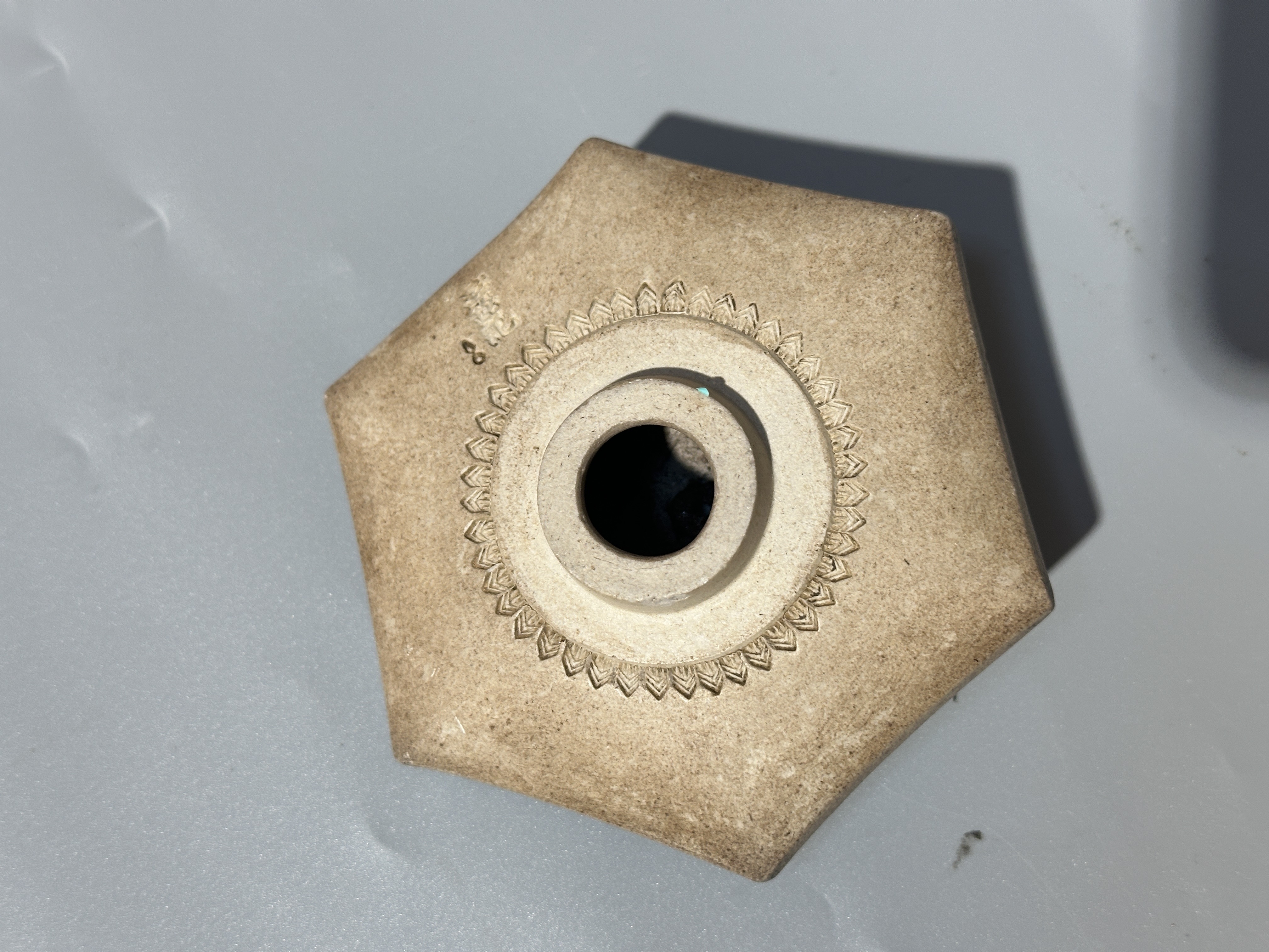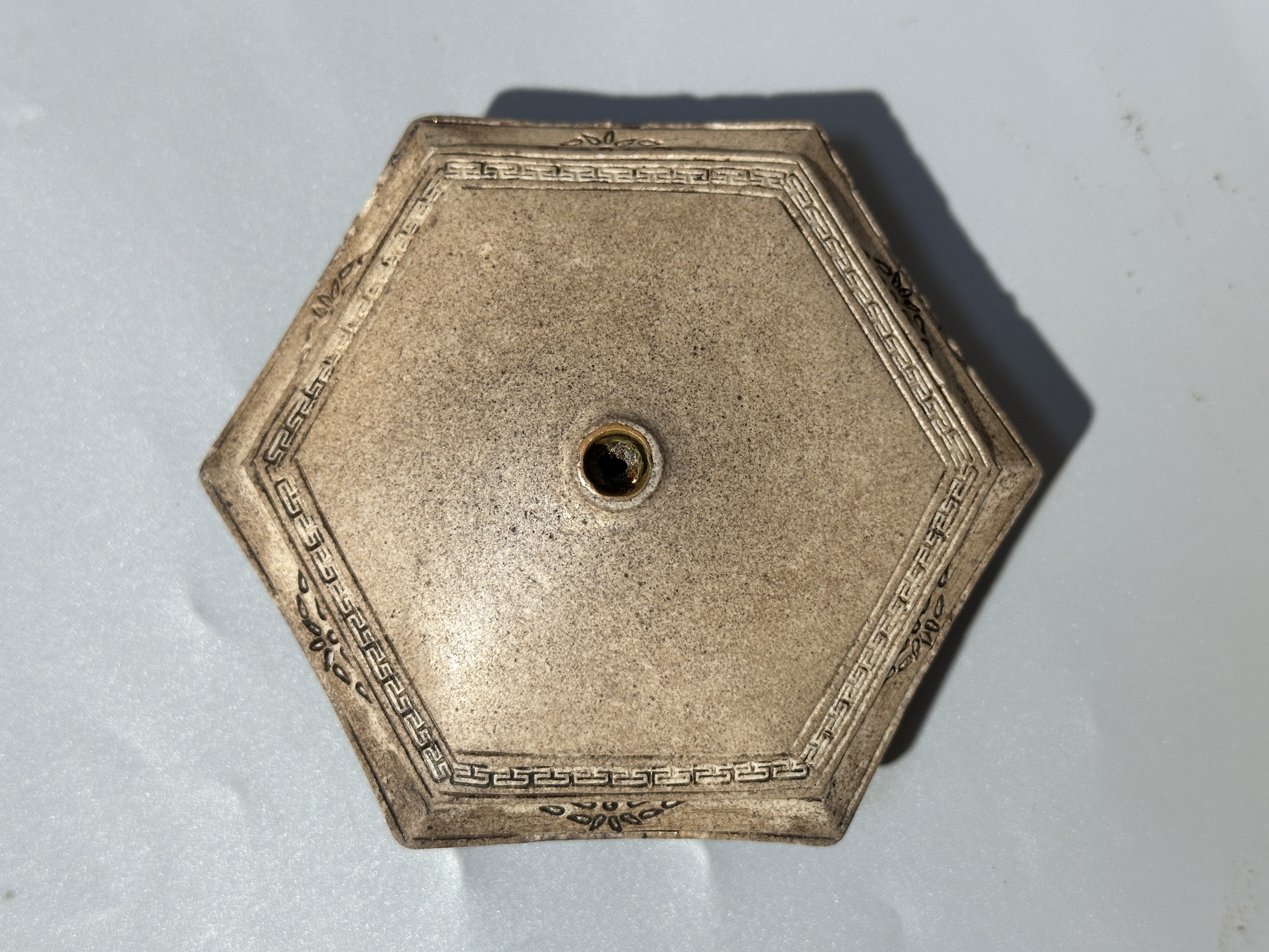 本品為一件罕見的六邊形紫砂白泥器物,形制古樸別緻。其造型取意天圓地方,上部為平整的六邊形平面,中央設一規整圓孔,孔周環飾浮雕般的太陽光芒紋,線條清晰而富有力道。器身斜腹內收,過渡自然,底部承接穩重的小足。通體施白泥,泥料純正,胎骨堅實,表面質感溫潤中見粗樸,流露出經年使用的自然包漿與潤澤。