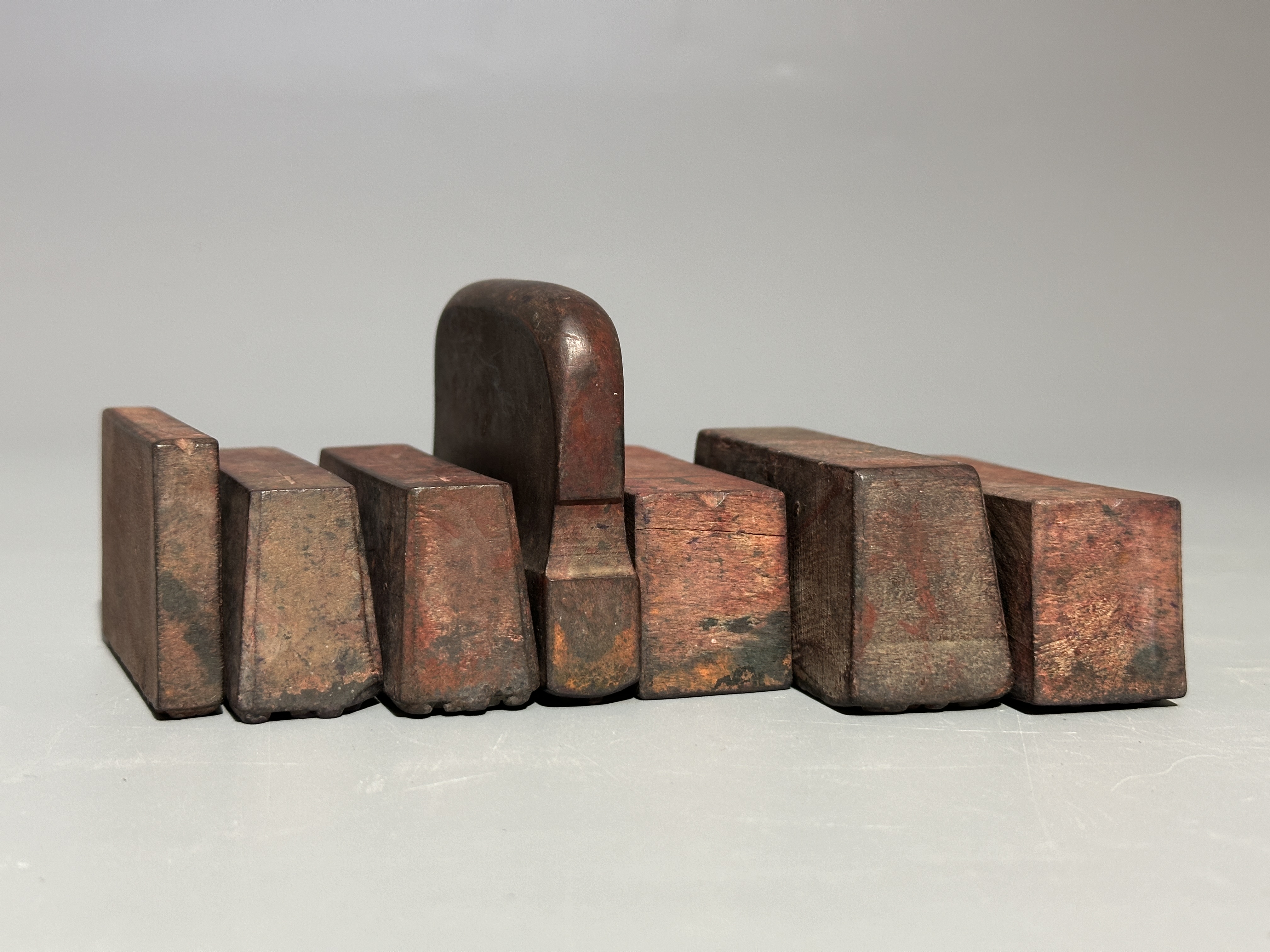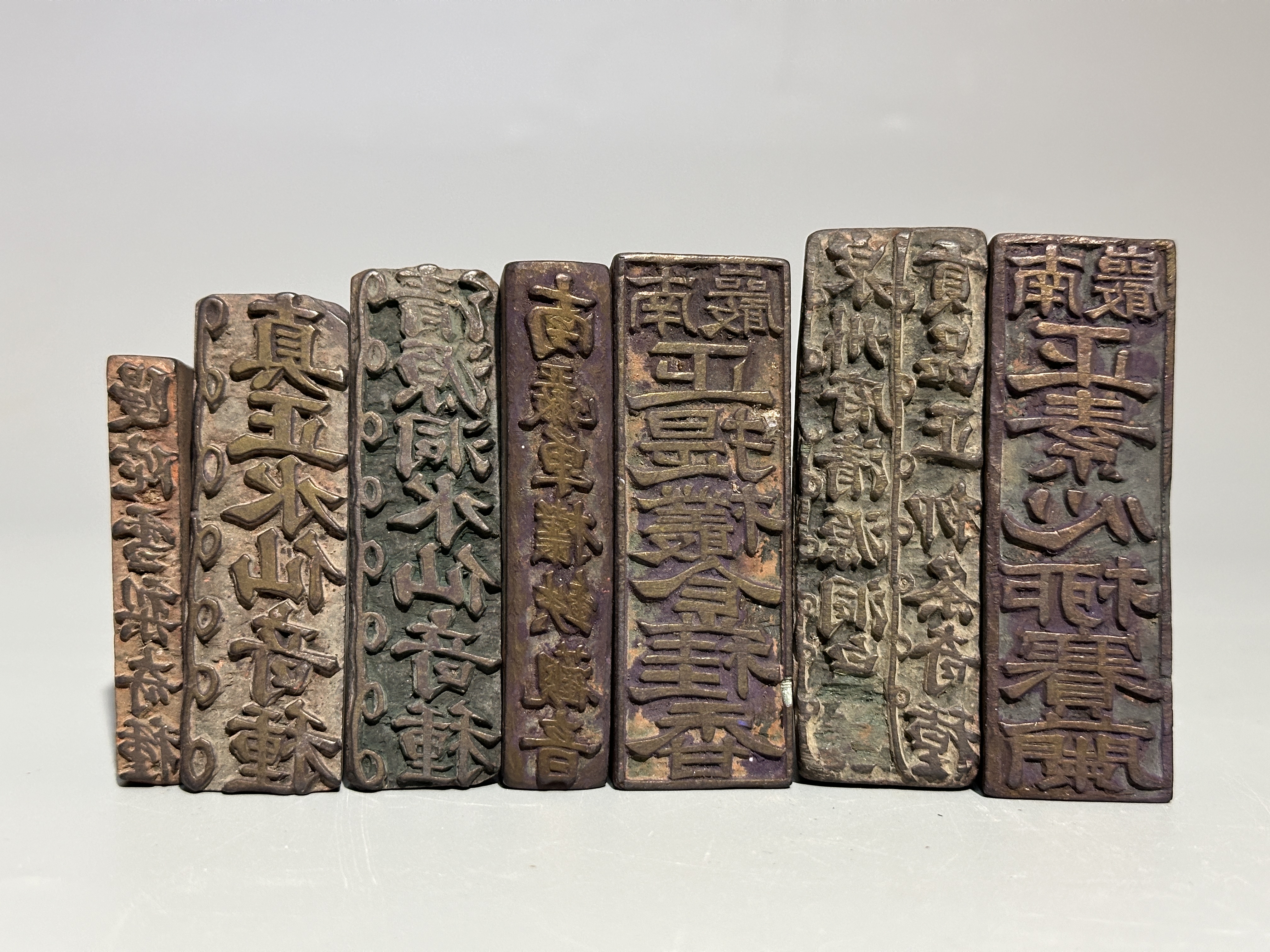 本拍品茶莊大印一顆茶名七顆。為八件組清朝茶莊印章,是研究清代台灣茶貿易與板橋林家家族產業極為珍貴的實物史料。大印文字清晰記載:「新竹林結源精製水沙連茶色如松羅本號發行,士商贈顧者請認本圖章為記庶不致誤。」水沙連茶,為最早有記錄的台灣茶,在清朝初年被記錄下來,因為最早在水沙連山區(今台灣南投縣)採集而得名。由野生茶樹採摘而來,可製成綠茶,被用於醫藥之用,可治熱病與下痢,一般相信茶樹品種為台灣原生種台灣山茶。又《諸羅縣志》:「水沙連內山茶甚夥,味別色綠如松蘿。山谷深峻,性嚴冷,能卻暑消脹。然路險,又畏生番,故漢人不敢入採,又不諳製茶之法。若挾能製武夷諸品者,購土番採而造之,當香味益上矣。」七顆茶名印則涵蓋了當時市場主流的高級茶種,包括「南巖正素心柳賽蘭」、「泉州府燙洞貢品正條奇種」、「南巖正提欉金桂香」、「清源洞水仙奇種」、「真正水仙奇種」、「慢陀雪梨奇種」以及「南巖單欉鐡觀音」,顯示茶莊經營種類廣泛,而林維源(板橋林家第四代族長)家族的發跡,正是始於桃園、新竹一帶的茶葉貿易。這套印章不僅印證了林家早期在新竹藉由茶葉累積財富的歷史,也見證了清末台灣茶產業的光輝。