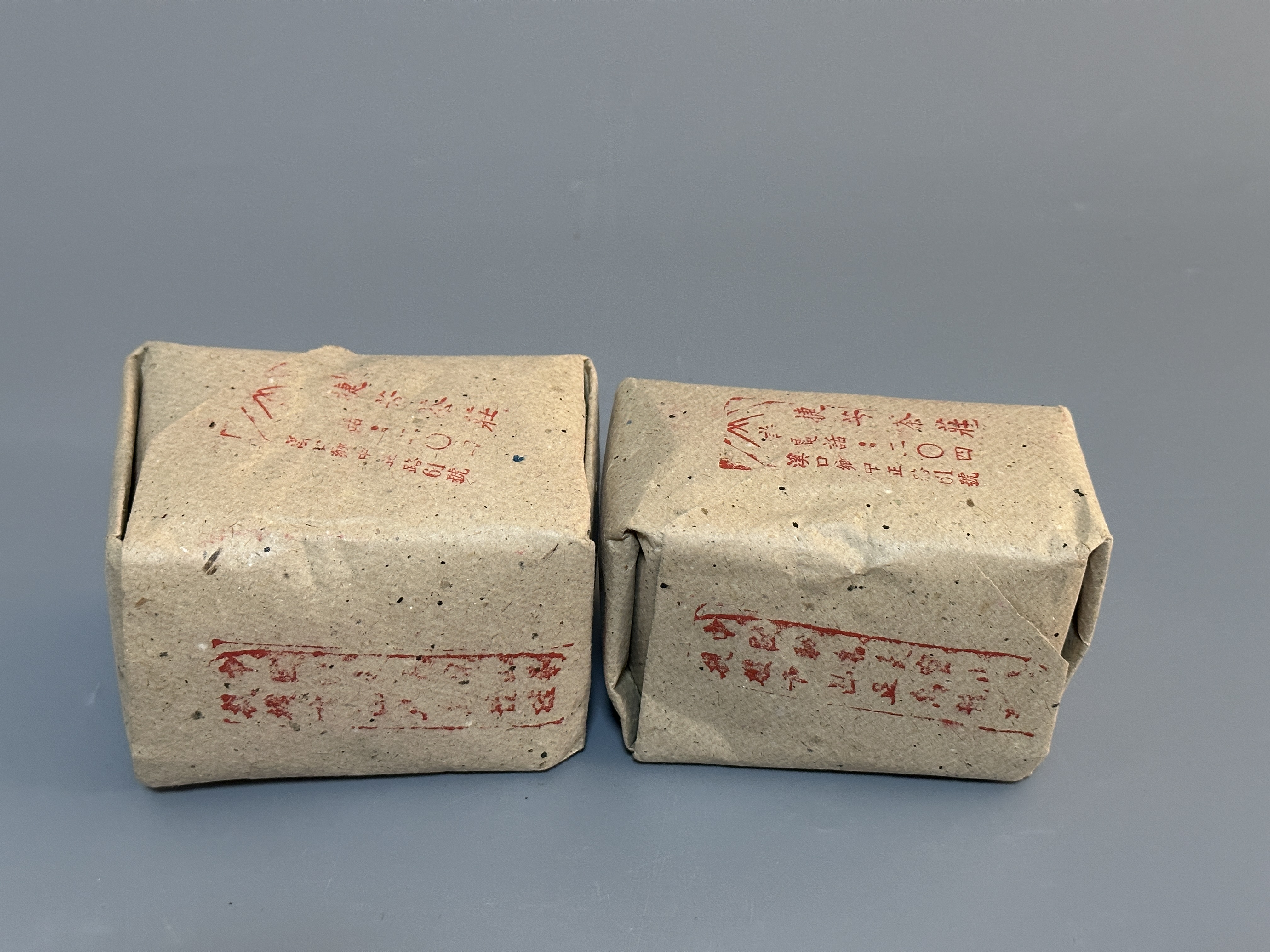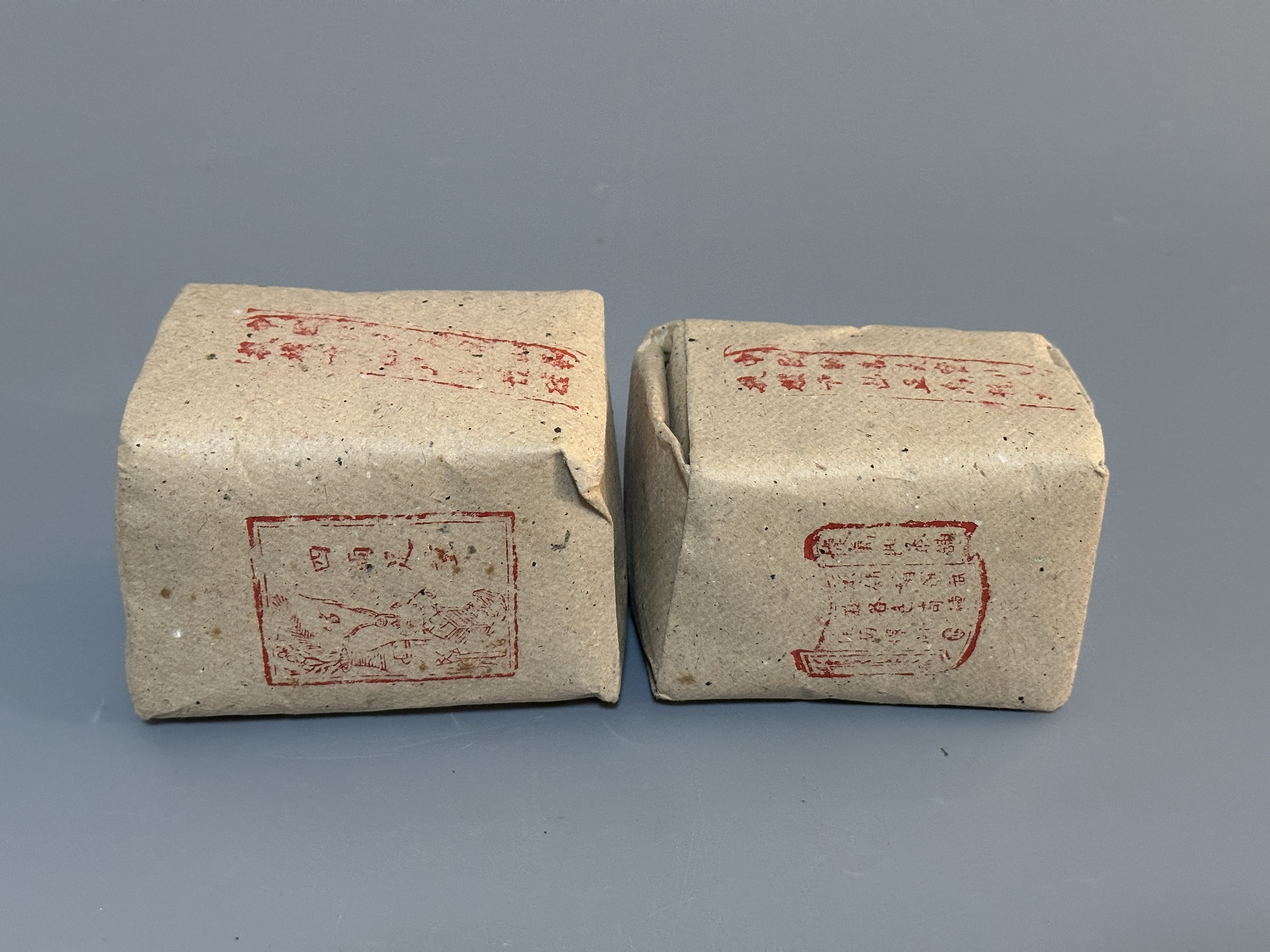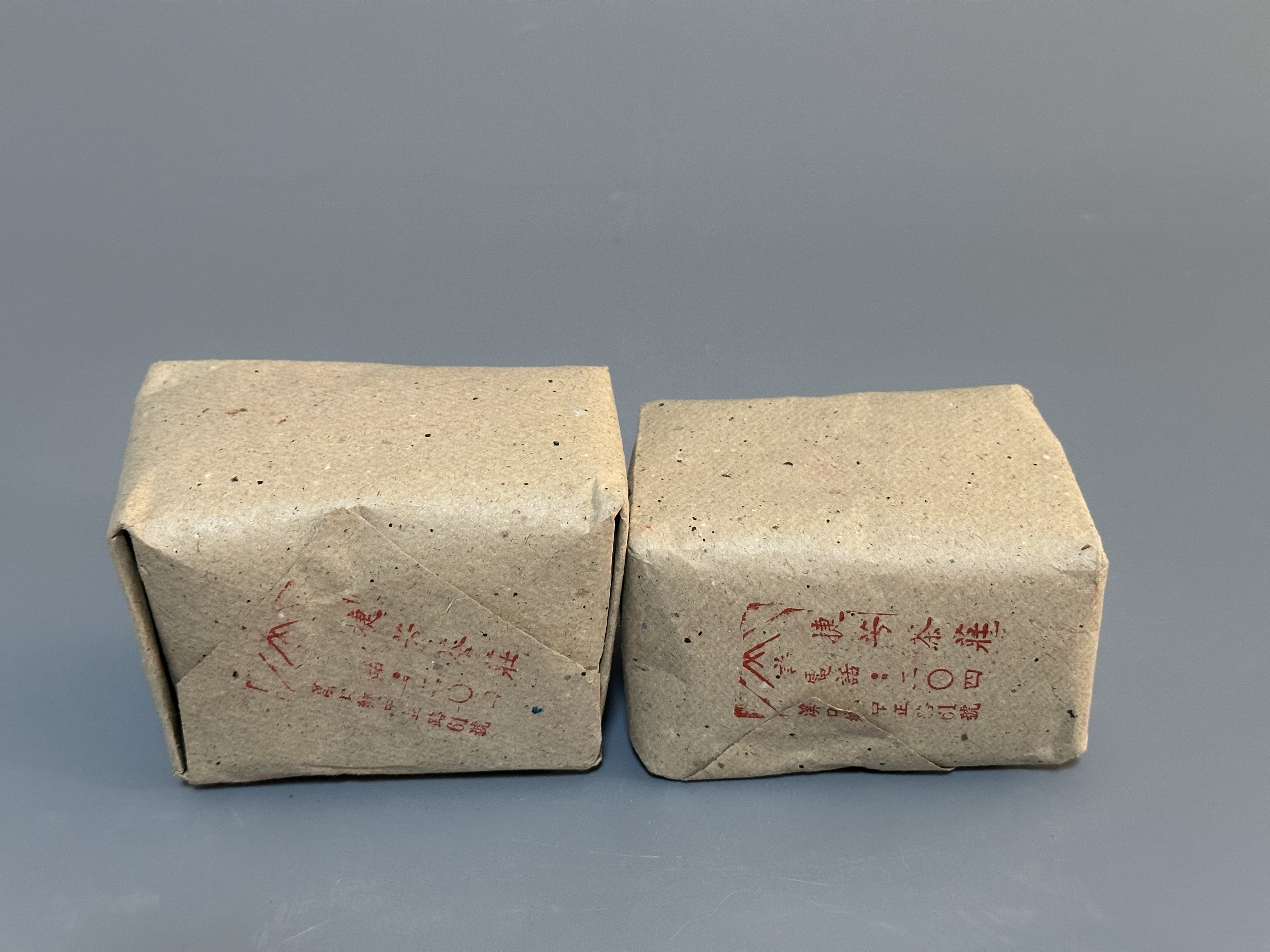此為兩包老字號“提芳茶莊”的原裝茶葉,儲存狀態極為難得。外包裝採用傳統厚實牛皮紙,紙面色澤溫潤,紋理自然,時代特徵明顯。每包茶葉正面及頂部均以清晰有力的紅色木刻印章,蓋印“提芳茶莊”商號名及“自磨香片”茶品名,字型古樸雅緻,硃砂印泥色澤沉穩。兩包並置,形制統一,包裝原整未拆,內部茶葉充實,為當時商號零售包裝的真實縮影。