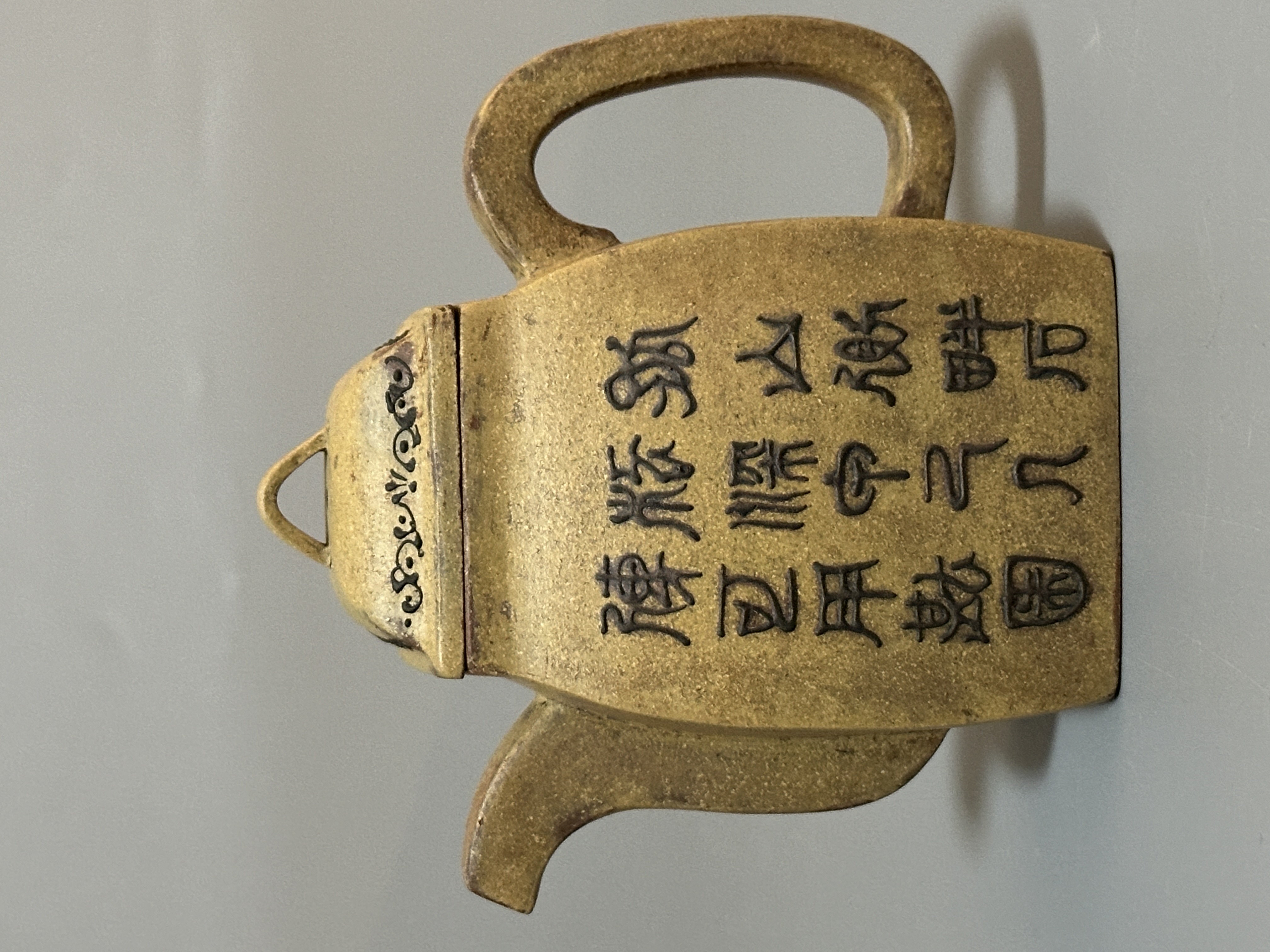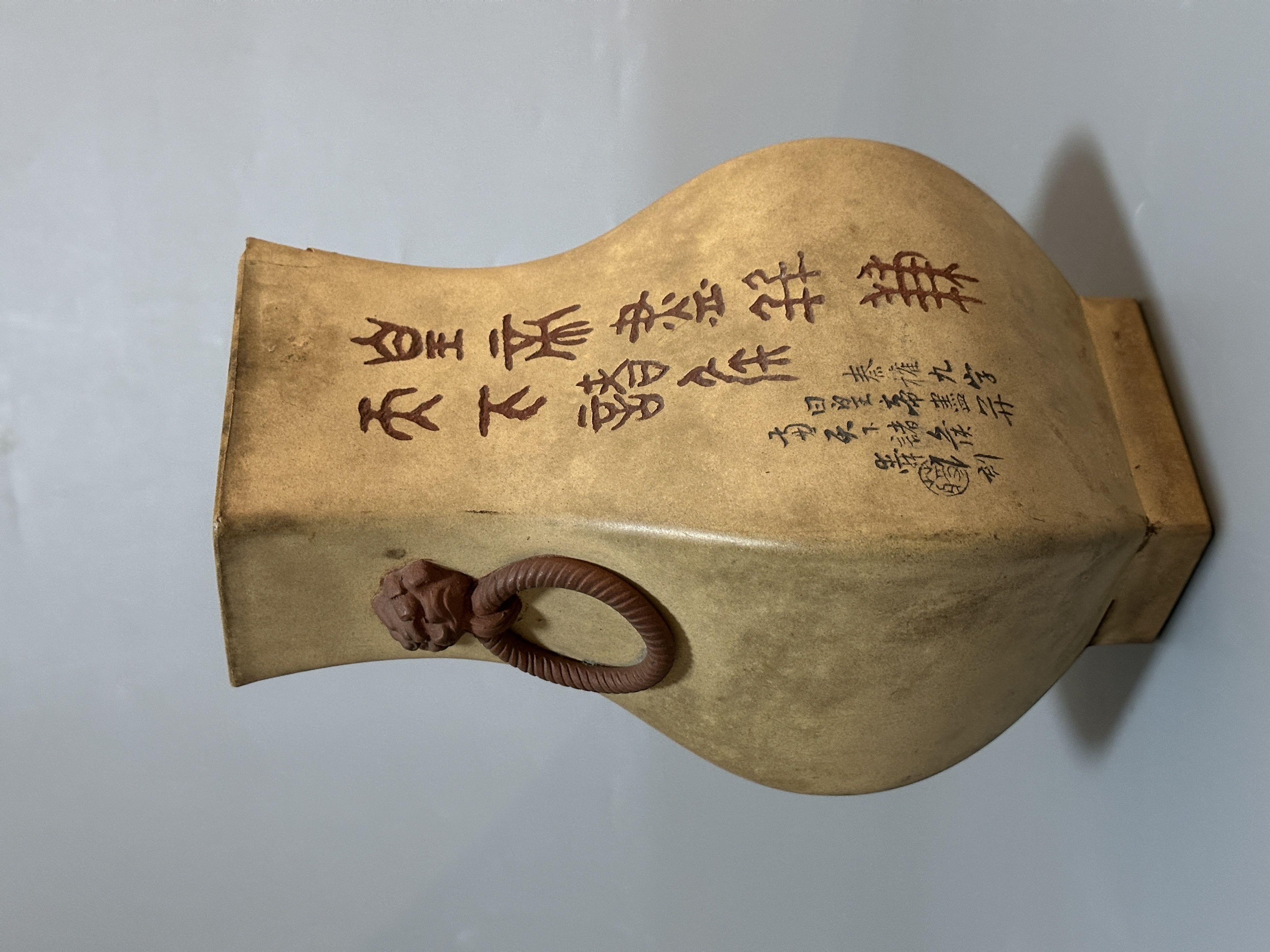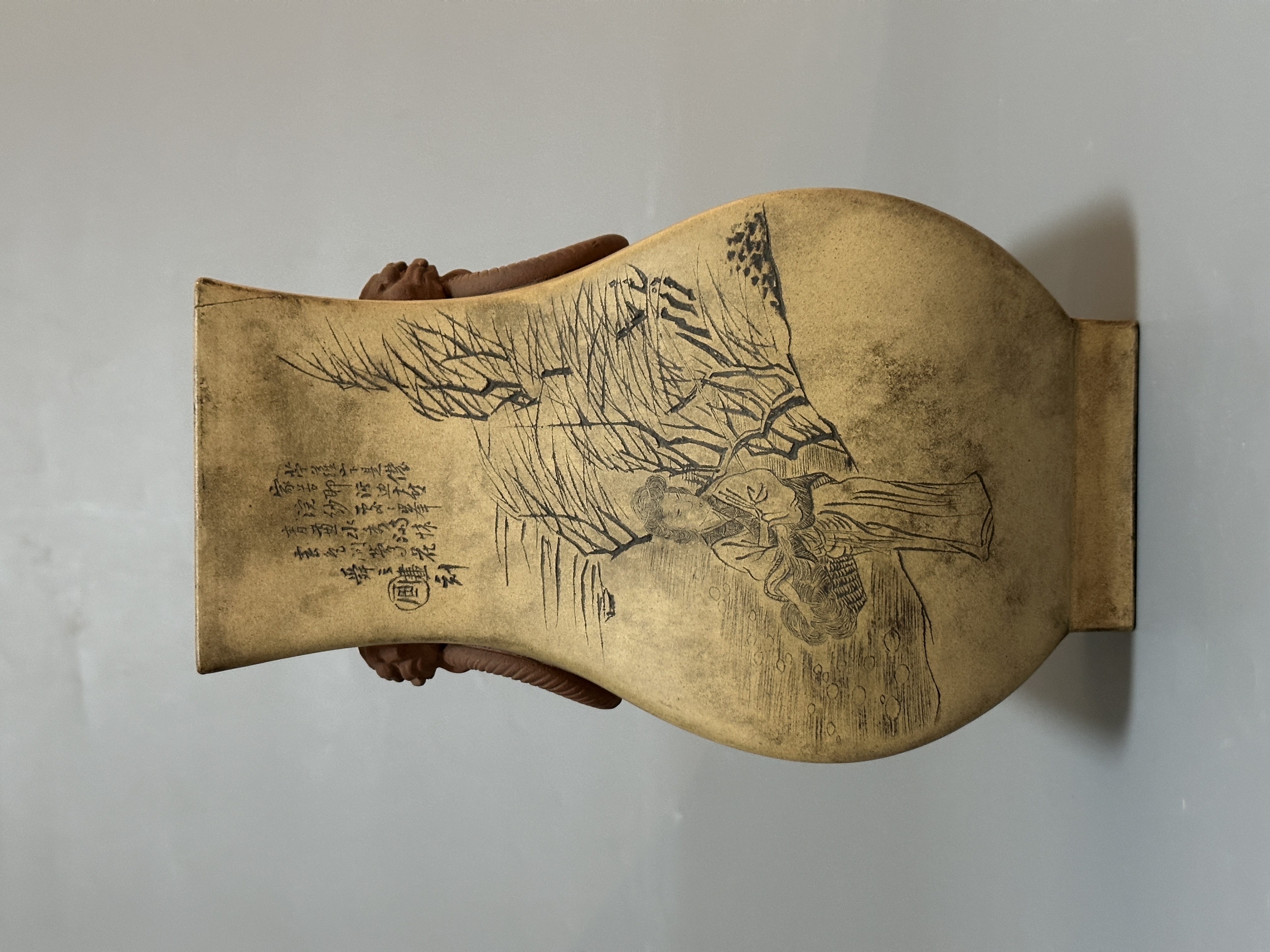 段泥花瓶作扁壺式高身,束頸、溜肩,器形修長而穩健,下承小長方形圈足,重心安定。 瓶腹一面以墨彩刻畫溪畔仕女,披襟負籃而行,旁有勁竹疏林,線條勁挺,富書畫意境。 上方題識行草,配以鈐印,形成「詩、書、畫、印」合一之文人式裝飾。段泥壺壺體作方折轉角,短流高把,蓋作橋鈕,整體輪廓簡練而具方正之勢。 器身正面以陰刻篆書銘文為飾,字勢挺拔,與花瓶之題詩相互呼應,顯示同一審美系統下的文人茶器風格。 段泥色澤溫潤泛黃,表面略帶窯斑,增添古雅氣息。