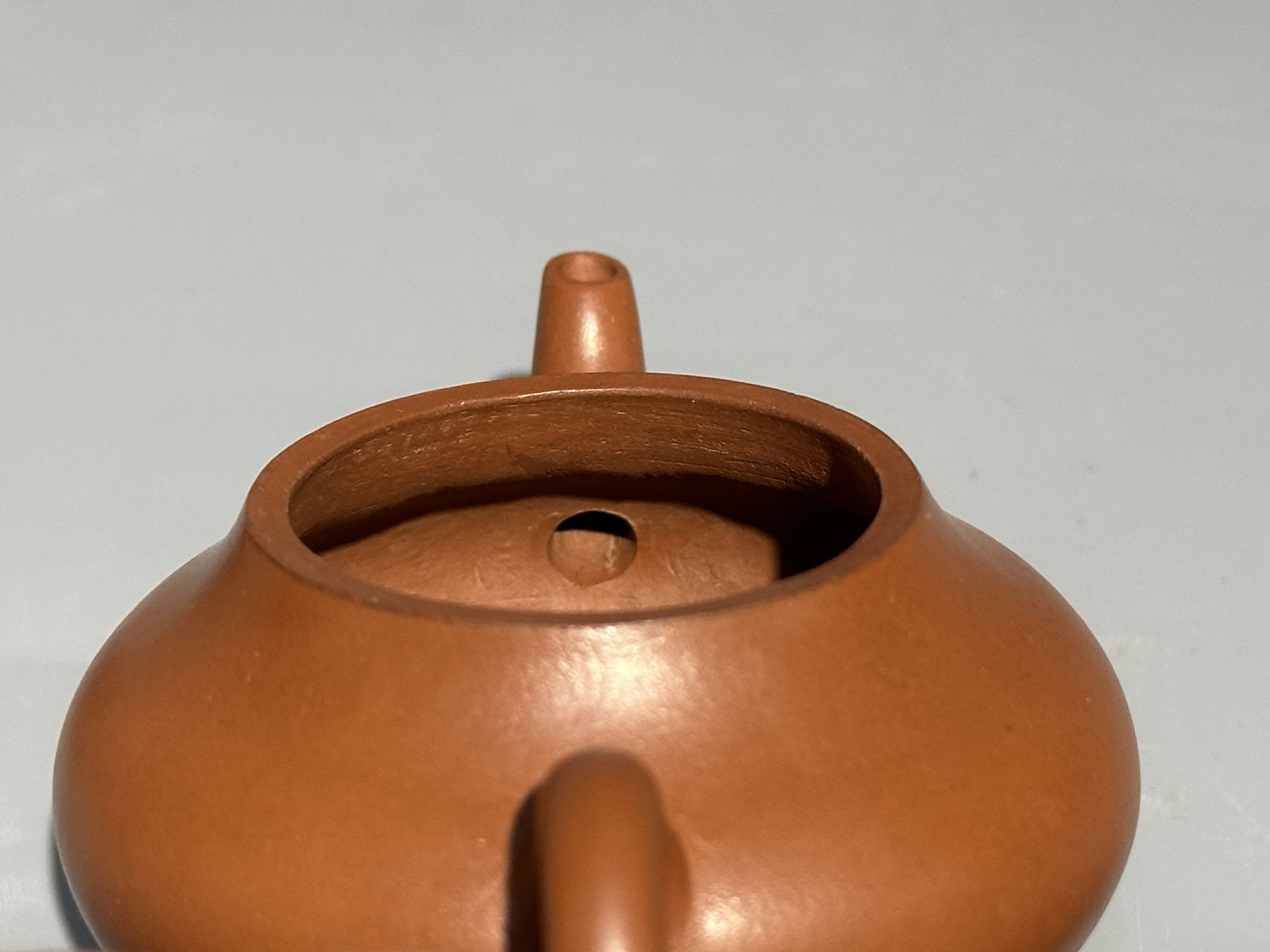 君德式為紫砂經典器型,此壺泥色暖棕瑩潤,器身呈矮梨形,豐腹斂底,氣韻圓融。為當代紫砂小品佳制。