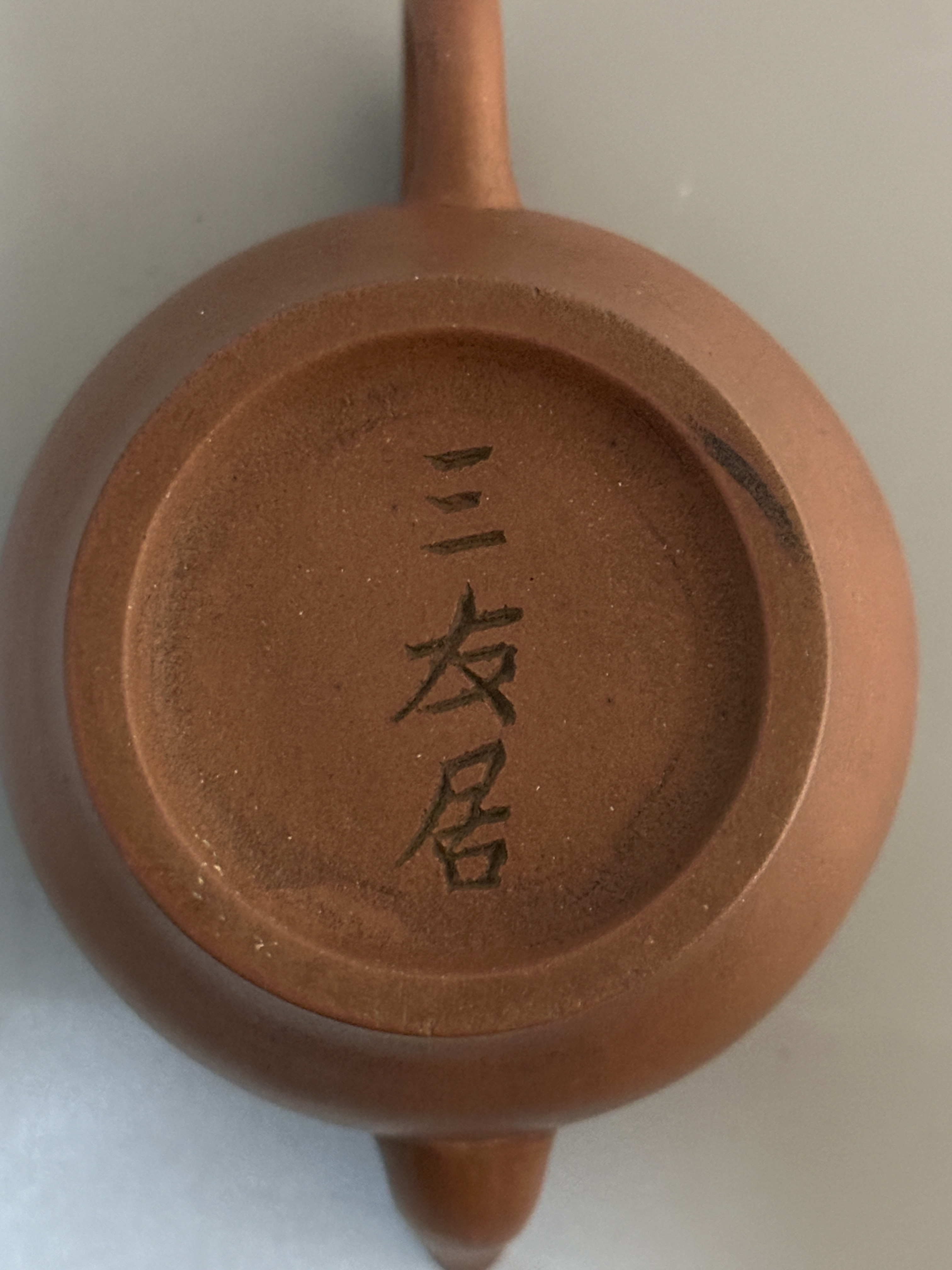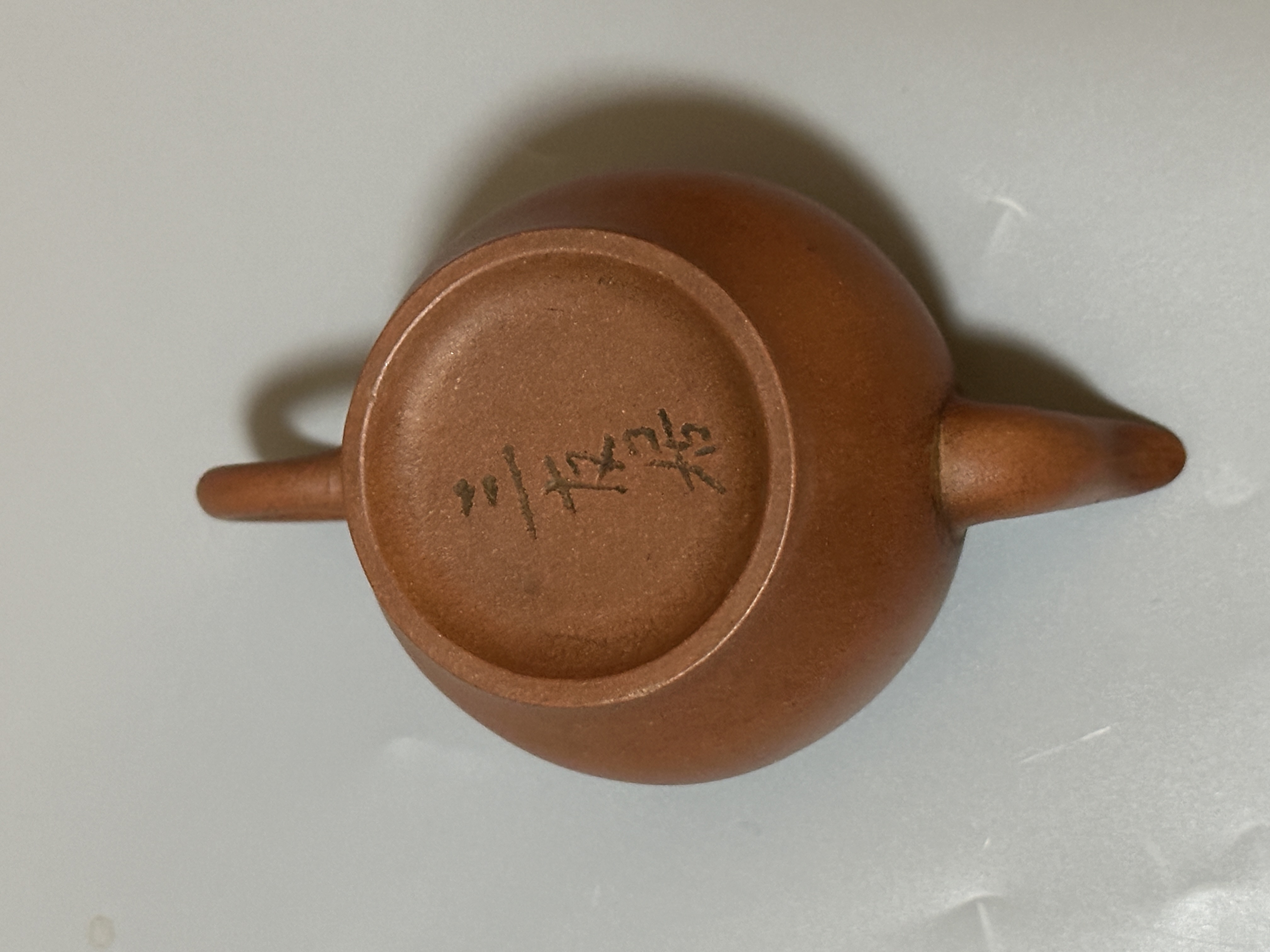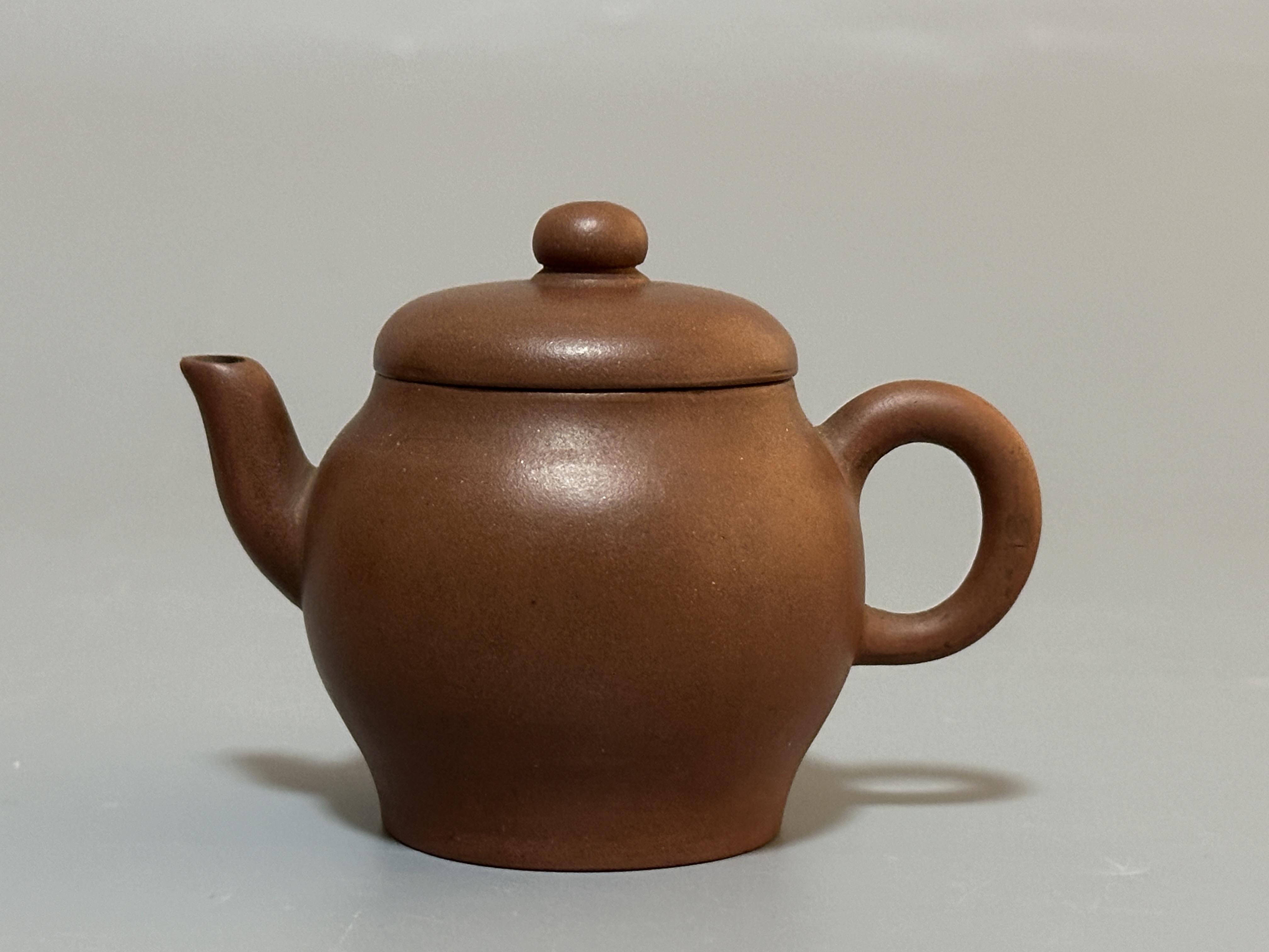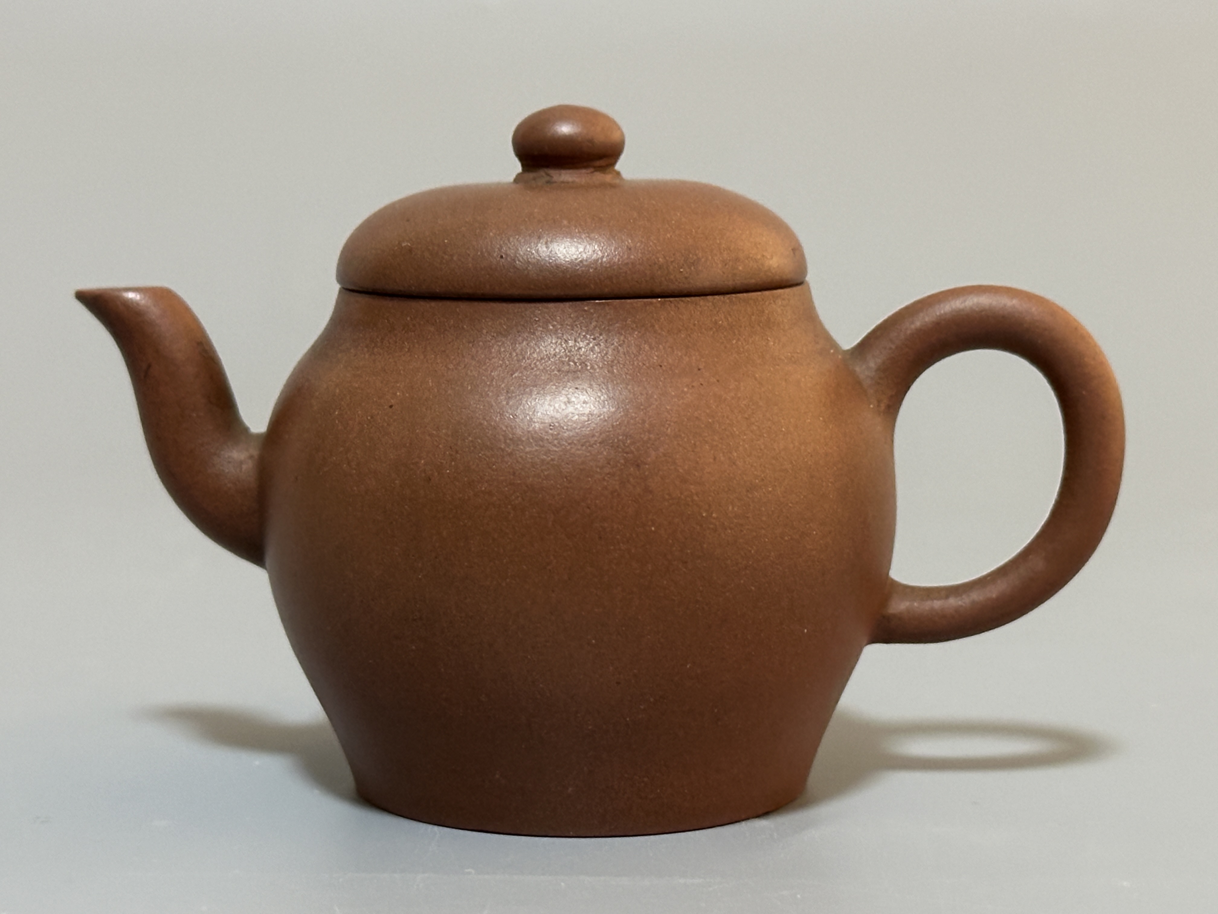 壺體作飽滿圓腹,短頸平肩,蓋作圓弧面,頂飾小圓鈕,線條轉折圓融,輪廓沉穩中見輕巧之姿。 流口微上翹,把環略外張,整體比例勻稱,既利於握持出水。 泥色溫潤呈栗褐,表面光澤內斂。
