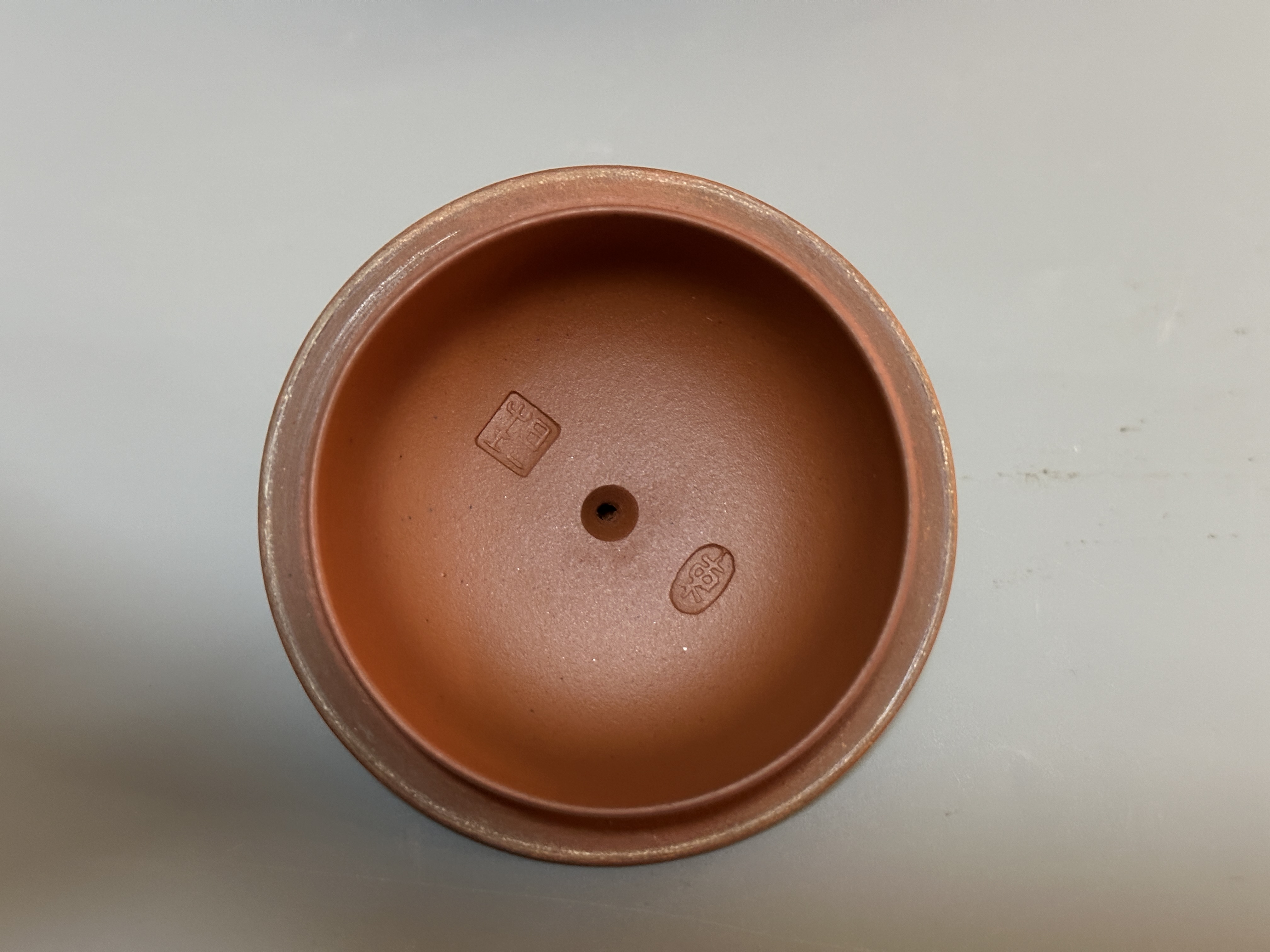 束旦生,1944年生於江蘇宜興。研究員級高級工藝美術師、江蘇省工藝美術名人、江蘇省陶瓷藝術名人、中國工藝美術協會會員、江蘇省工藝美術協會會員、江蘇省陶瓷協會會員、中國宜興紫砂文化藝術研究專委會委員。此壺色澤暖潤如赤金,器型圓渾飽滿,壺鈕作如意雲紋,耳形飛把暗合古意;蓋面以雙刀細刻書銘,筆法雋秀,刀工清勁。束旦生承任淦庭一脈,兼擅制壺與陶刻,此器工料相濟,文氣盎然,是其文人紫砂風格的典型代表。