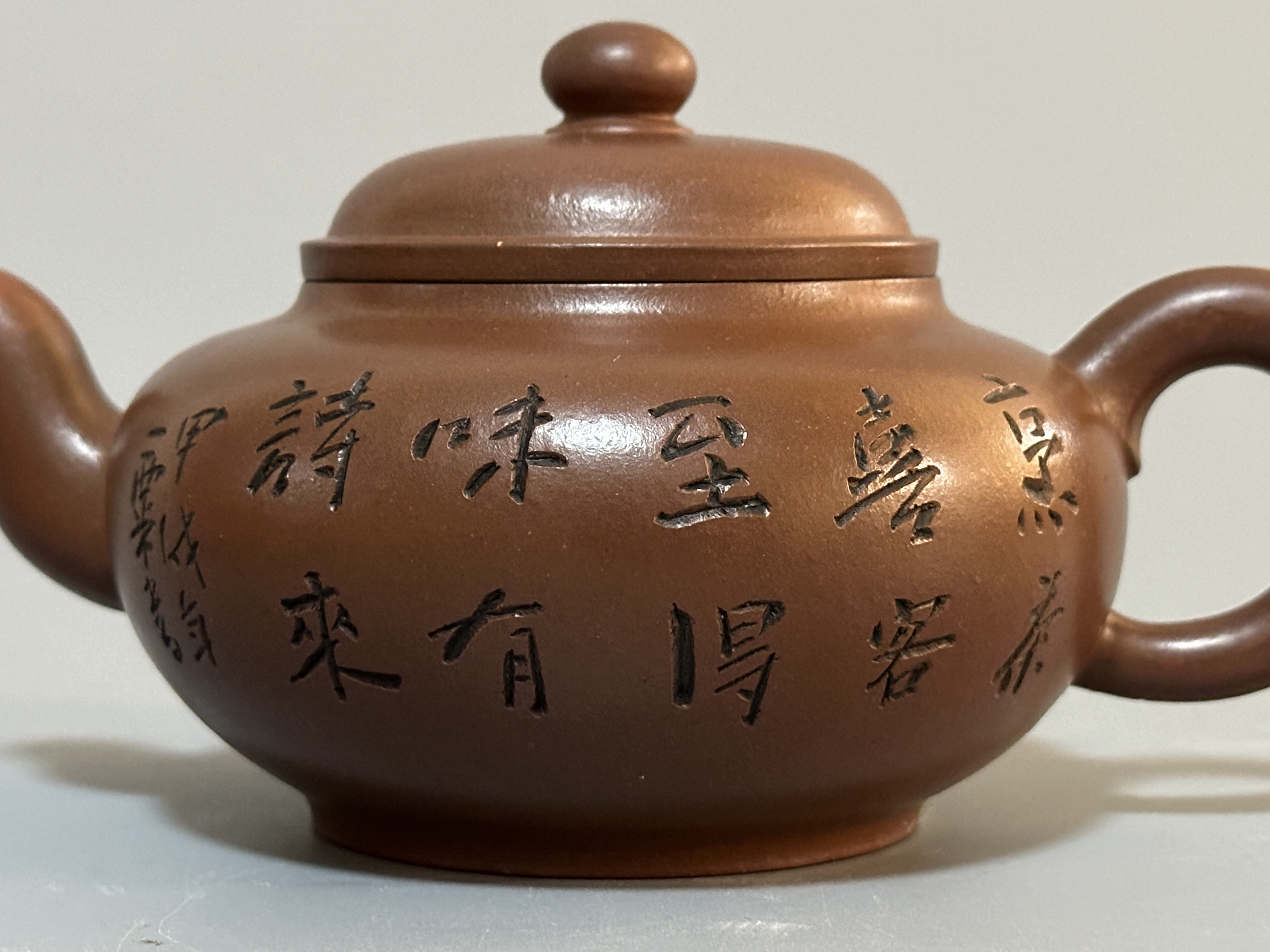 毛文傑,1968年生於中國陶都宜興陶藝世家。1983年進入江蘇省宜興紫砂工藝廠,隨父親毛國強(江蘇省工藝美術大師)學習陶刻裝飾,後師從吳群祥、季益順研習紫砂造型藝術。1988年赴中央工藝美術學院進修,期間拜壺藝泰斗顧景舟為師,並考入紫砂研究所。現為正高級工藝美術師。此壺為正高級工藝美術師毛文傑手制,其父中國陶瓷藝術大師毛國強親為題銘。壺取扁腹形制,泥色溫潤古雅,線條圓融挺括,口蓋嚴絲合縫,是毛氏父子紫砂壺的合璧之作。