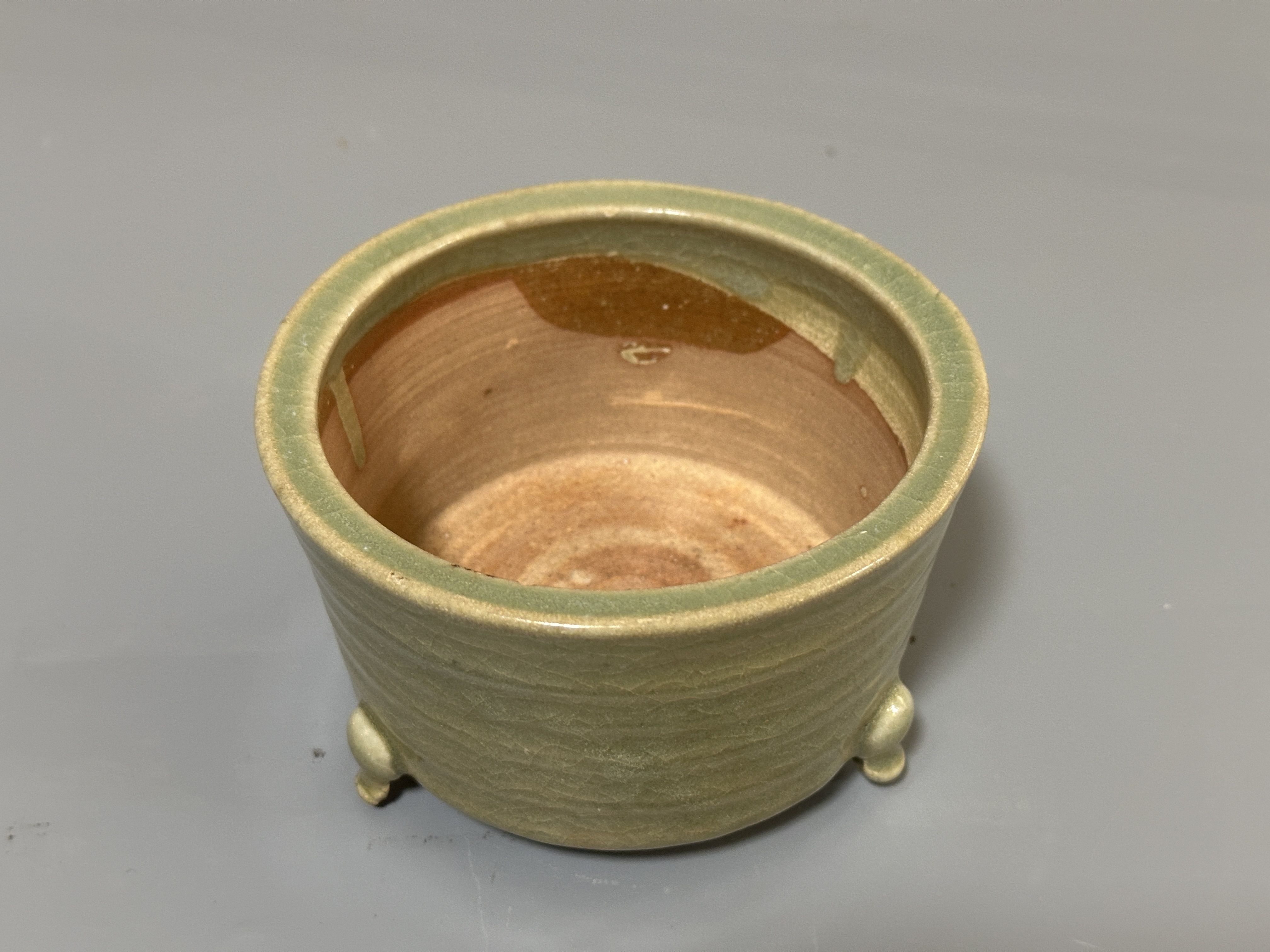 仿商周銅奩之制,作直口折沿、筒形深腹,腹壁飾數道弦紋,簡潔古雅,為元代龍泉窯經典器型;下承三矮足,造型飽滿敦實。通身施青釉,釉色呈溫潤冬青色,釉面開片細密自然,積釉處色濃如碧,露胎處可見火石紅。