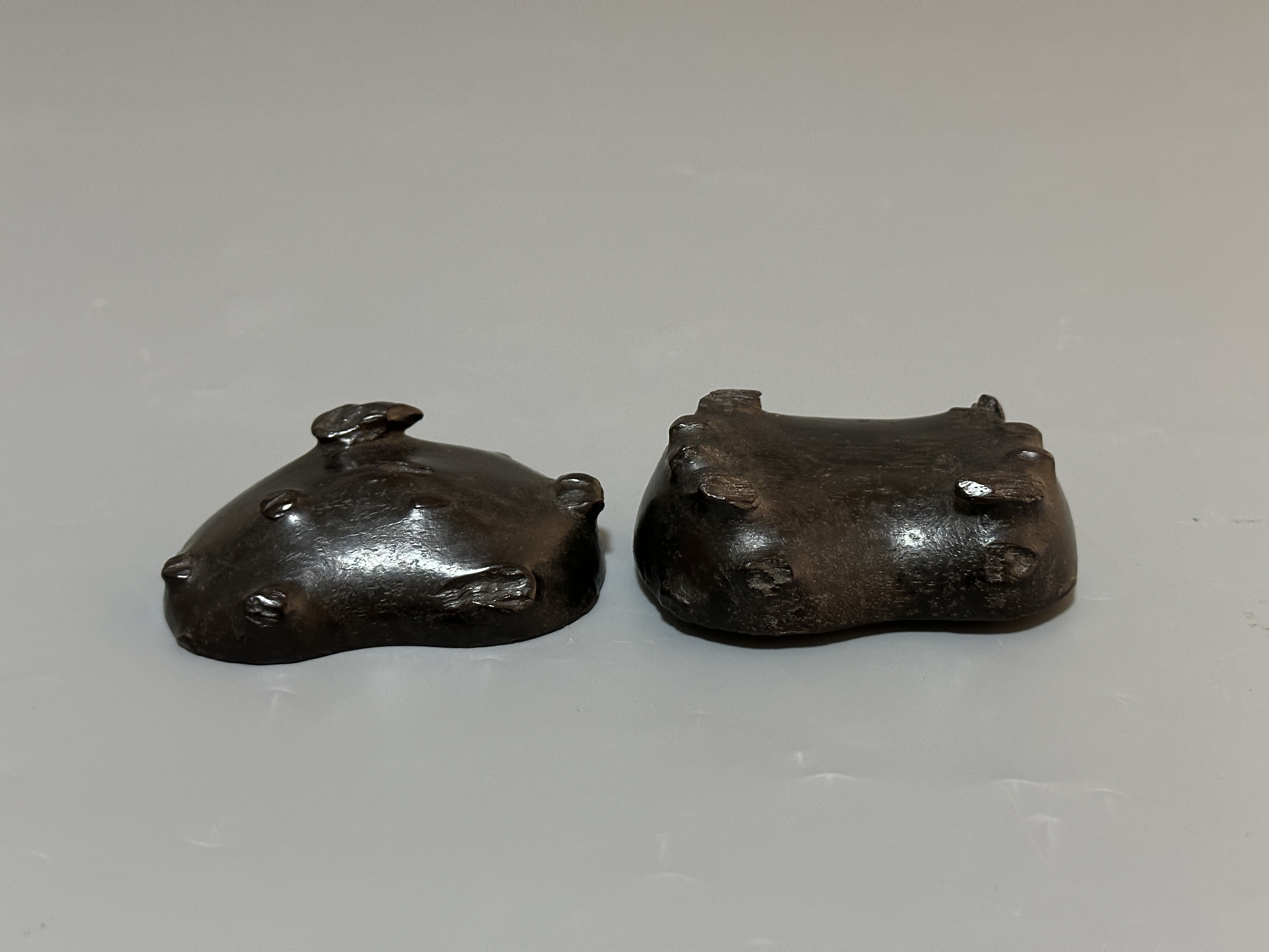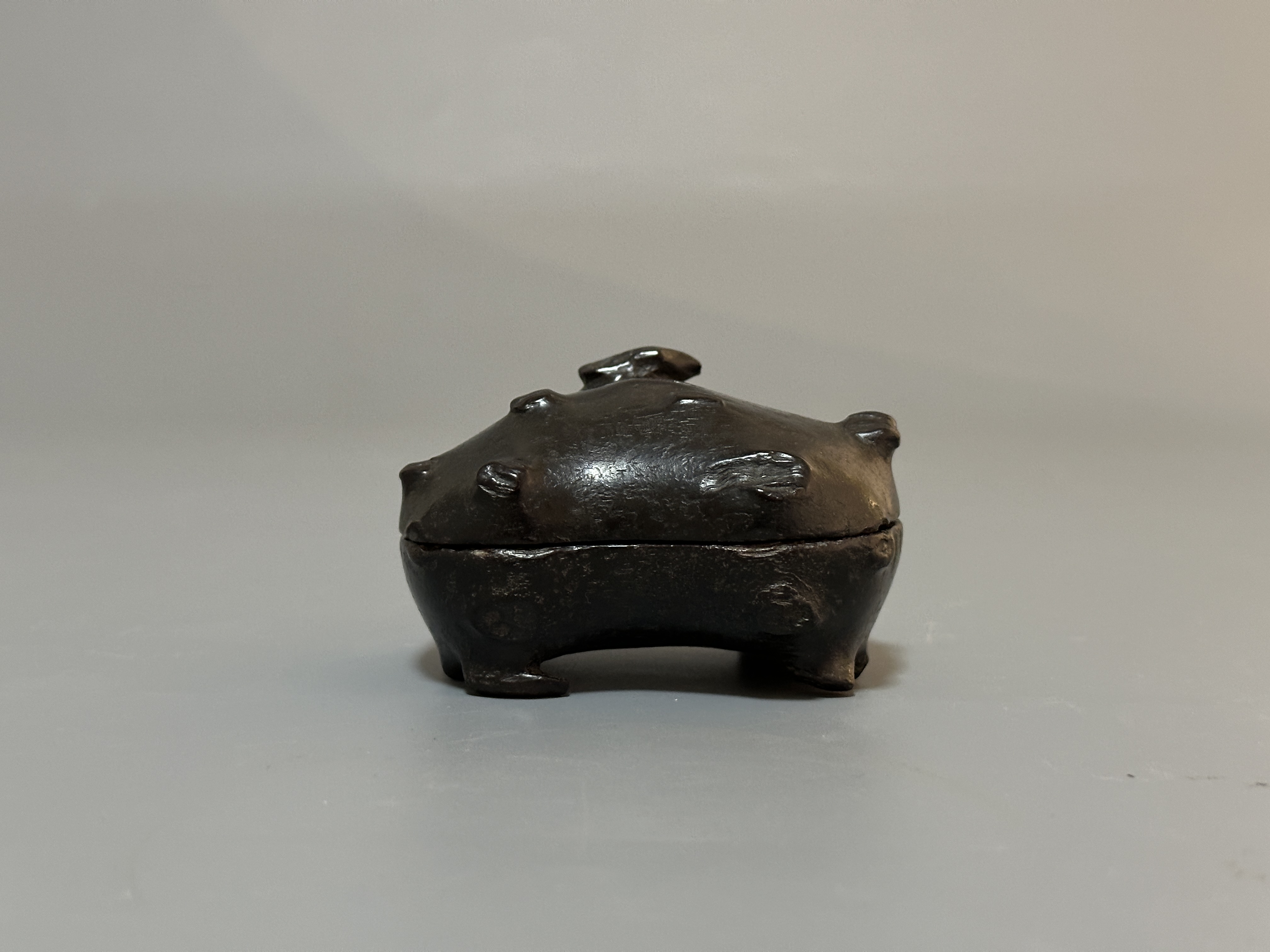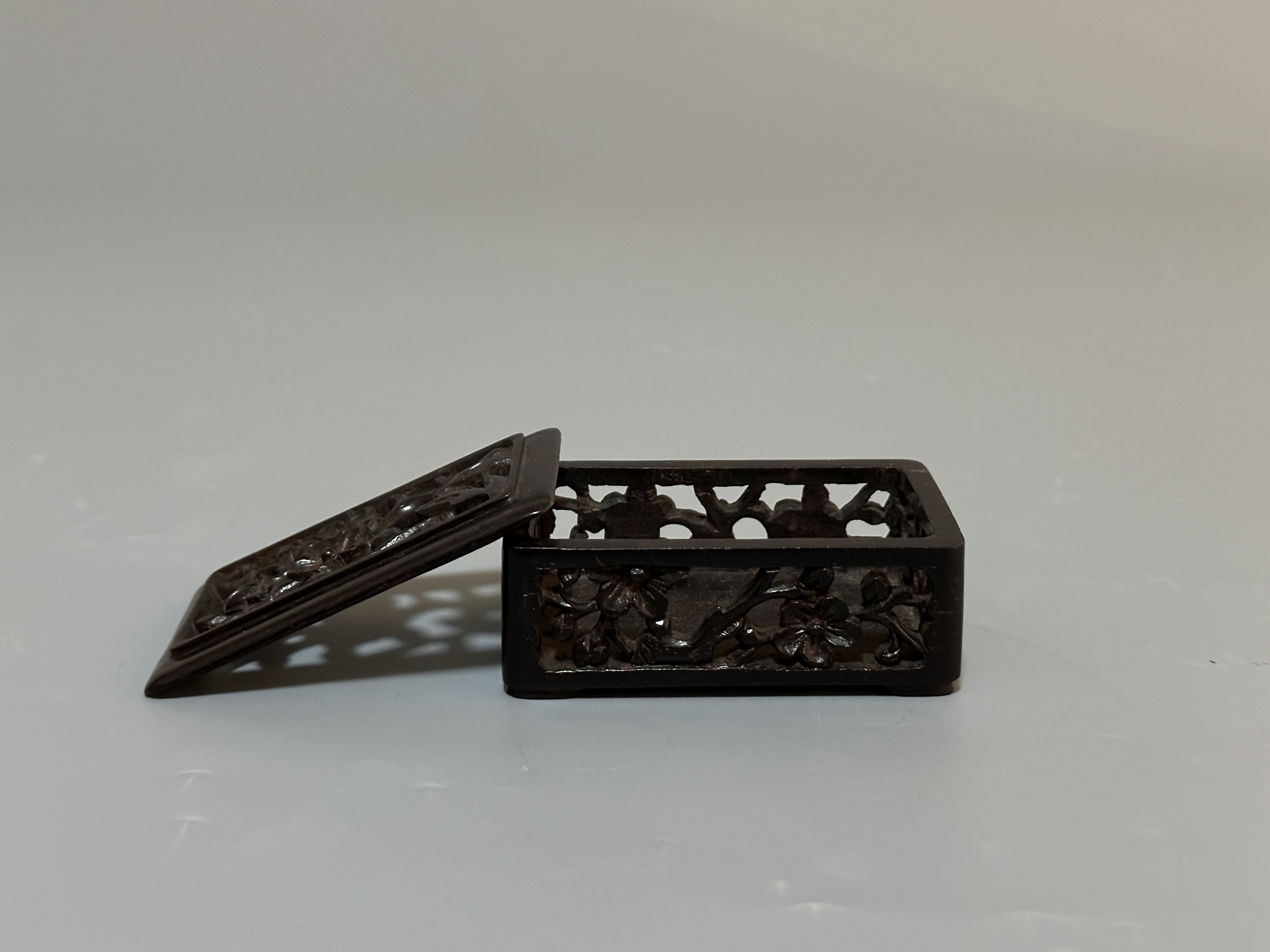 此器取紫檀為材,器表光潤瑩亮,包漿醇厚古雅。盒身與蓋均作透雕梅花紋:虯枝盤曲舒展,花瓣飽滿靈動,孔洞疏朗有致,雕工圓熟,兼具實用與賞玩價值,為案頭清供妙品。此香盒取紫檀根瘤整挖而成,隨形賦意,妙契天然。器足亦借根瘤自然凸起為形,古意盎然。