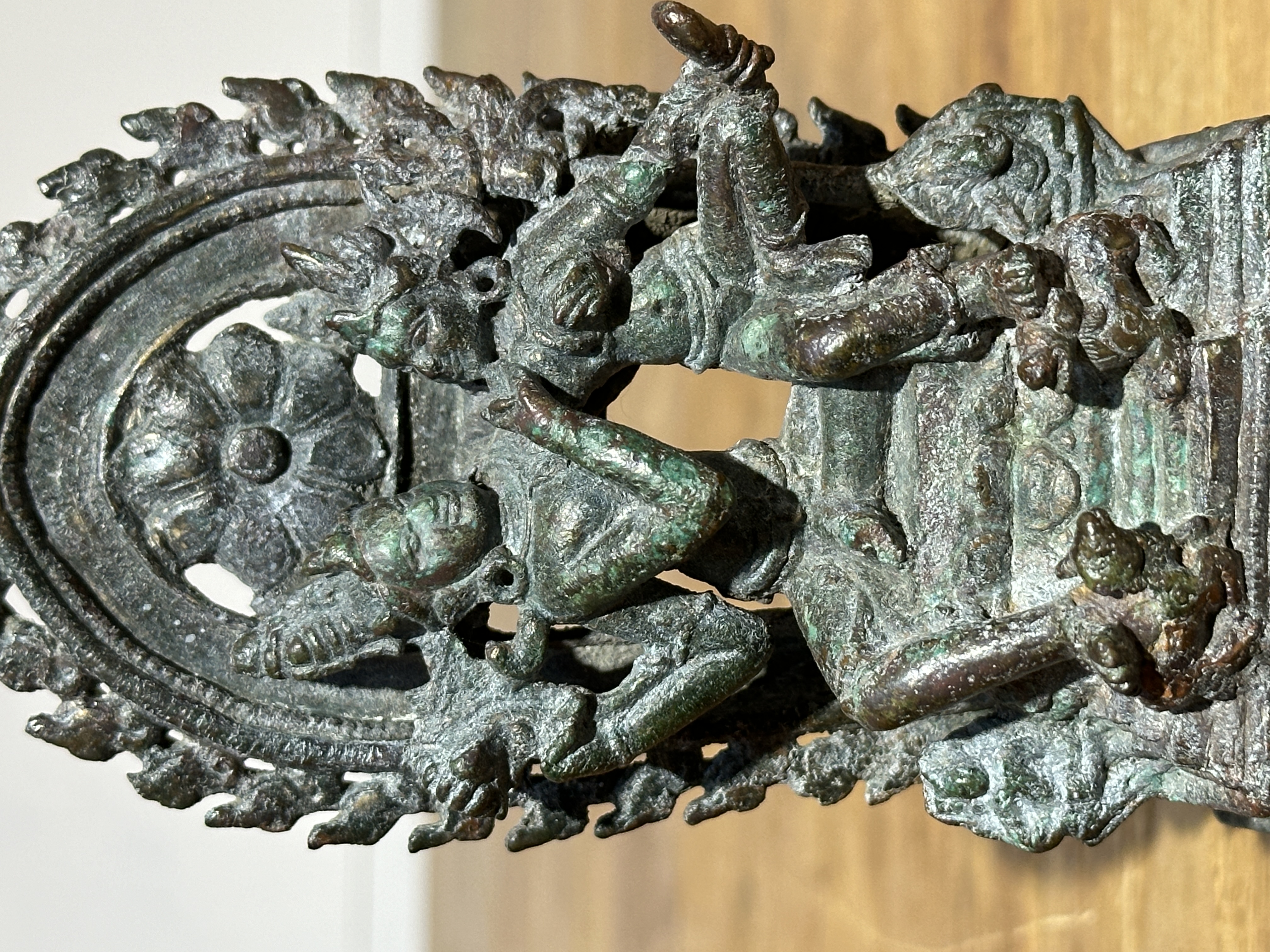 濕婆是印度教的三位主神之一,其性格充滿矛盾,代表生殖和創造,也代表破壞和毀滅。濕婆及雪山神女裝飾細緻,上身袒露,胸前配戴瓔珞,戴纏蛇形臂釧、釧環。濕婆攢髮盤髻,寶冠成塔,裝飾繁複,體態端莊內斂,右手舒展,左手扶著妻子的胸部。妻子帕瓦爾蒂頂飾層塔形法冠,形貌端莊,側坐在濕婆曲起的左腿上,右手自然搭於其肩,腳踏仰蓮台,體態豐腴,為典型帕拉王朝的造像風格。