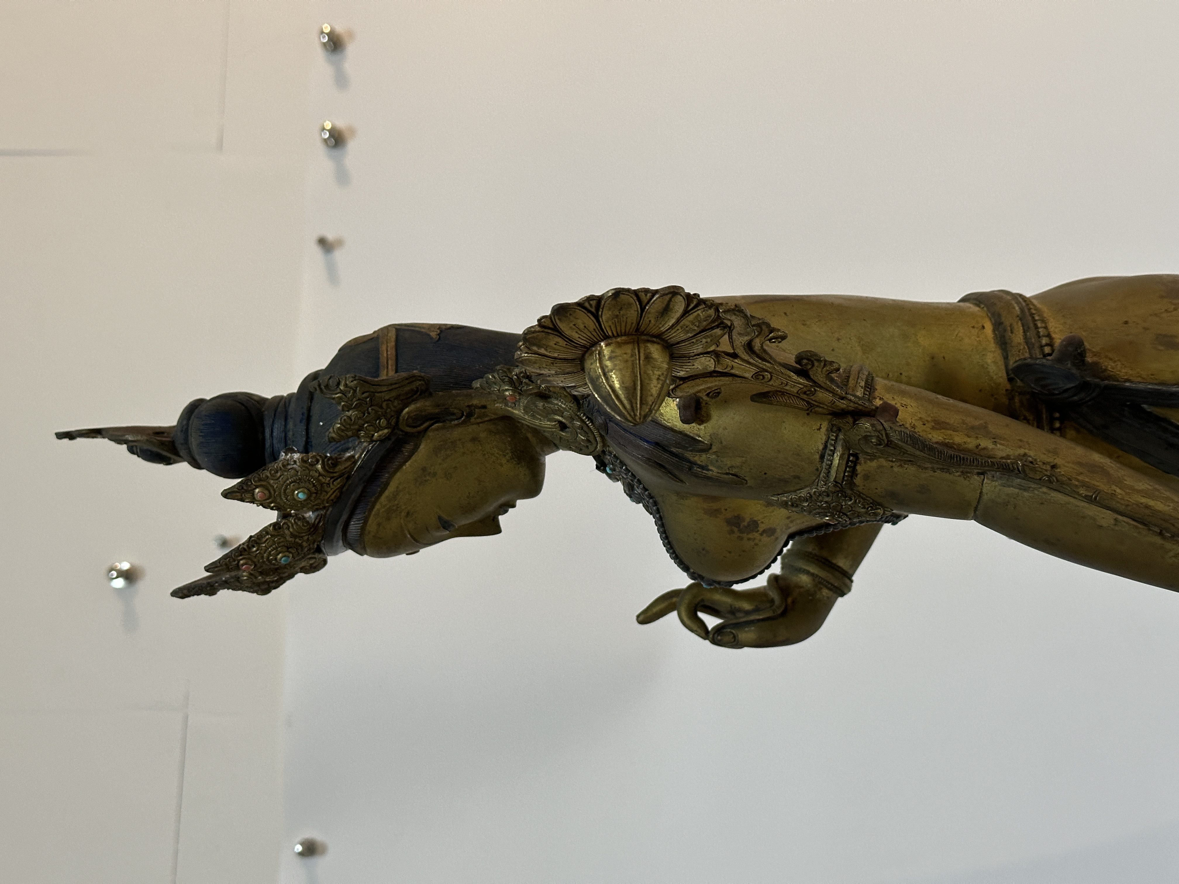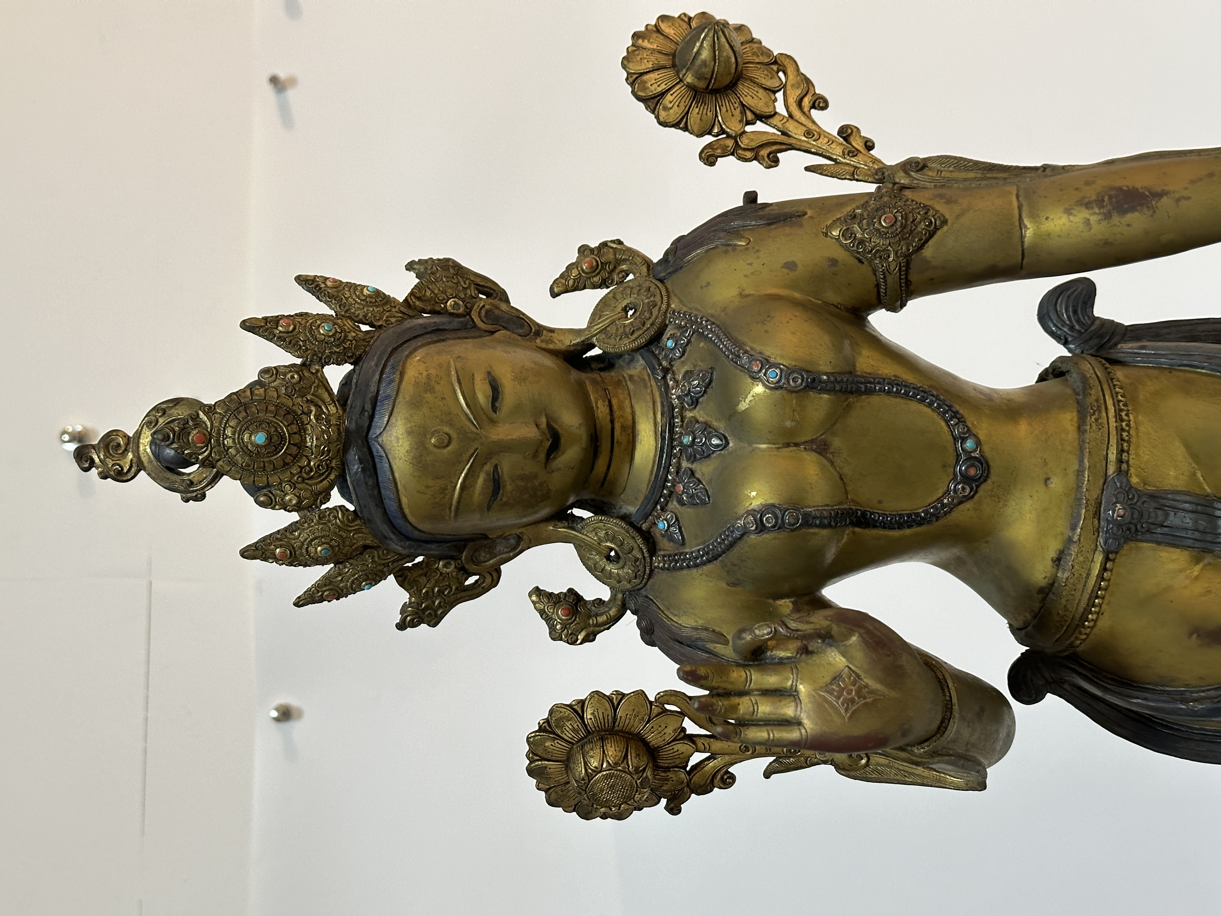 這尊立姿銅鎏金貼蓮花尊為藏傳佛教蓮花手菩薩像,呈優美S形立姿,通體鎏金工藝精湛,頭戴華麗花冠高髻頂飾摩尼寶珠,面容飽滿慈祥細眉長眼微俯視,雙臂釵插蓮花,左手下垂握枝右手當胸虛握,足踏仰覆雙層蓮花座座。銅胎厚重明亮。