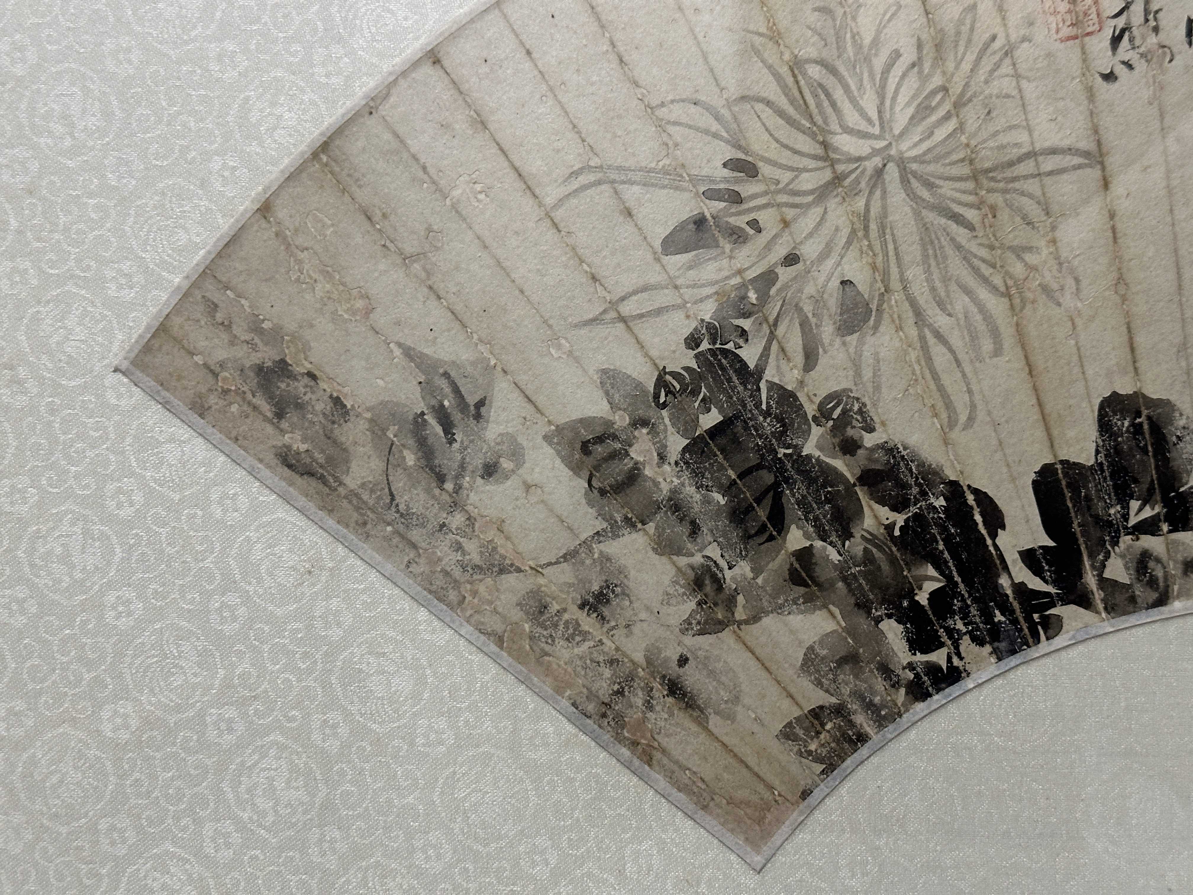 "中文說明:謝琯樵(1811-1864),原名謝穎蘇,清朝台灣畫家,與沈瑤池、汪志周等為創始人的""詔安畫派"",在中國美術界獨樹一幟,享有很高的聲譽。 ""詔安畫派""對台灣書畫藝術影響很大。最早將詔安書畫藝術帶到台灣的是謝穎蘇,因而被譽為""台灣美術的開山祖師""。謝穎蘇主張繪畫要有""神骨""、""氣""、""品""、""逸韻"",以達到""簡淡之致""。他的畫理,注重直逼鄭板橋的墨竹圖筆意、筆外神韻。此作品左右兩邊均繪有菊花,意境高潔。"