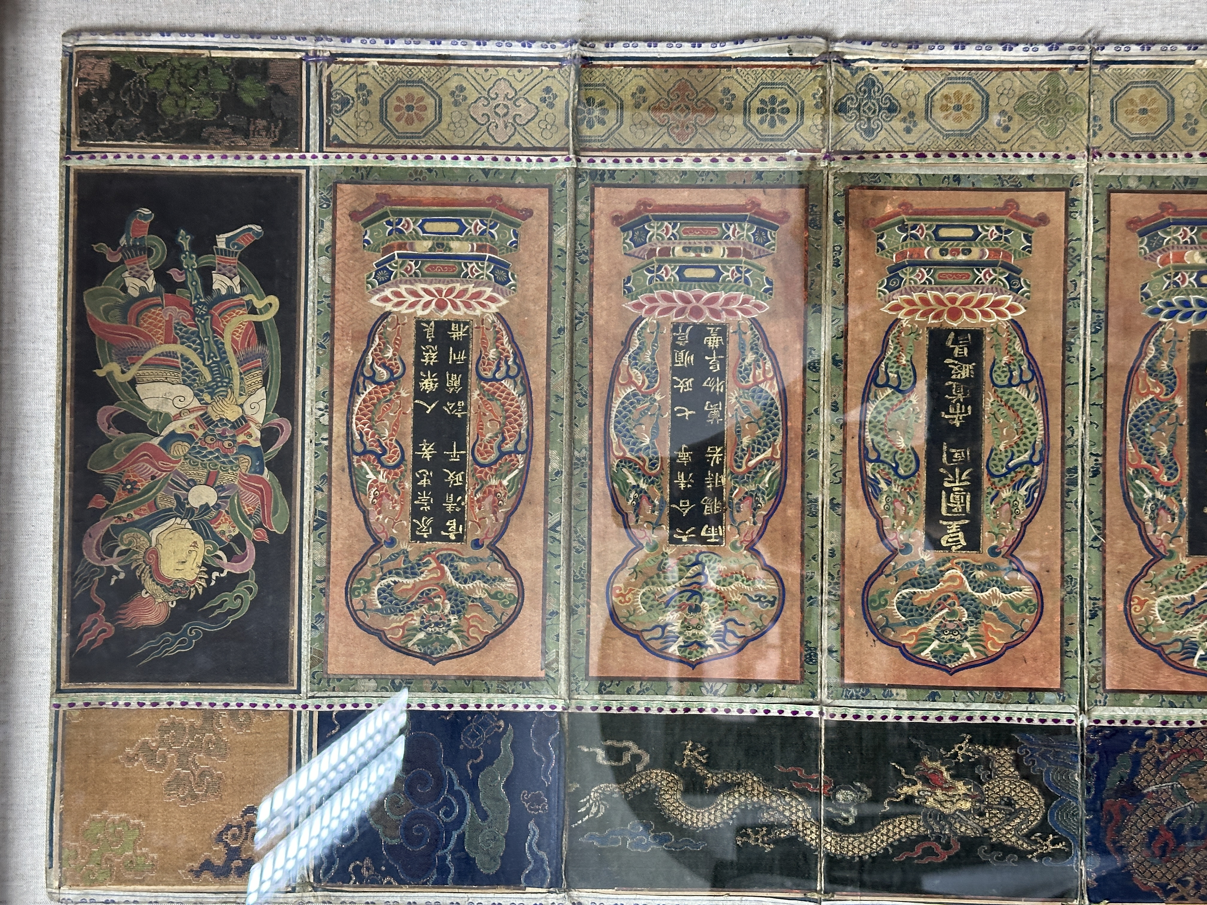 緙絲為上下邊框,內有七個經牌贊,兩邊重彩繪有韋陀、伽藍兩位護法。