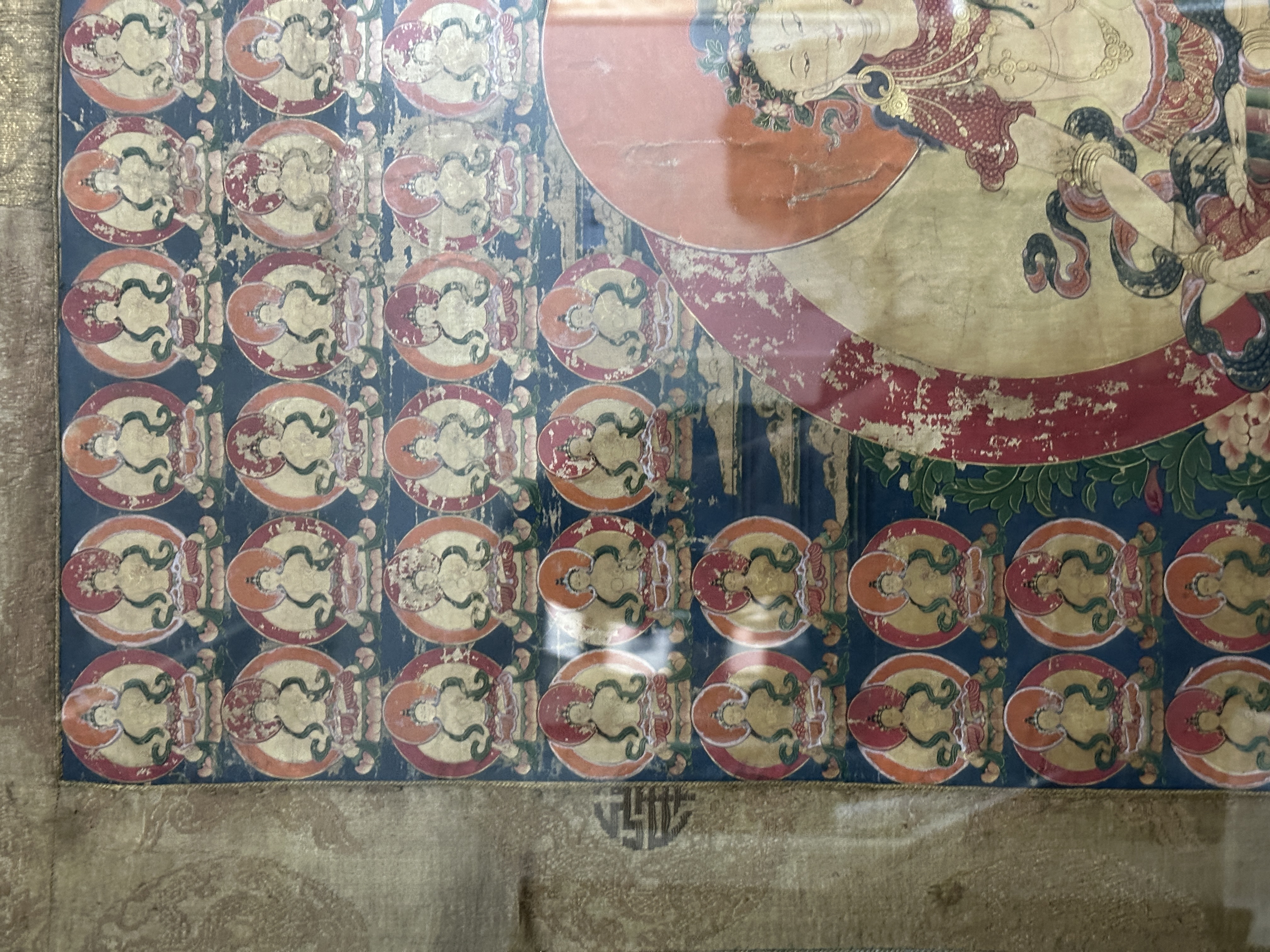 "白度母(WHITE TARA),藏音譯為卓瑪嘎爾姆,又稱增壽救度佛母,是觀世音菩薩的化身。觀世音有32種應化身,僅其中的度母化身就可以變化為 21位救度母,白度母即為聖救度佛母的二十一尊化身之一。在藏傳密教中,綠度母與白度母是二十一尊度母之中流傳最廣的。而藏密又常以長壽佛、白度母及尊勝佛母等三尊合稱為:「長壽三尊"",具有救度八難的威德,是能夠為一切眾生賜予長壽的一尊度母,許多信仰眾所知道的白度母是一位能夠為一切生壽的本尊,其實凡是這些,如果虔誠地修不止這些,如果虔誠地修不止這些,此幅唐卡構圖極為簡潔,除主尊外並未繪有其他人物。度母膚色潔白,晶瑩剔透,細腰豐乳,如妙齡少女;僅下半身著紅色衣裙,其餘部分均呈裸露。七隻慧眼個個如菊花瓣大小,這些眼象徵她能觀照一切眾生。月亮靠背,雙足金剛咖跌坐安住於蓮花月輪上,右手膝前手掌向外結施願印以示救助,左手當胸以三寶印撫烏巴拉花,左手拇指與無名指牽住白蓮花枝對著心間,花沿腕至耳共有三朵,一朵含苞,一朵半開,一朵全開,對佛足、法高、三尊四尊神韻。"