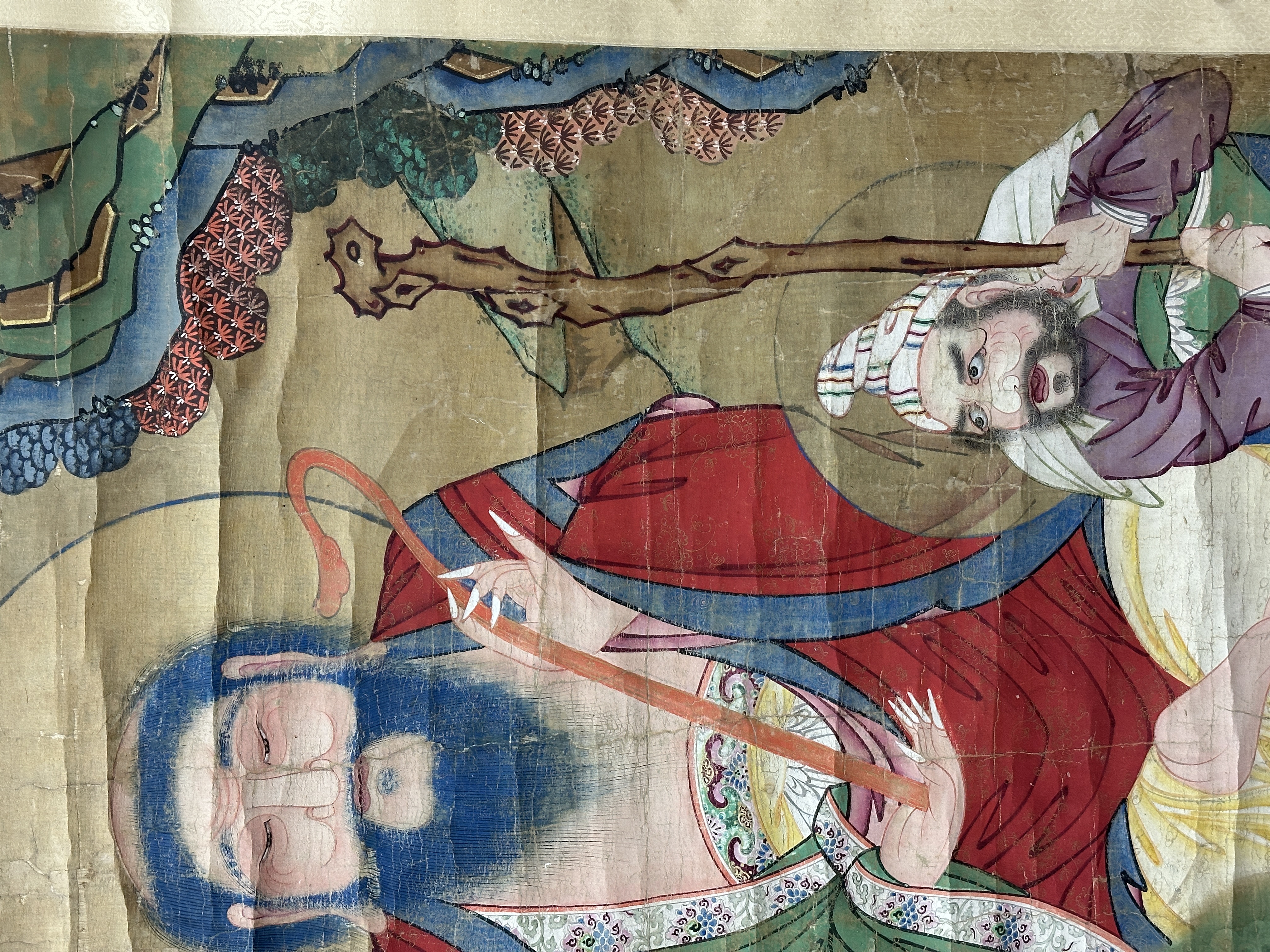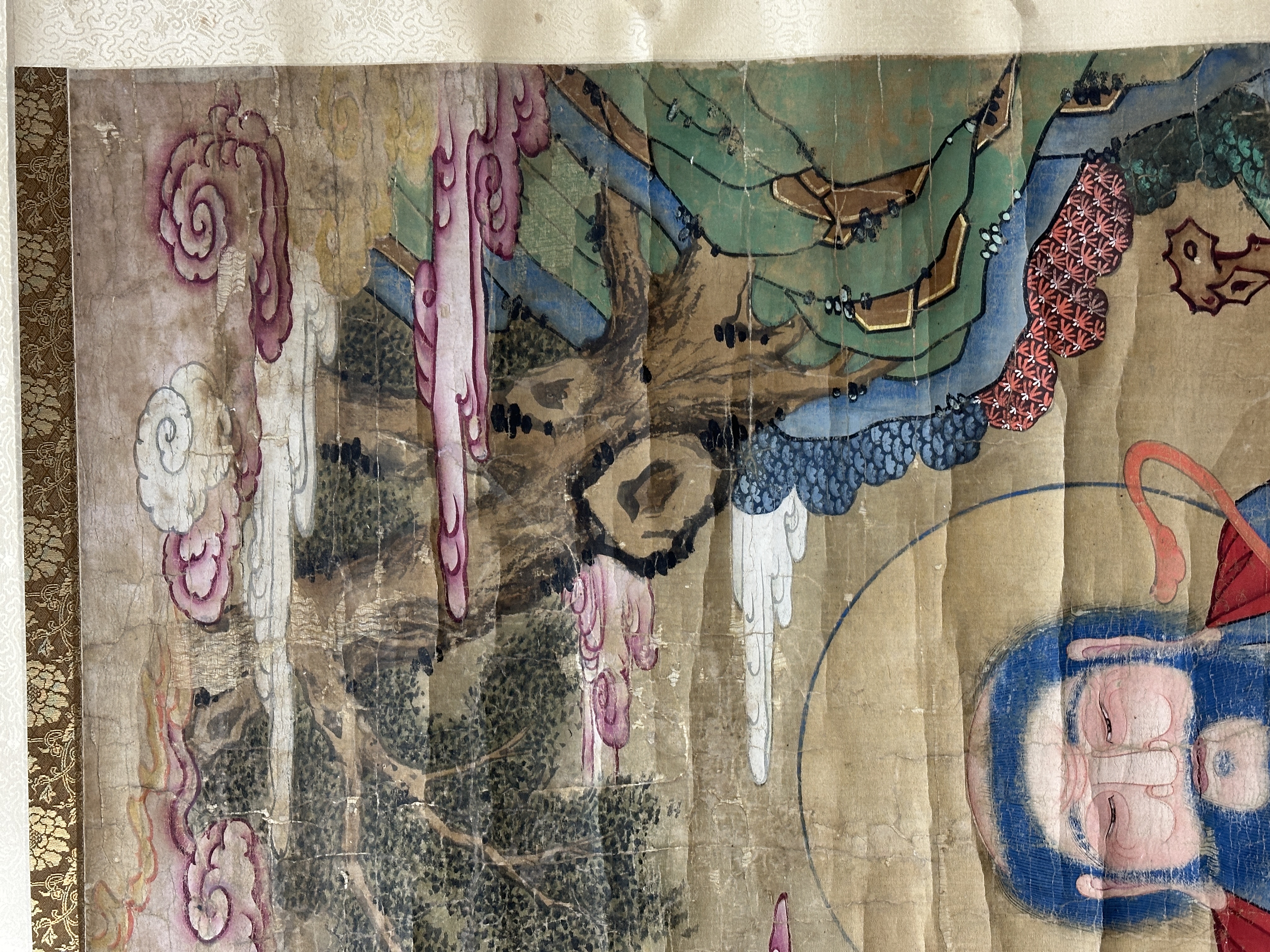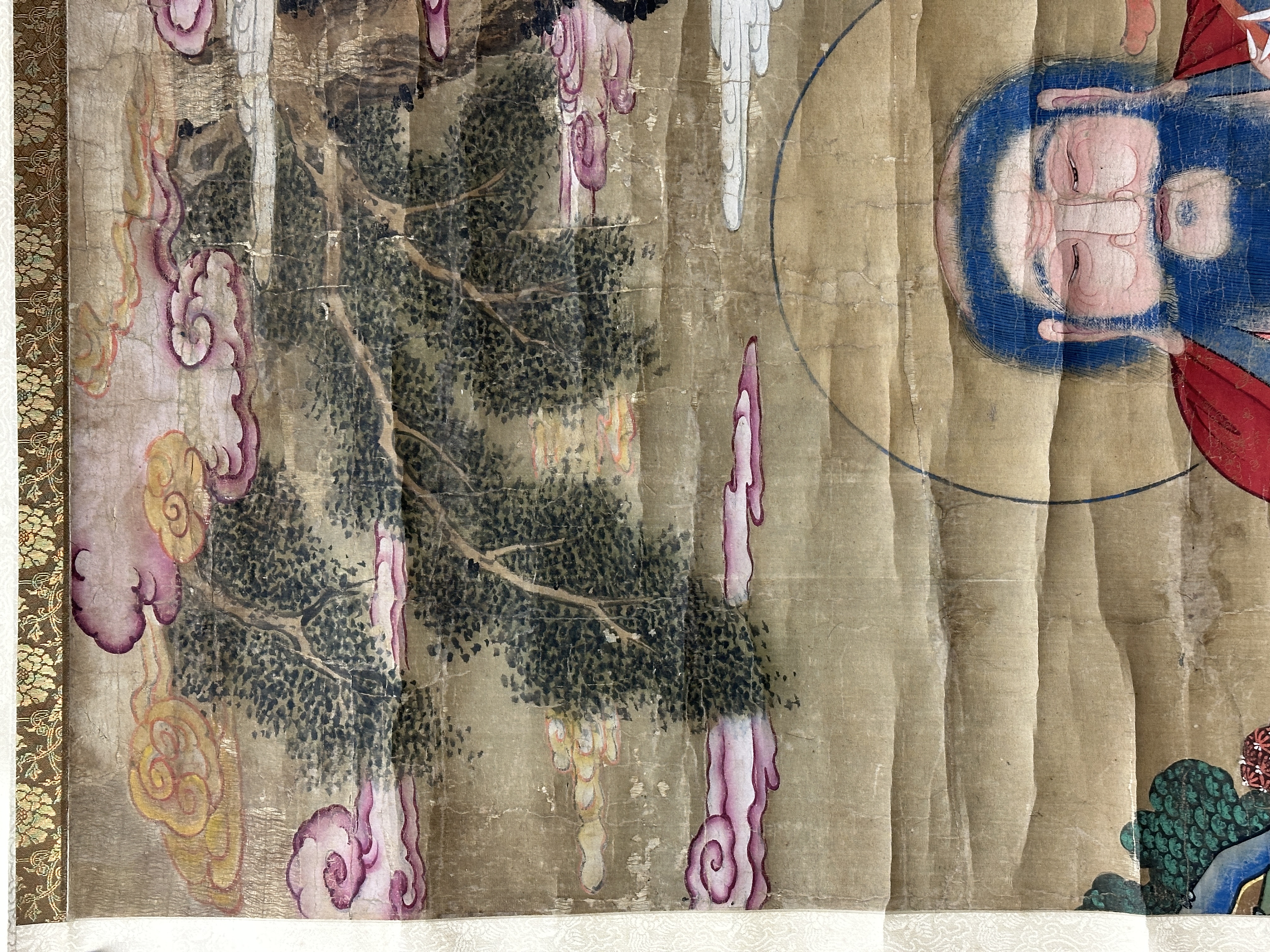 明代絹本重彩文殊菩薩像,絹本工筆,畫工精美,設色濃豔。畫面構圖完整,上方雲霧繚繞,下方山石花草點綴,人物形象生動。主尊文殊菩薩手持法器,雙目低垂,神態安詳。周圍有護法神和神獸青獅相伴,構圖嚴謹,色彩豔麗,保存完好。