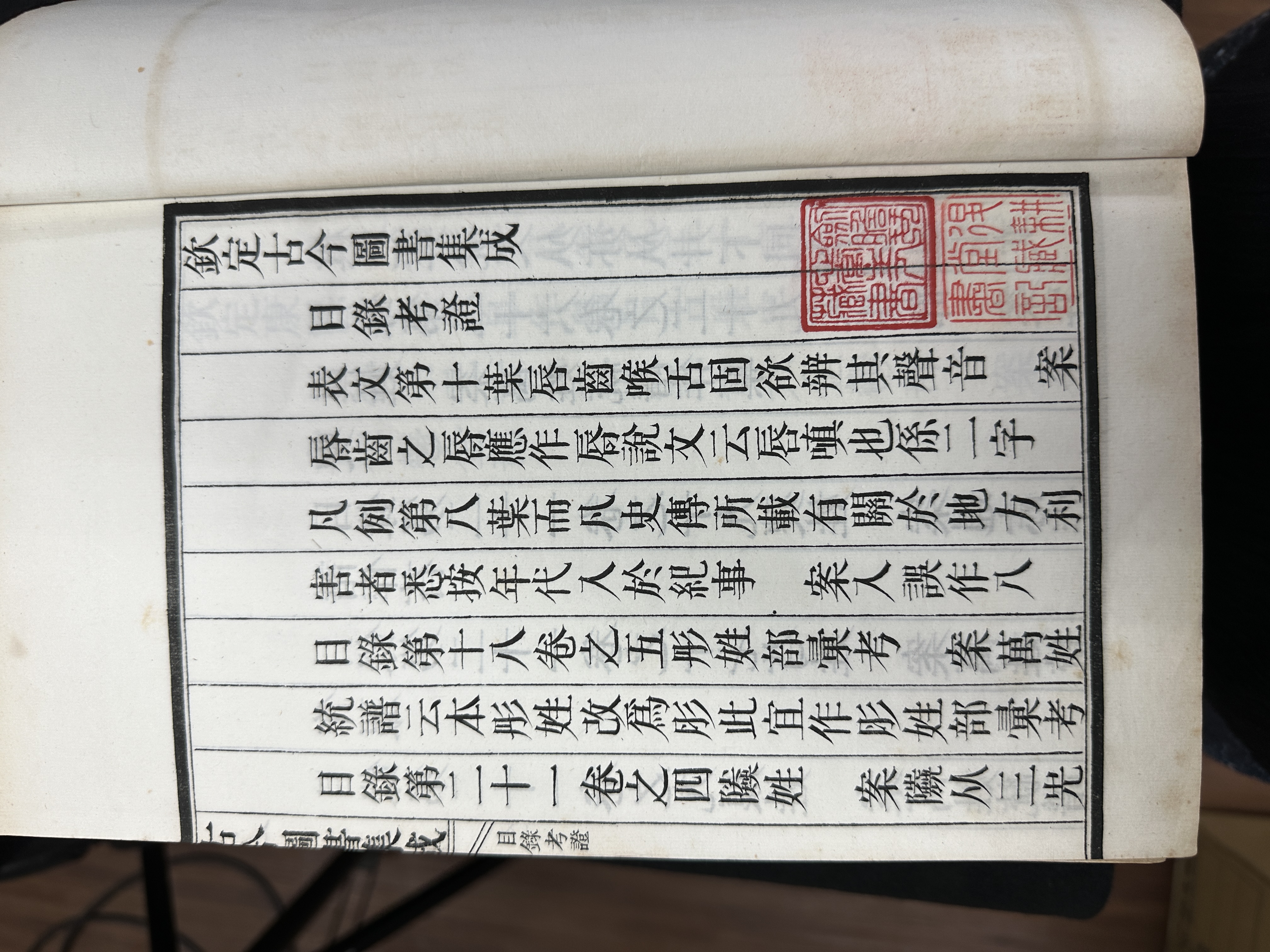 (清)光緒十六(1890)年上海同文書局據雍正銅活字版石印。白紙,線裝,二十四卷,4函24冊。(清)光緒十六年(1890),經光緒帝奏準,《古今圖書整合》再次以石版印製技術進行影印,同時增加《考證》二十四卷。由於工程繁浩,每部需銀三千五百餘兩,因此僅印100部。是書型、裝潢與雍正間銅活字印本完全一致。原函原套,保存完好,流傳稀少。龍繼棟,字松琴,廣西臨桂人。曾主講金陵尊經學院,著有《十三經廿四史地名韻編今釋》。《考證》對《古今圖書集成》中的舛、脫、衍字與錯簡、重複之處詳加校訂,又旁徵博引,或考證辨誤,或存疑備考,或補充內容,為《古今圖書集成》的早期研究著述。