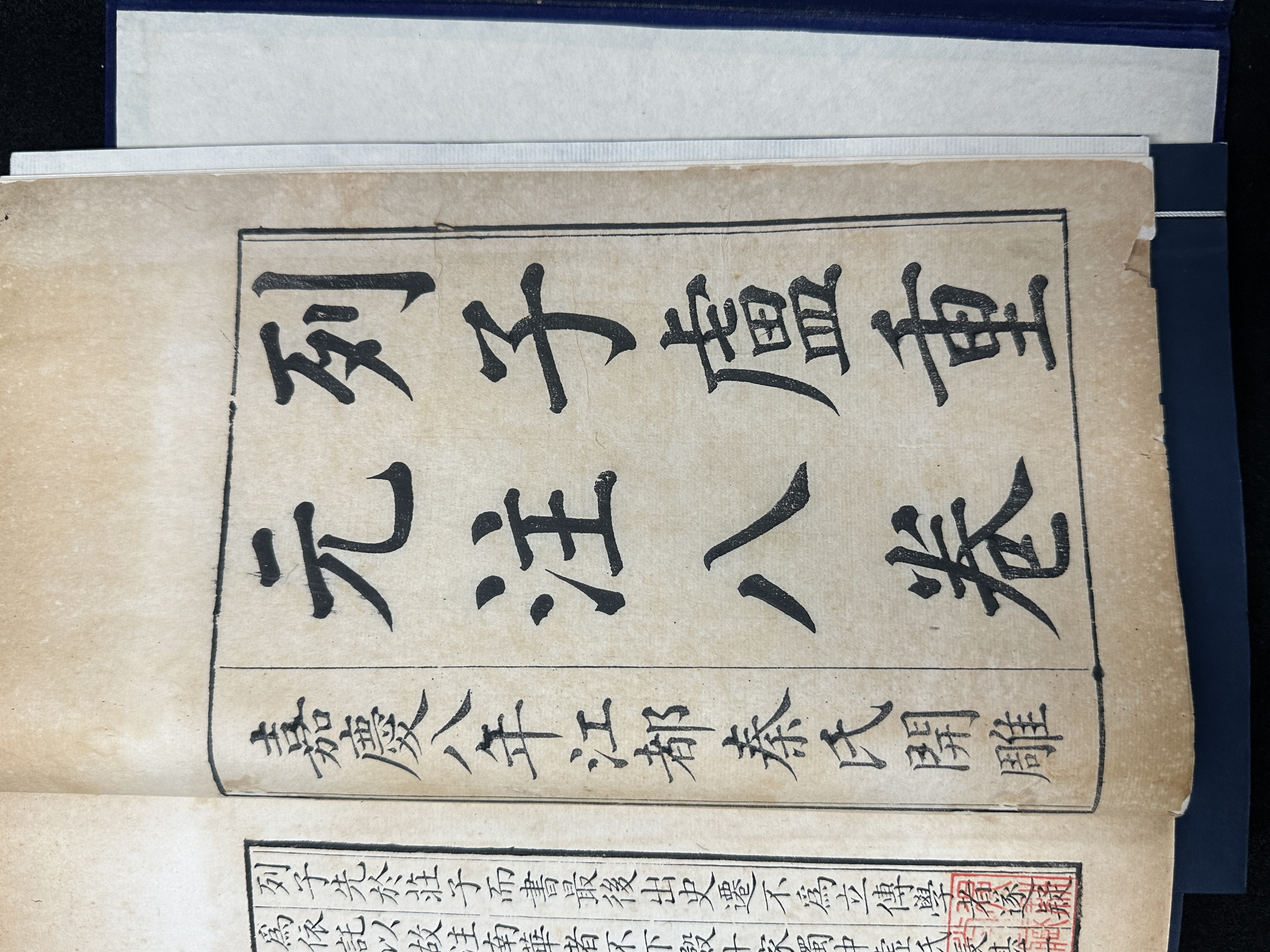 清嘉慶八年江都秦氏石研齋刊本。「石研齋」為清藏書家秦恩復之室名。《列子》是道家重要典籍,戰國鄭人列御寇所著,漢代奉為《沖虛真經》。此本《列子》題(唐)盧重元注。10行21字,小字雙行字同。白口、左右雙欄、黑單魚尾。書口上有卷數、中標頁數、下刻「石研齋」。書前附:首(清嘉慶)秦恩復序,次(唐)盧重元撰敘論,次盧注考證。全書共八卷,分為:天瑞、黃帝、周穆王、仲尼、湯問、力命、楊朱、說符共八篇,每篇均由多個寓言故事組成。每卷末題:「嘉慶八年癸亥夏四月甘泉吳漣寫,江都秦伯敦父校刊計XX葉」。秦恩復(1760-1843),字近光,號敦夫,室名石研齋,江蘇江都人。清代藏書家、文學家、校勘者。乾隆五十二年(1787)進士,改翰林院庶吉士。散館,授編修。讀書好古,尤精校勘,所刊之書時稱秦版。