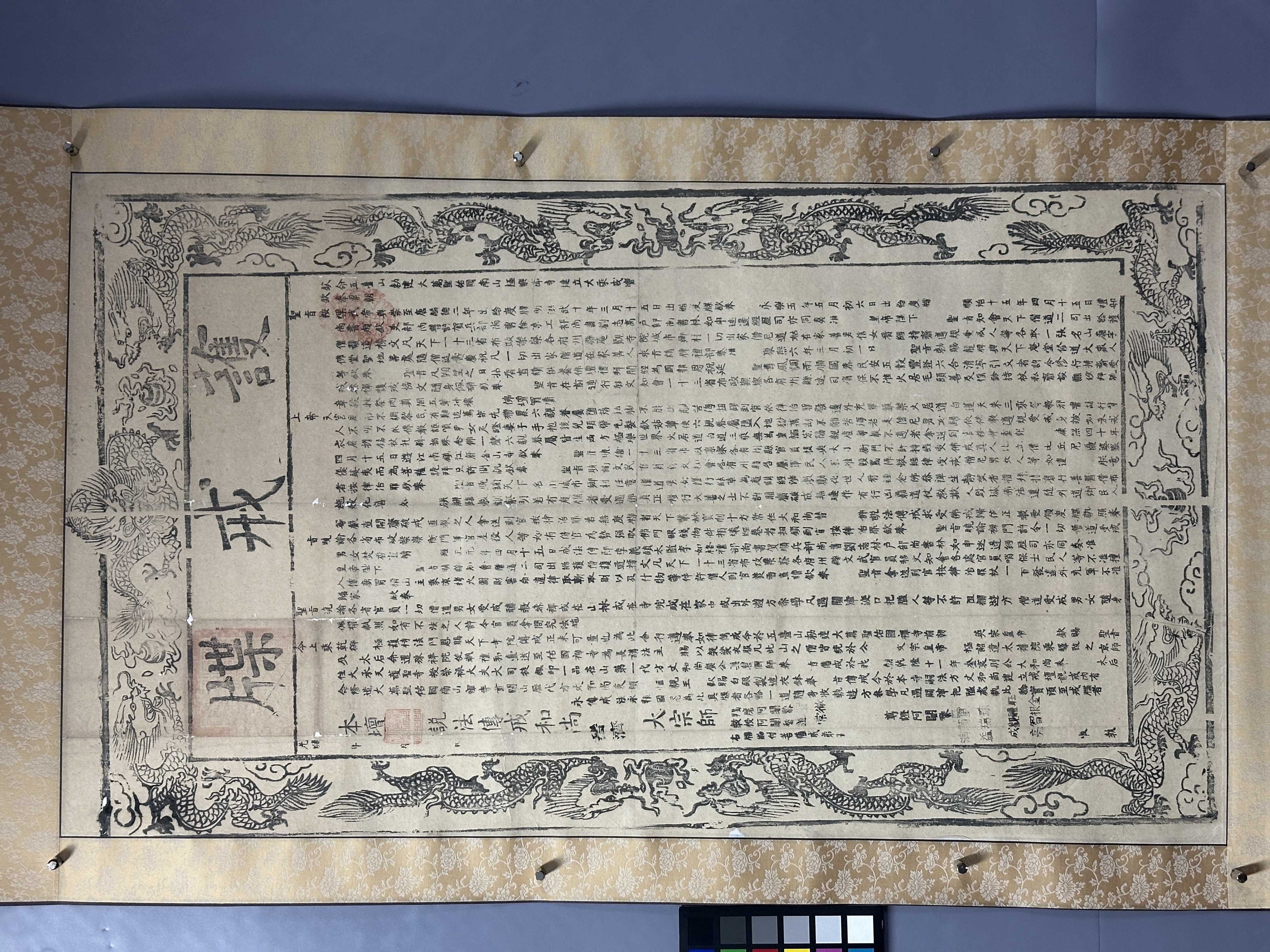 "《五臺山護戒牒》光緒年欽命五臺山敕建大萬聖佑國南山極樂禪寺建立大秉戒壇所發,上印八龍戲珠圖。五臺山作為文殊菩薩道場,既是明清律宗授戒法的重要法源地,也是律宗授戒法系活動的重要地域之一。此度牒尺寸巨大(650 × 1135mm),保存甚佳,且歷史意義厚重。此牒由普濟大宗師發給,更具意義。按清《大昭慶律寺志》卷八:「寺以律名,宗由律顯。持律說戒之宗師,名實兩符」;卷九「于中德行著聞,眾推登壇說戒者,即是宗師;能弘經闡法者,即是法師。若時逢廢寢,禪堂定有主者,名曰住持」。卷九「當知成化以前,宗師與住持合,成化而後,住持與宗師分」。因此,當時的宗師雖不一定是住持、方丈;但同樣的,開設戒壇的寺院住持或方丈,也不一定具有能發給護戒牒的宗師資格。護戒牒為戒律制度的正式憑證,為漢傳佛教中受戒(特別是三壇大戒)的重要標誌。而五臺山又是中國四大佛教名山之首,主尊文殊菩薩,道場地位崇高。清末法律對僧籍規範逐漸嚴格,憑護戒牒可證明為正信佛門弟子,方便通行。本牒文中更有:「欽奉聖旨曉諭各省官員…凡遇關津渡口,把隘人等不許阻攔」"