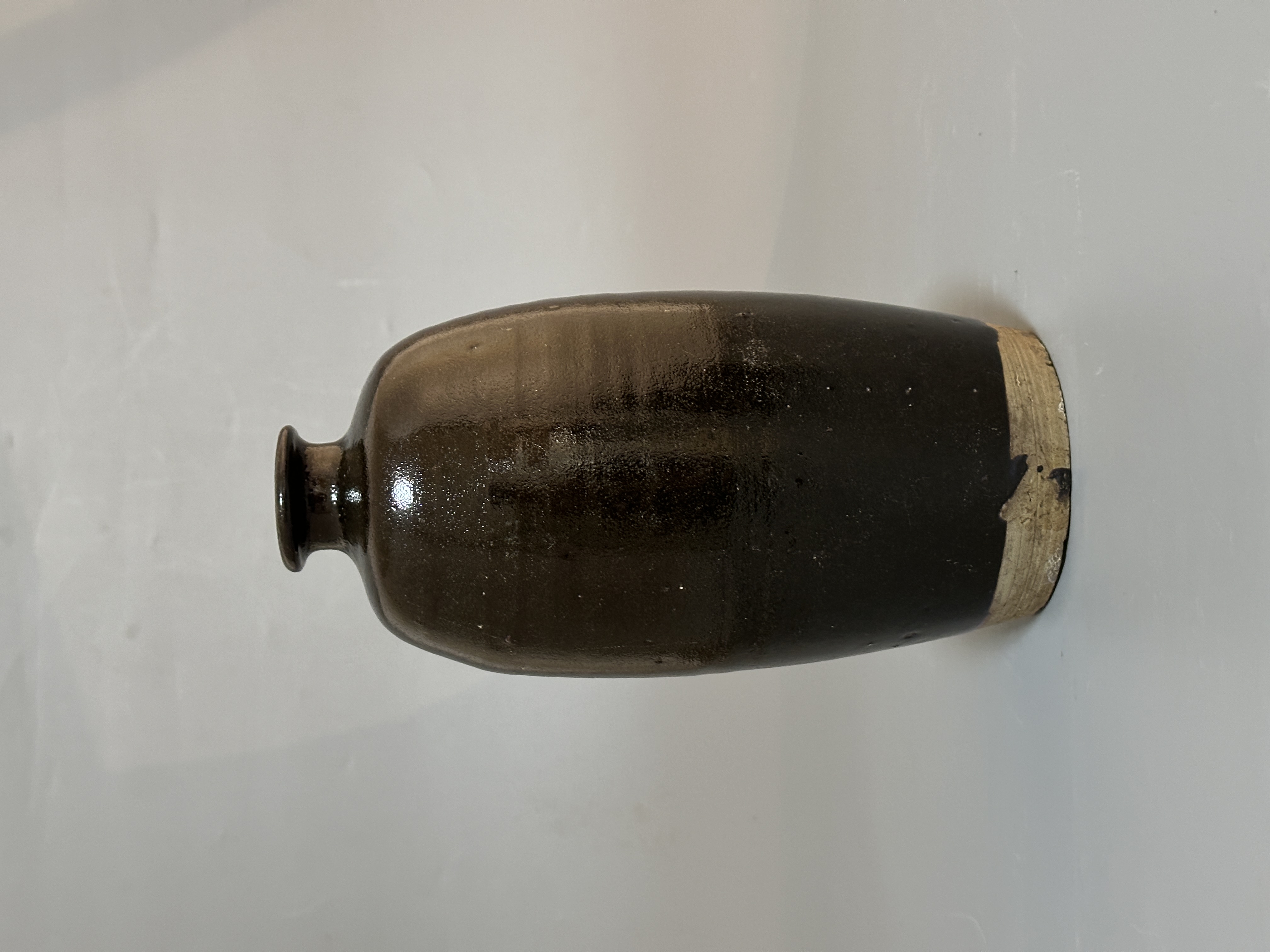 此件梅瓶造型挺拔秀頎,為經典小口梅瓶制式。唇口微撇,短頸豐肩,腹部向下漸收,線條流暢而富有張力,器形飽滿穩重。通體施醬釉,釉色勻淨深沉,呈赭褐色,釉麪肥潤,光澤柔和內斂,展現出單色釉純淨古樸之美。足底露胎,胎質堅實,可見淘洗細膩,火石紅自然。