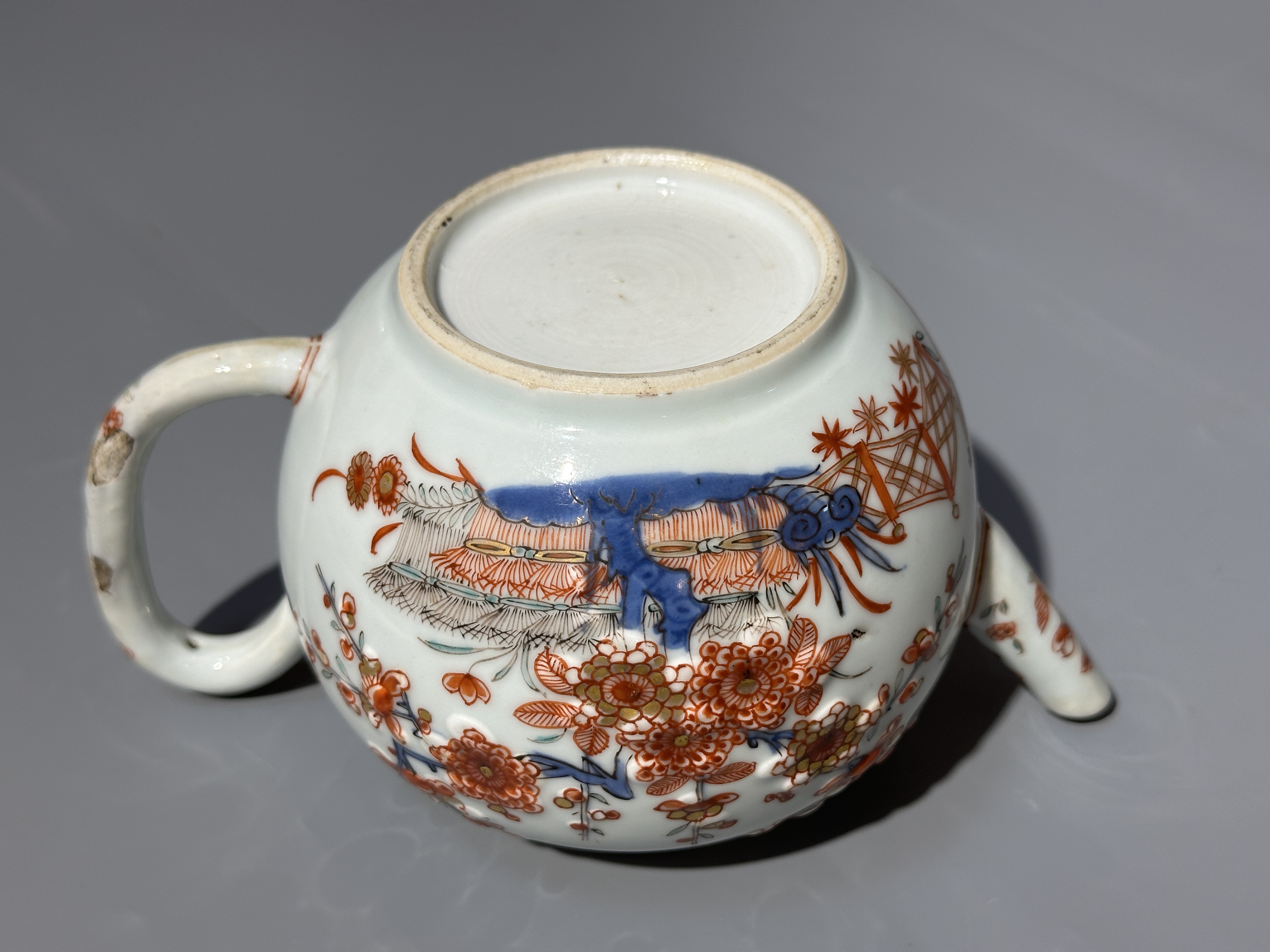 此件清康熙五彩描金茶壺,器形飽滿端莊,為康熙朝茶具之精品。壺身以瑩潤白釉為地,其上以礬紅、青綠、嬌黃、紫黑等諸彩繪就纏枝花卉紋樣,筆觸精細,設色明麗,枝葉翻轉自然,頗具文人畫意。所繪紋飾部分更以真金勾勒點綴,金彩璀璨,與五彩相互輝映,盡顯華貴雍容之氣。壺流與執曲線條流暢,與圓融壺體銜接自然,蓋鈕小巧精緻,整體制作工藝精湛,儲存狀態良好。