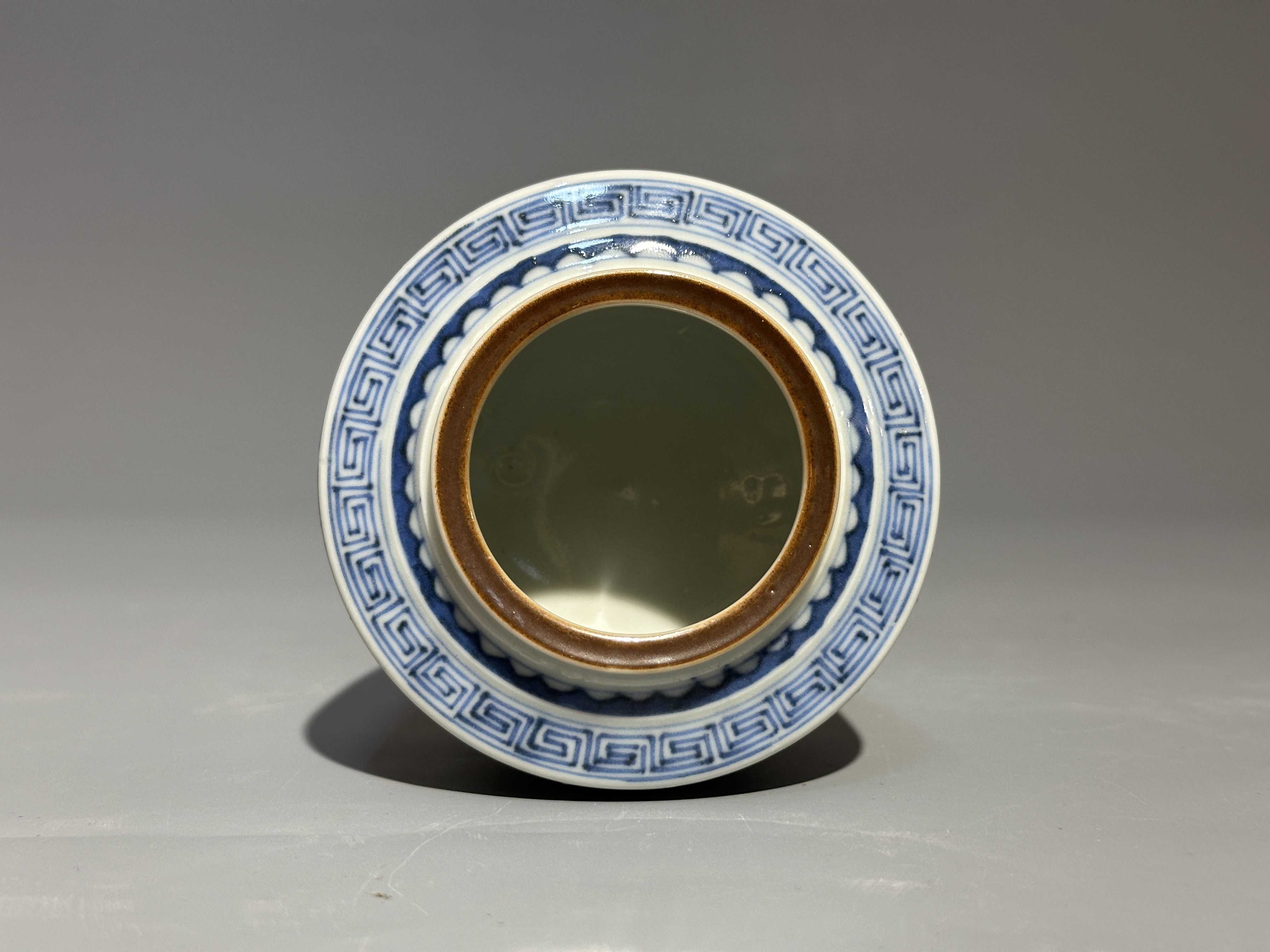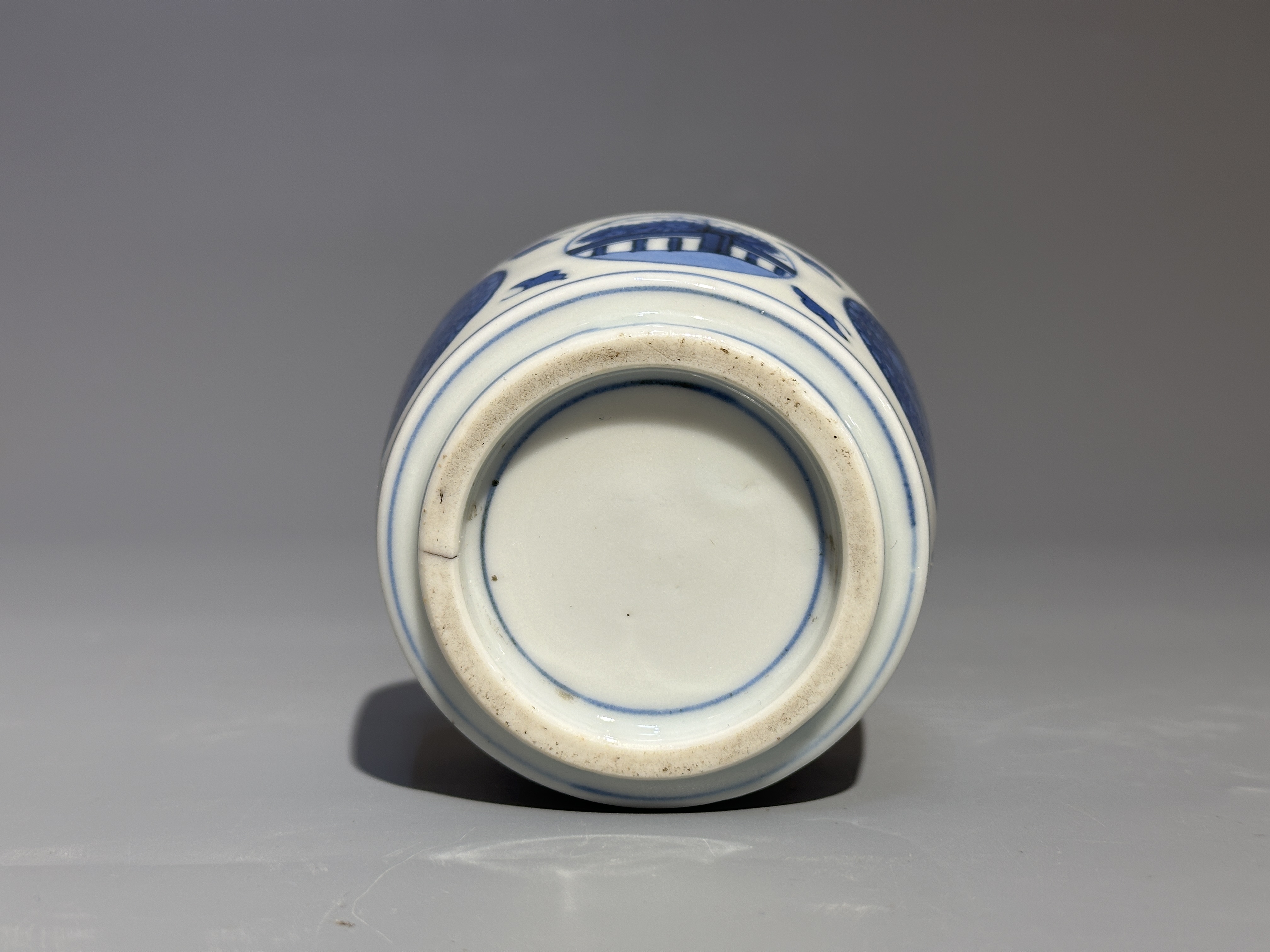 此罐造型敦實飽滿,豐肩斂腹,廓線圓潤,為明清之際經典罐式。通體施白釉,釉質瑩潤。外壁以青花為飾,自上而下分繪回紋、如意雲頭紋等規整邊飾。腹部主體作菱形開光,內以青花繪山水人物圖景:遠山層疊,流水潺潺,樹木掩映,高士徜徉其間,筆意疏朗灑脫,意境清逸。開光外輔以團花紋樣,佈局嚴謹。