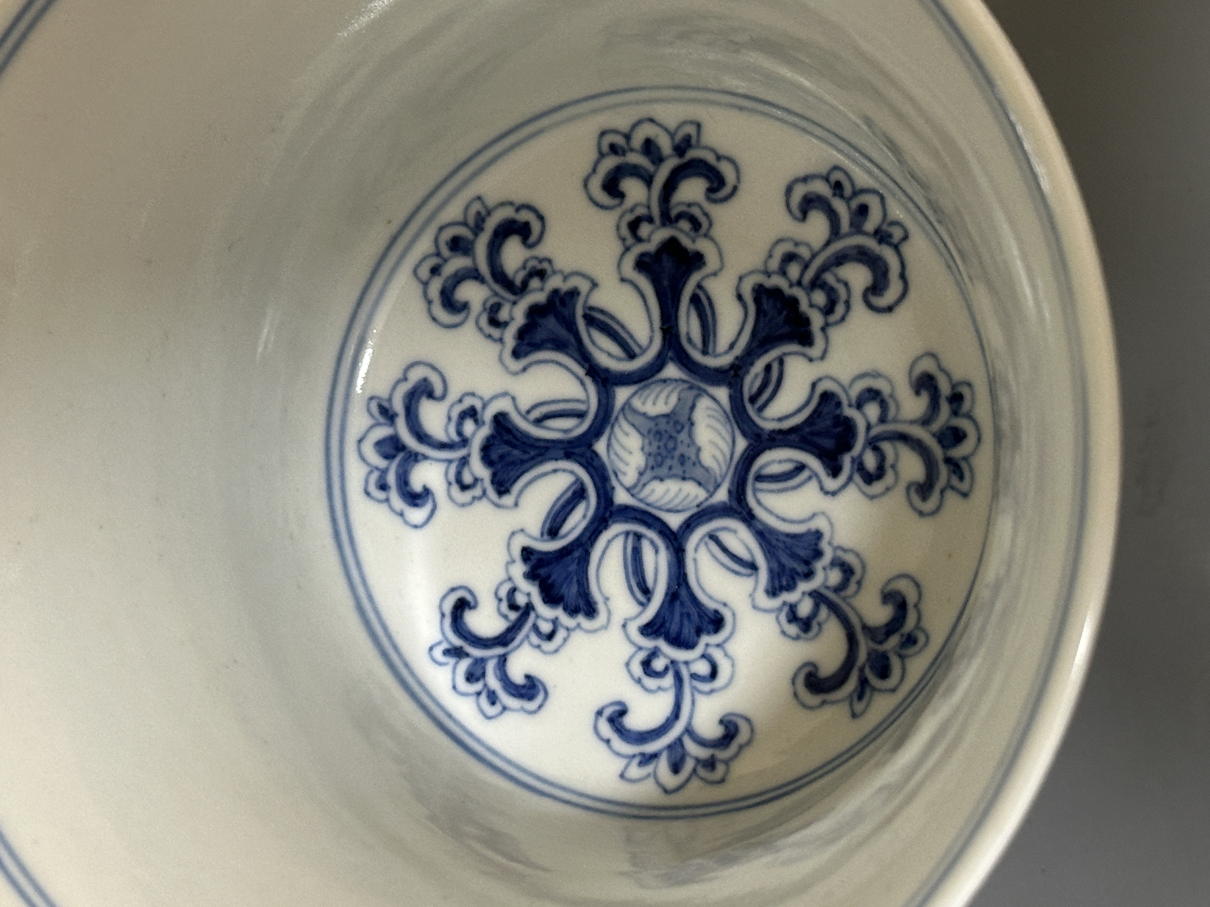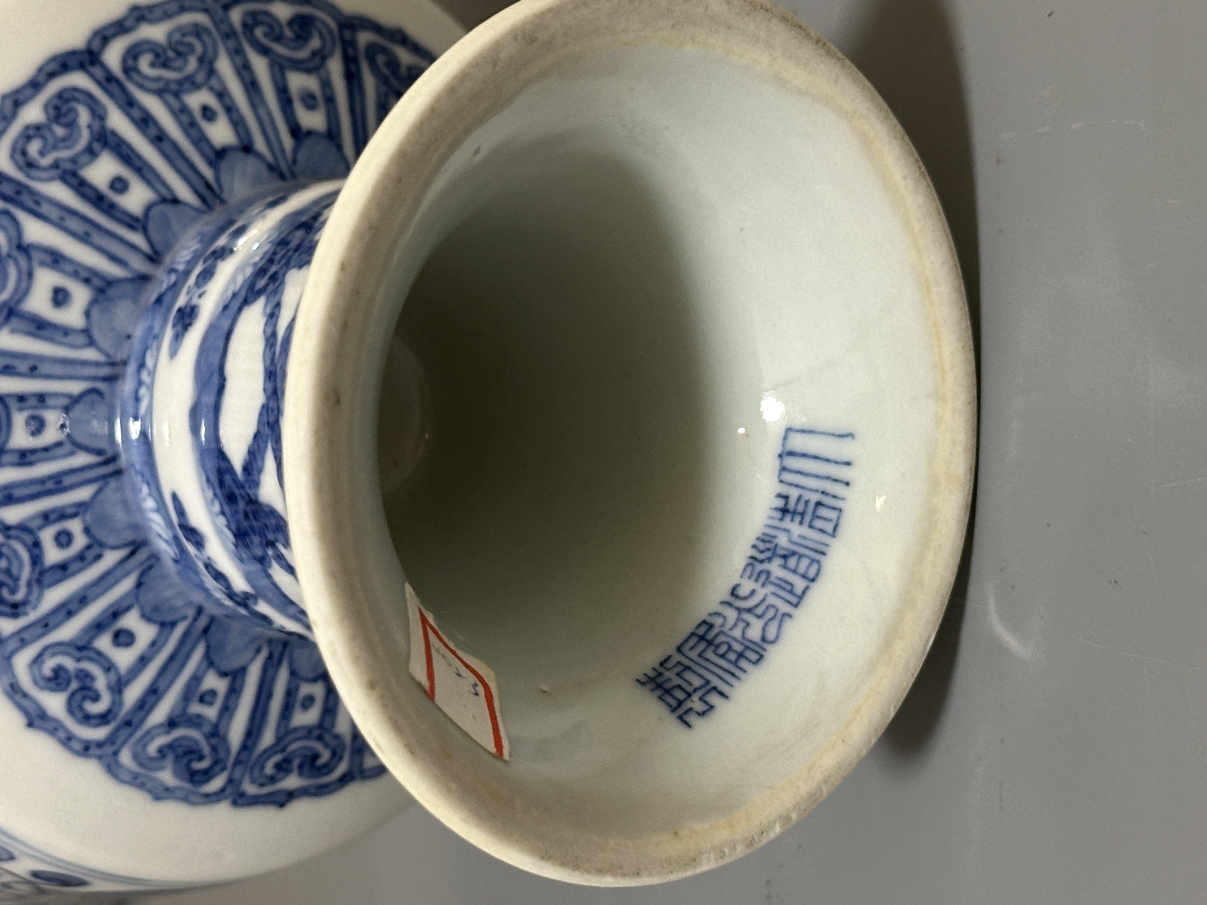 本品為道光禦窯仿宣窯制式,造型雋雅,高足挺拔,器型規整。外壁以青花繪纏枝蓮紋,蓮瓣豐腴飽滿,間飾梵文箴言。內壁底心繪團花如意紋。足脛處飾瓔珞紋,底落 “大清道光年制”書橫款。