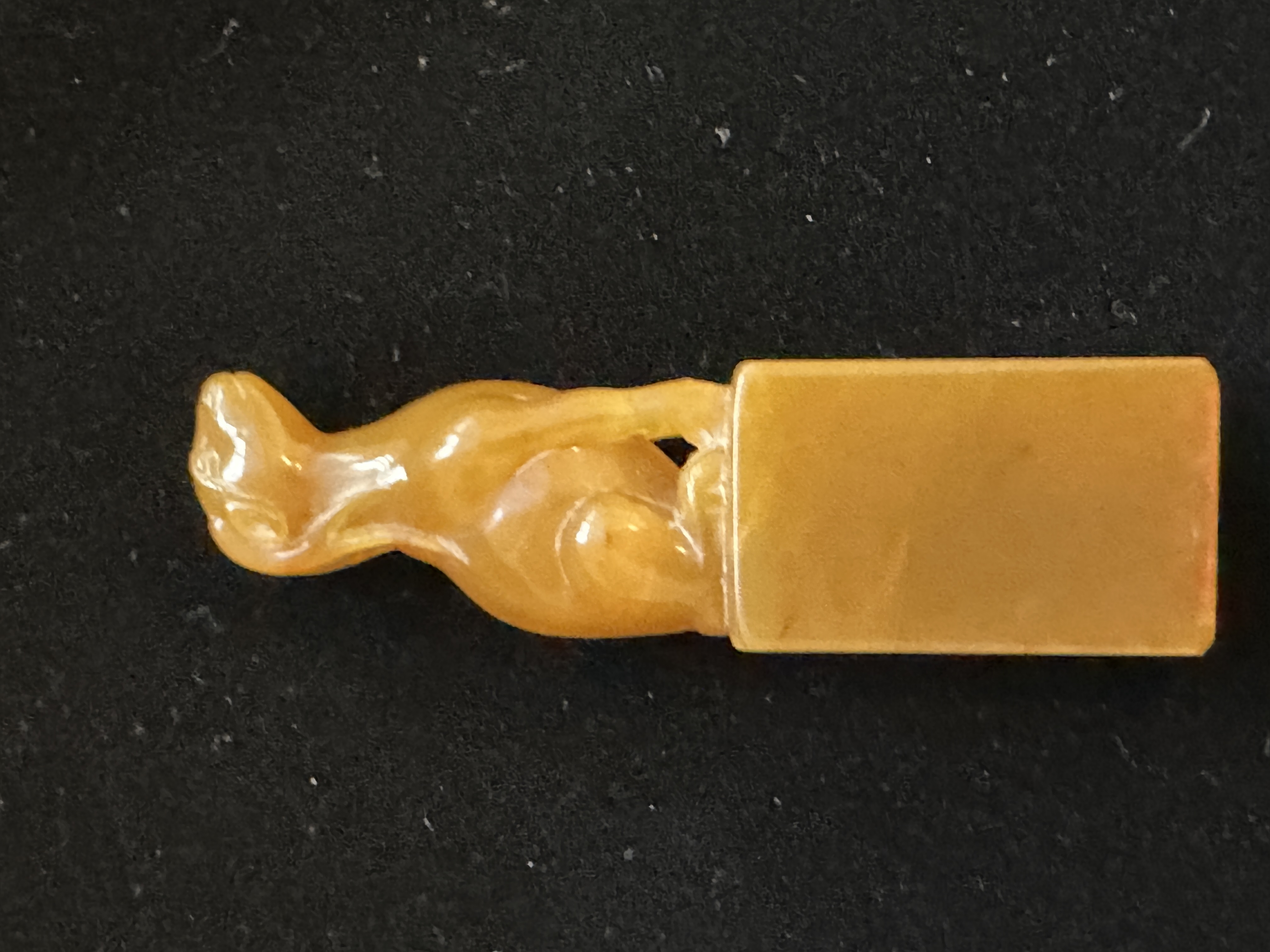 這五顆巴林石章料展現葉蠟石典型細膩凝脂質地,以黃色為主調並局部帶紅或獸形雕飾,產自內蒙古巴林右旗,硬度適中透明度高,非常適合篆刻印章。 第一顆為細長斜柱形,淺黃基底上端紅色浸染似辰砂脈,綿軟光潤適小型印紐;第二顆極細黃柱,純黃蠟潤無紋,屬黃凍類理想精細雕琢;第三顆矮方柱,淺黃平滑細膩適合印面原料。 第四顆蹲坐狗形鈕,通黃雕狗頭身尾翹活潑,寓吉祥鎮宅,印面刻有「守拙」;第五顆高柱獅鈕,黃色獅頭鬃毛捲曲蹲姿威猛,象徵百獸之王石質油亮適高鈕章。